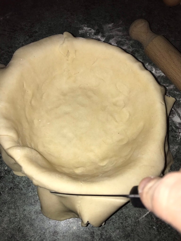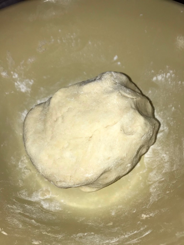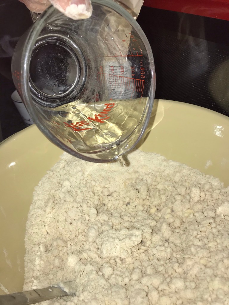 Then poured in the water slowly while using a knife to mix it, until I could use my hands to form the dough in to a smooth ball. So I had managed to successfully make the pastry, and left it in the fridge in clingfilm over night.