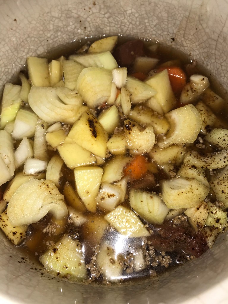 After I had made the pastry, I prepped the rest of the ingredients. Just things I already had in my fridge and freezer. I used some stewing steak and some steak thins I had in the freezer, and potatoes, carrots and onions that I already had in the fridge. I put it all the crock pot and used a couple of stock cubes and poured water in till it just reached the top of the ingredients.
