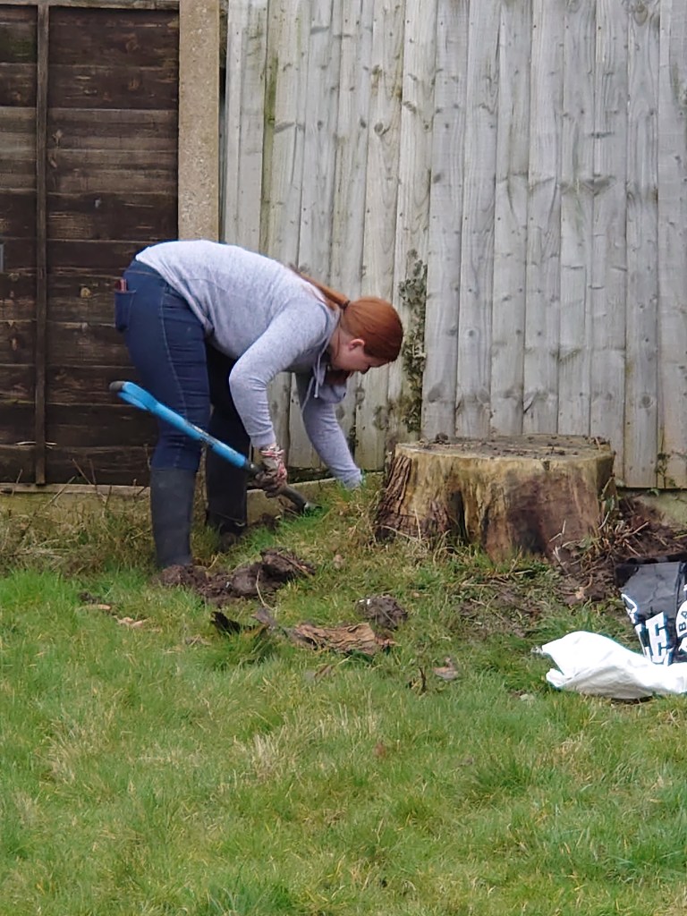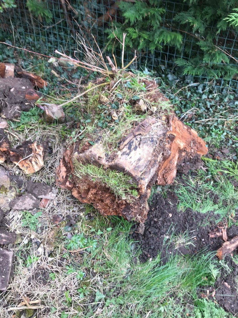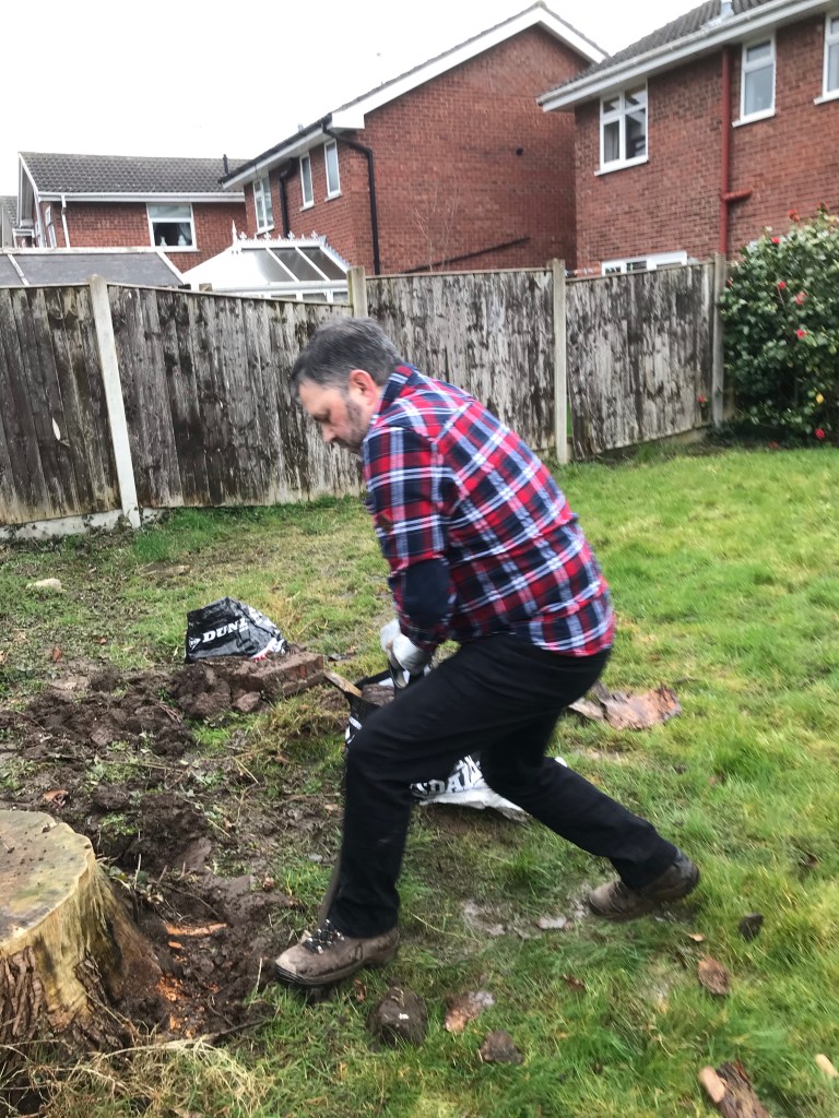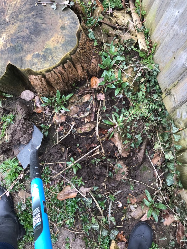 Luckily the smaller stump was rotten and we (but mainly Tony) dug round it chipping away at the root with his spade. The ground on this side of the garden wasn’t as sloppy and made for easier working.