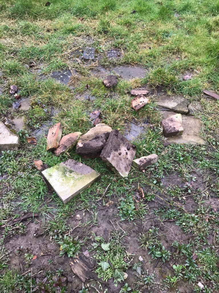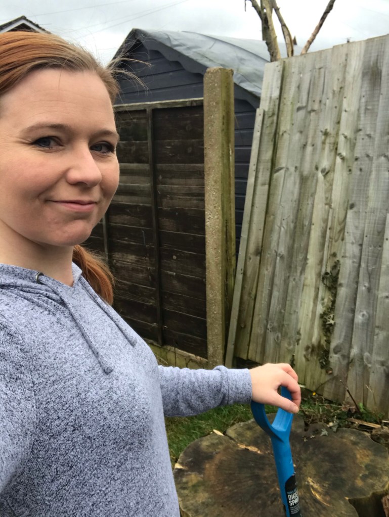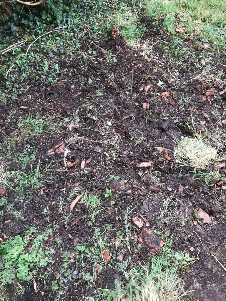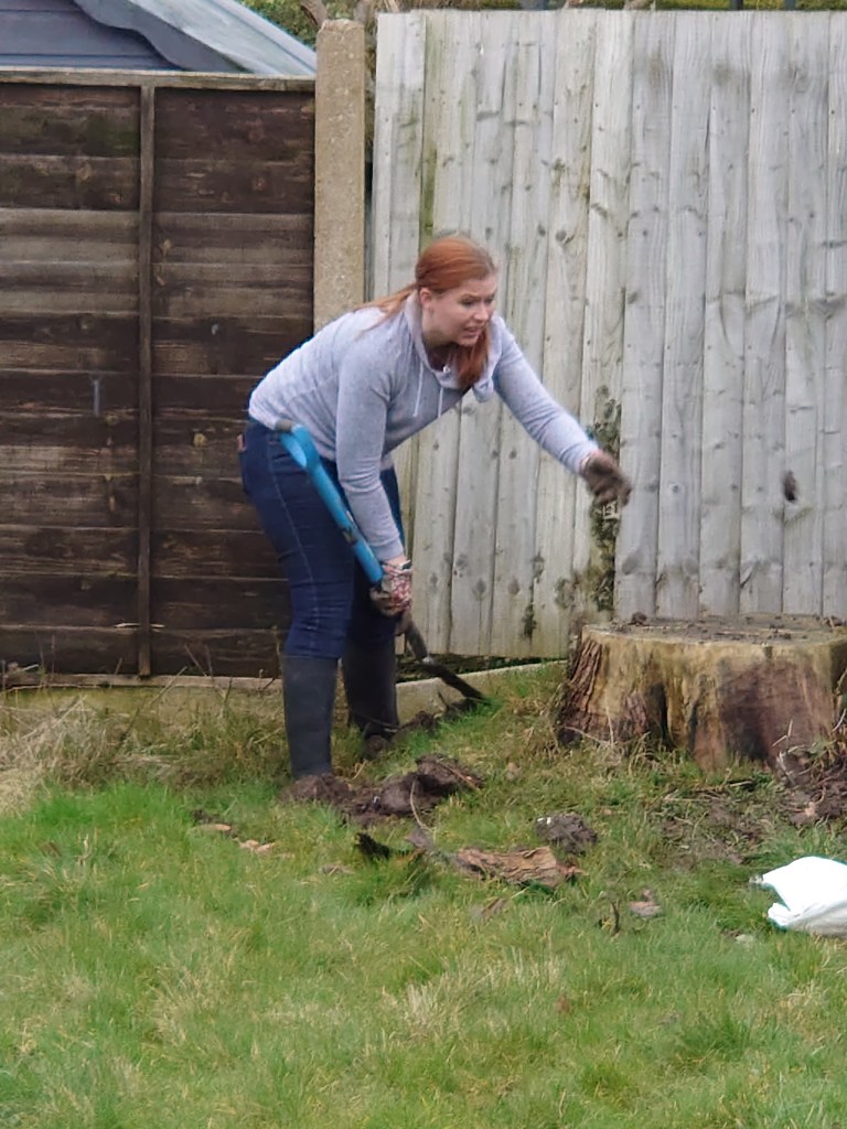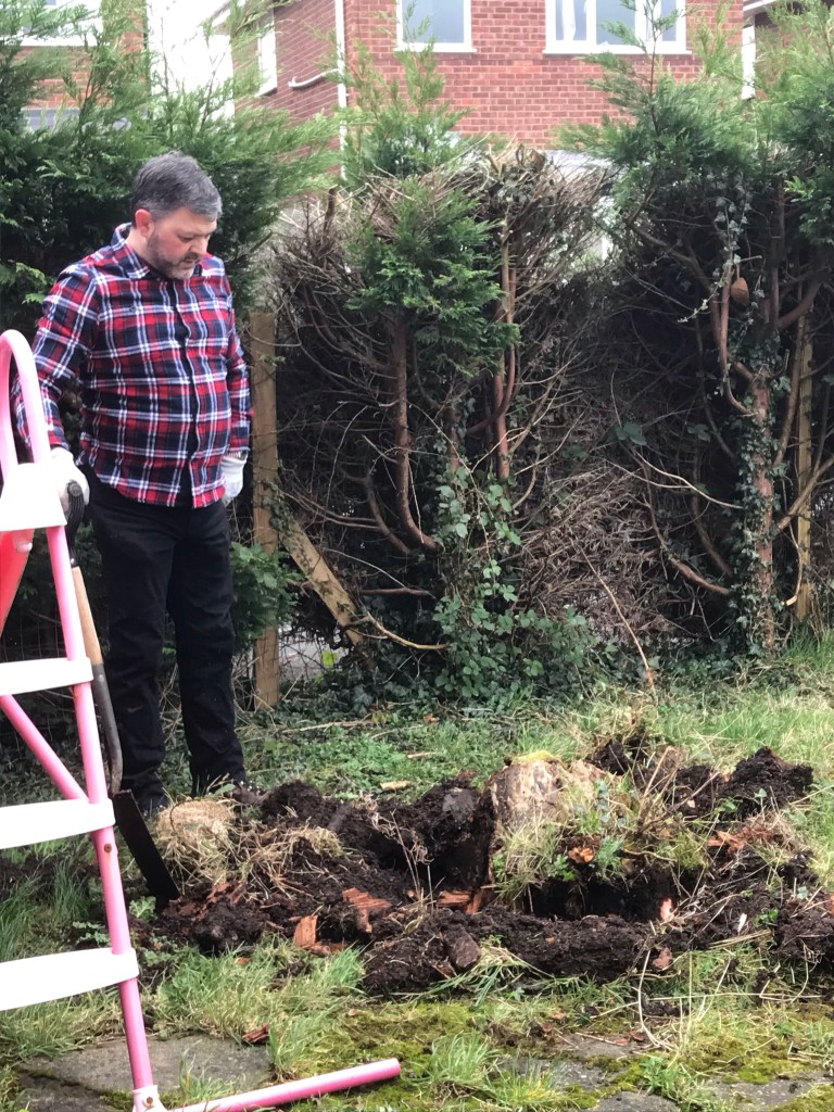 Luckily the smaller stump was rotten and we (but mainly Tony) dug round it chipping away at the root with his spade. The ground on this side of the garden wasn’t as sloppy and made for easier working.