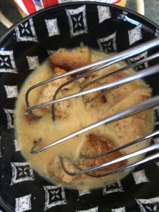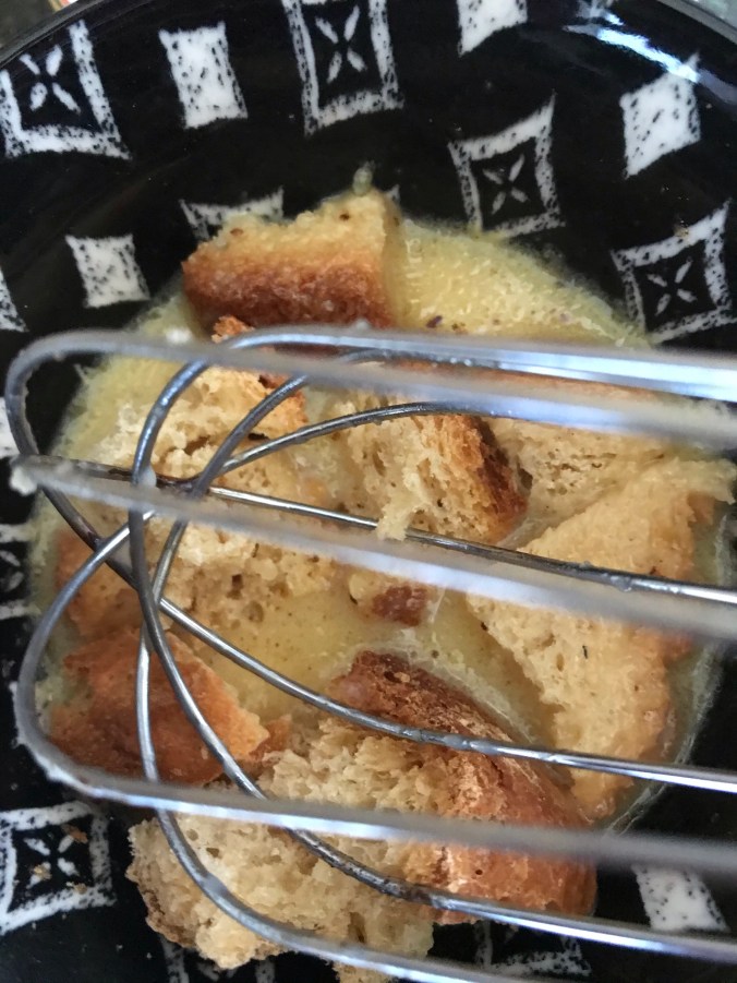 Then I pushed the chunks of bread into the mixture, making sure all the chunks were coated.