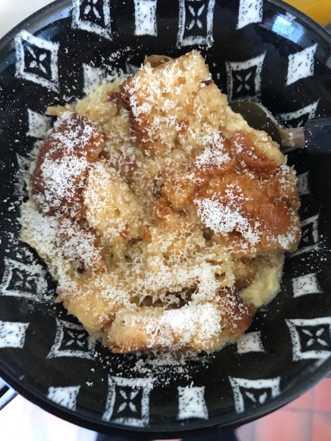Afterwards I sprinkled on some icing sugar and Voila …. delicious snack/breakfast using left overs and essentials.