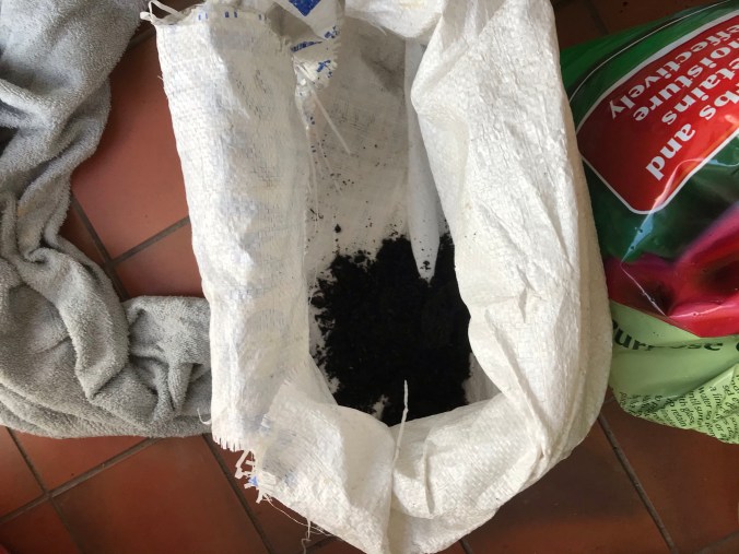 Lastly today we planted some potatoes. I found some sacks in the garage, with one I tried to modify it to gain better access to the potatoes once they have grown. The other I just left unaltered as I wasn’t sure the other one would work out. We put a layer of compost on the bottom of the sack then put the potatoes in. The potatoes we used had been left to seed for a few months until they were good and sprouted. We covered them over with another layer of compost, and watered them. We will keep checking on them and when they start sprouting up they will be covered over with more compost, that process will be repeated until the sack is nearly full. Then they should hopefully grow leaves. Once the leaves turn yellow the potatoes should be ready to harvest.