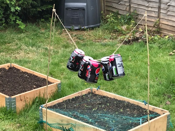 I went out into the garden today to have a look at what we had already started growing and to start sowing the rest of the seeds. I found the birds had started to scratch and peck in the raised beds and a lot of the peppers were ruined. Luckily I had spare pepper seedlings that I could replace them with. So I made a bird scarer and covered everything with netting. Not sure if the Pepsi cans will do much good, but we’ll give it a go.