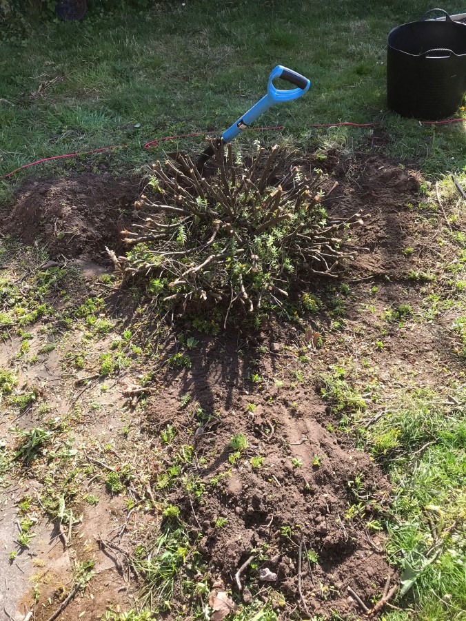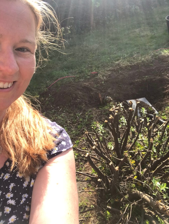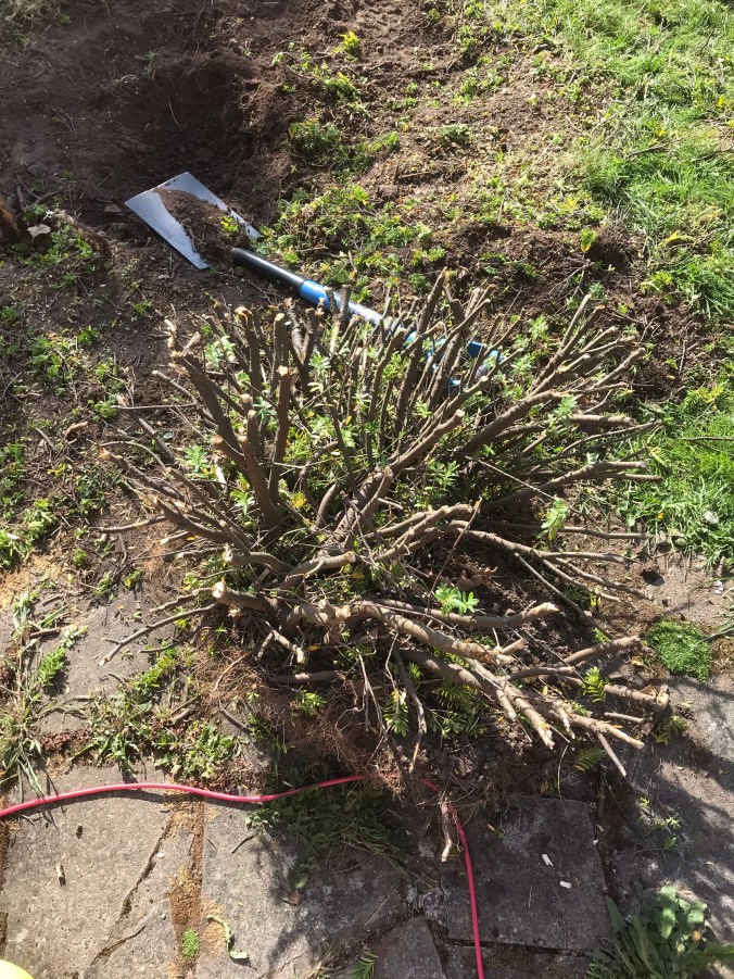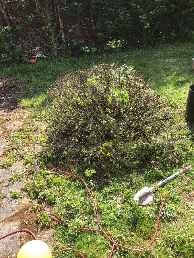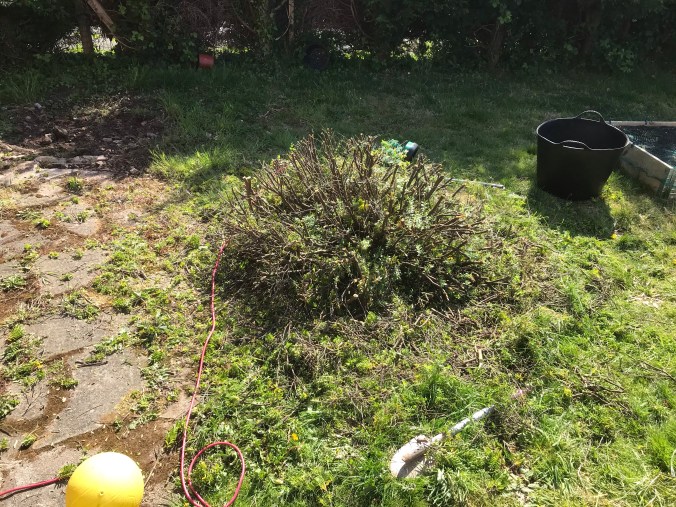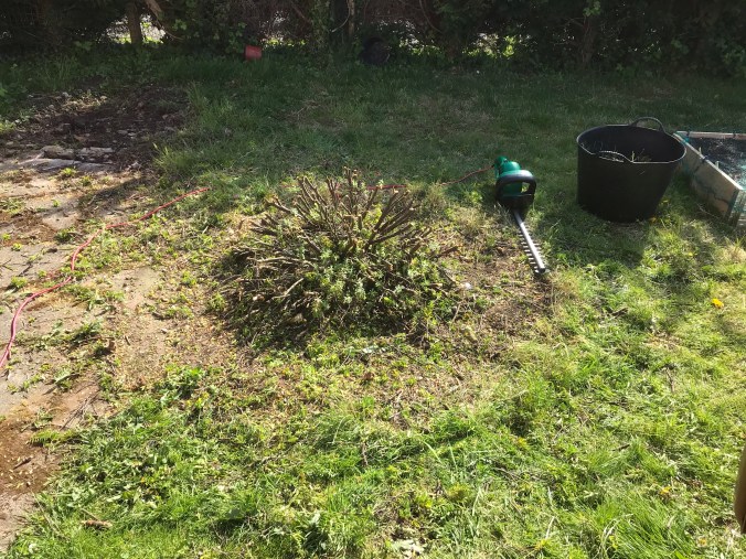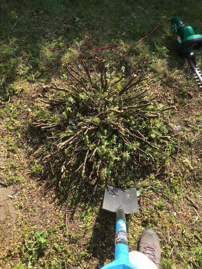 I decided to get the hedge cutters out with the purpose of trimming back the Camellia bush, but decided to attack the weird bush/ over grown weed that I really hate instead. So what started as a little trim to cut it back, ended up as a full blown excavation, it had to go! I never did get round to the camellia bush.