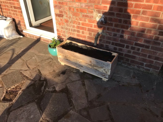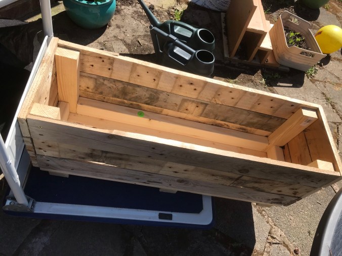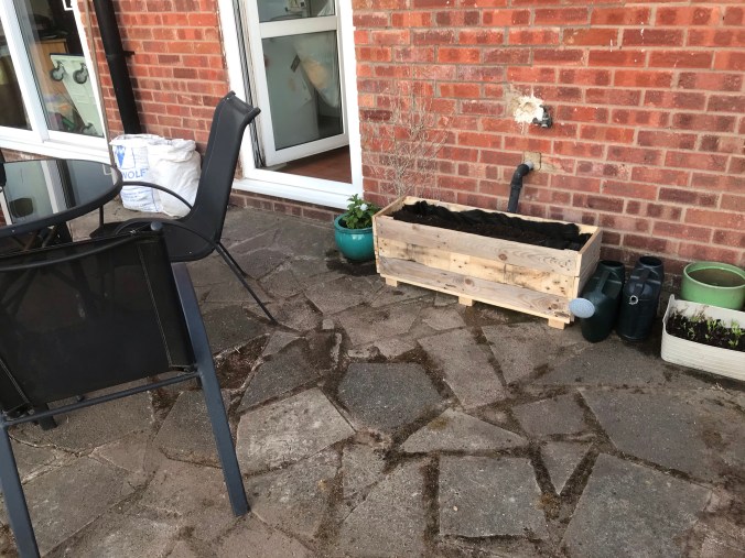 Tony made a great planter out of the pallet that the compost came on. So we put it outside the back door, its going to look brilliant once we fill it with different herbs. I had to tidy up the out door area first though and get all the weeds out from between the flags. All I had that I could use was an old wallpaper scraper. It did the job, but today I am really aching!