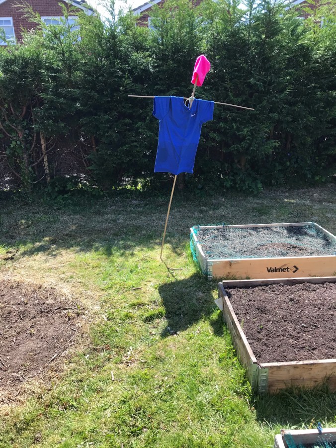 As I mentioned before about the birds, they do like to peck, dig, eat and generally destroy what we’ve planted, we did put some netting over some of the raised beds, but I decided a scarecrow might work to deter them from the garden. It did work for a few days, but they have gotten brave again. There are definitely less than there were though. So here is my not much effort scarecrow.