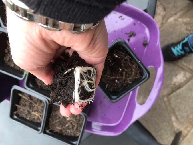 The roots were starting to appear out of the bottom of the seed tray so thought it time to give them a bit more room to grow, but it is still a bit to early to plant them out. So not wanting to risk killing them off I popped them in some pots.