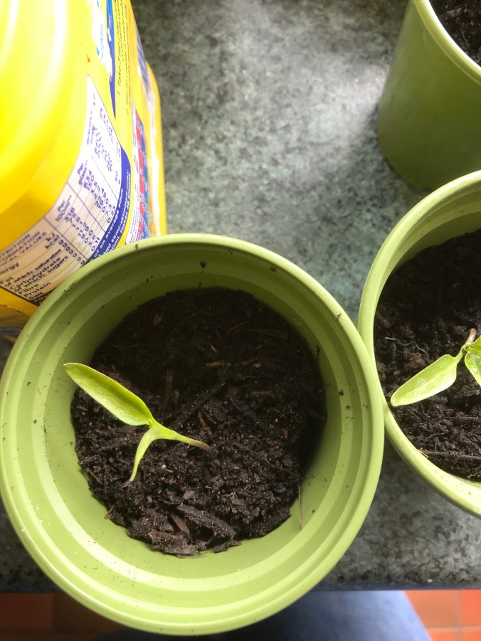 Using some pots I had already filled with compost, I added some powdered egg shells and some tea leaves (which we always keep), and carefully transplanted the seedlings into the bigger pots.