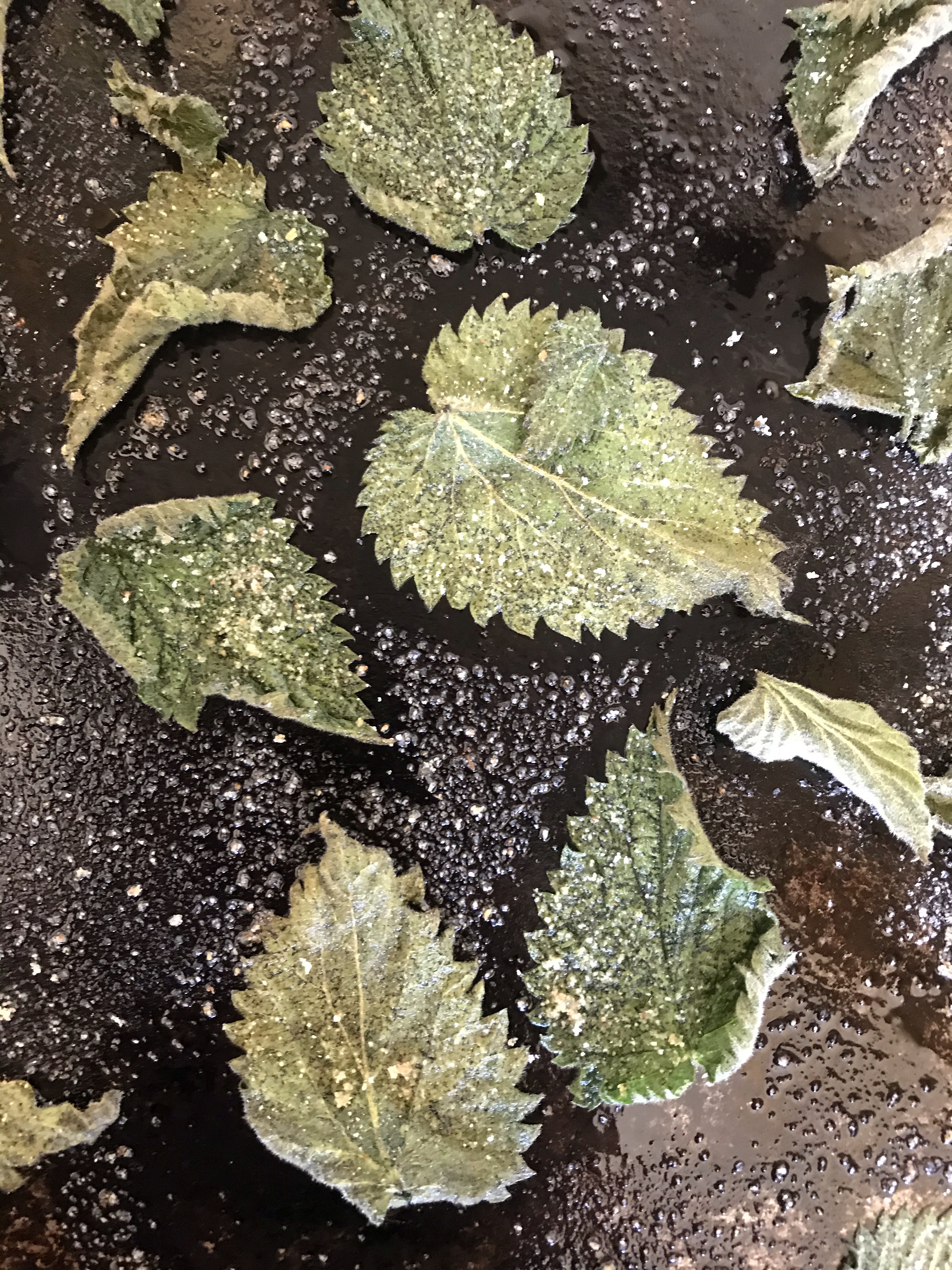 A few weeks back when I when out collecting wild garlic, I decided to chop some up and put it in some olive oil, to infuse it with the flavour of wild garlic so now it was time to try it. I got a baking tray and brushed the tray with the wild garlic olive oil, I lay the Nettles on the tray and brushed them with some of the oil too. I then seasoned them with salt, and popped them in the oven at about 150c for about 10 minutes.