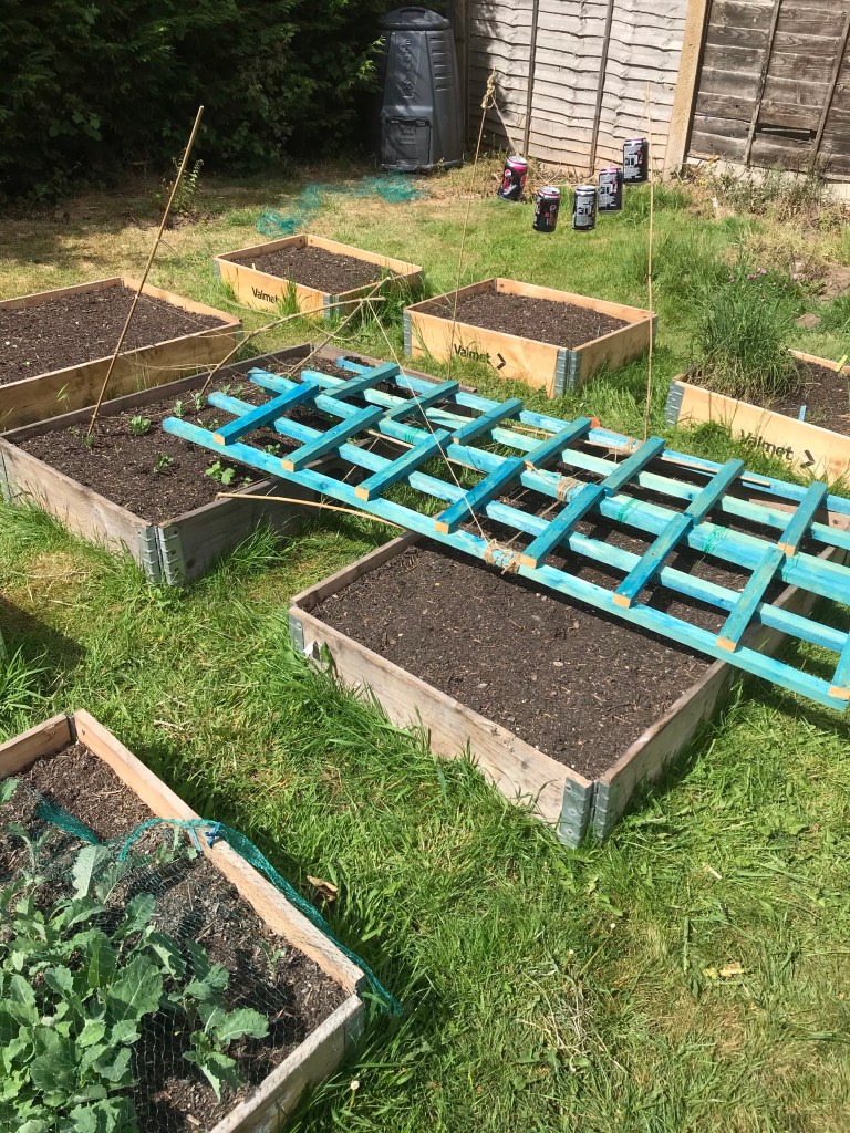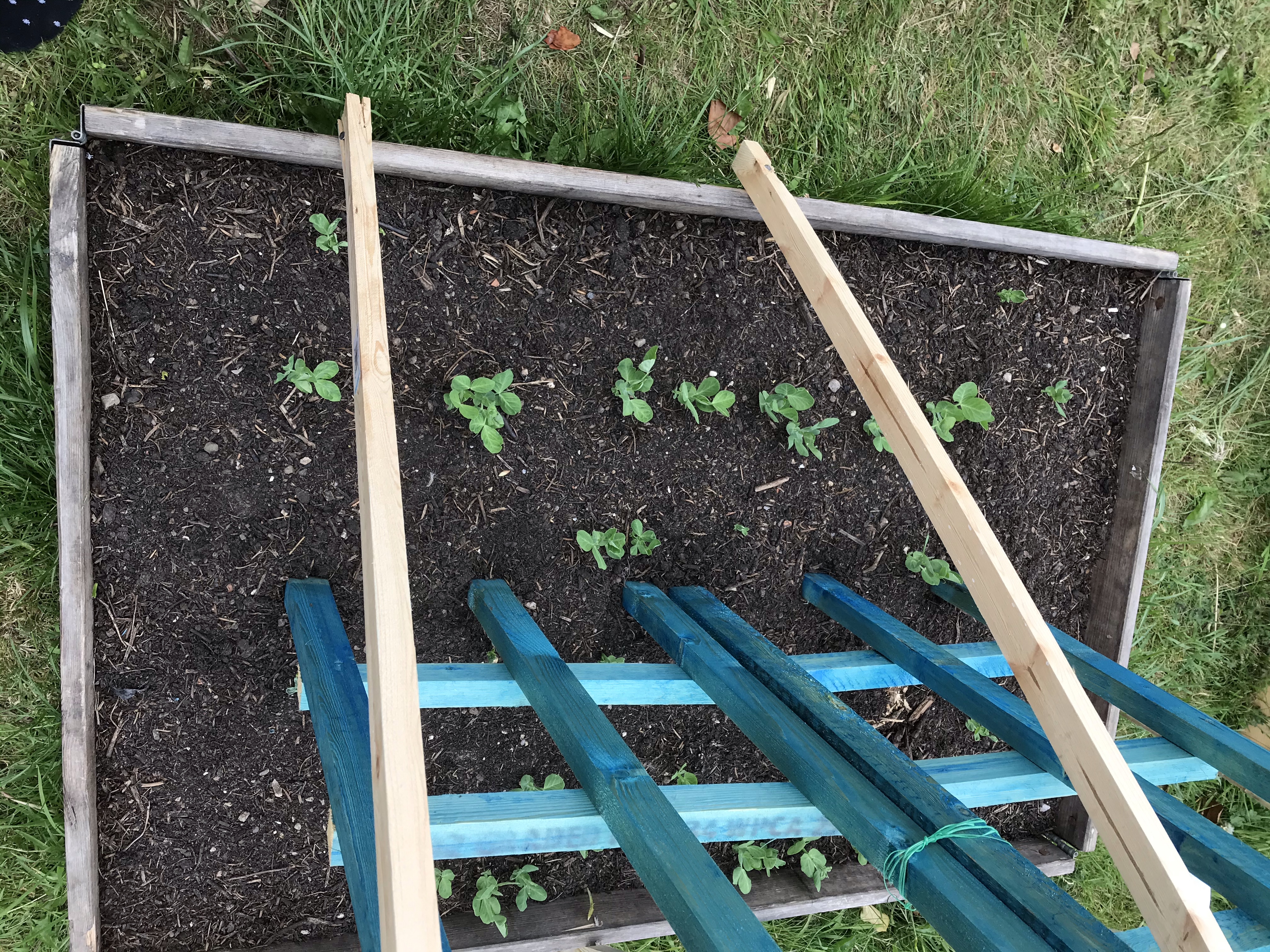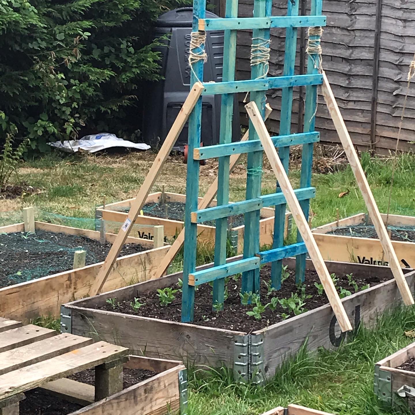 After the terrible winds we had a few days back, our wonderful pea trellis came crashing down! Luckily the Sweetcorn hadn’t been planted out yet in the neighbouring raised bed.
