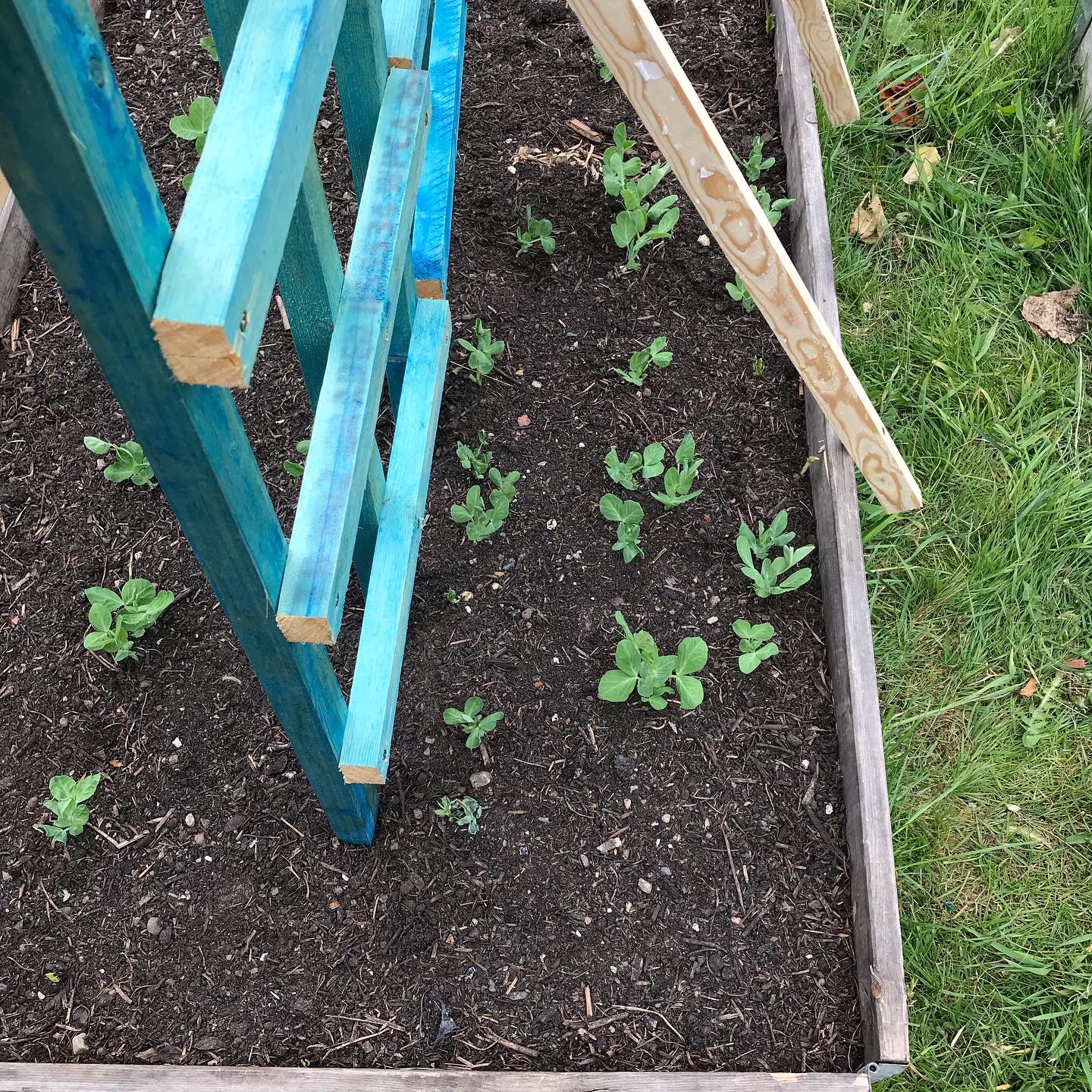 We have now put that back up and secured it with wood that is a hell of a lot stronger than canes and nailed them on, so hopefully it will withstand some windy days now. The peas are doing really well and growing fast, we just need to redo the string on the new wooden posts.