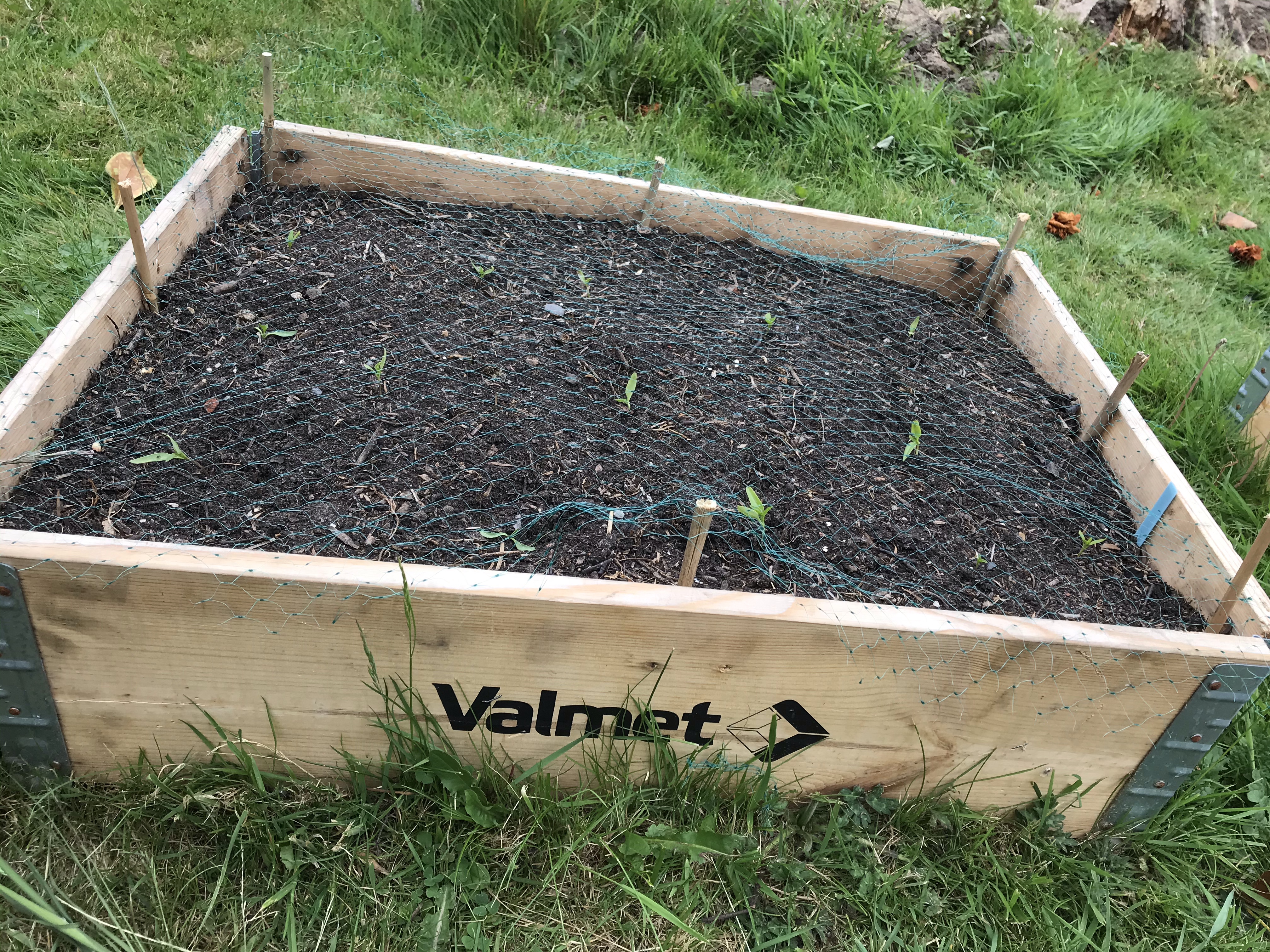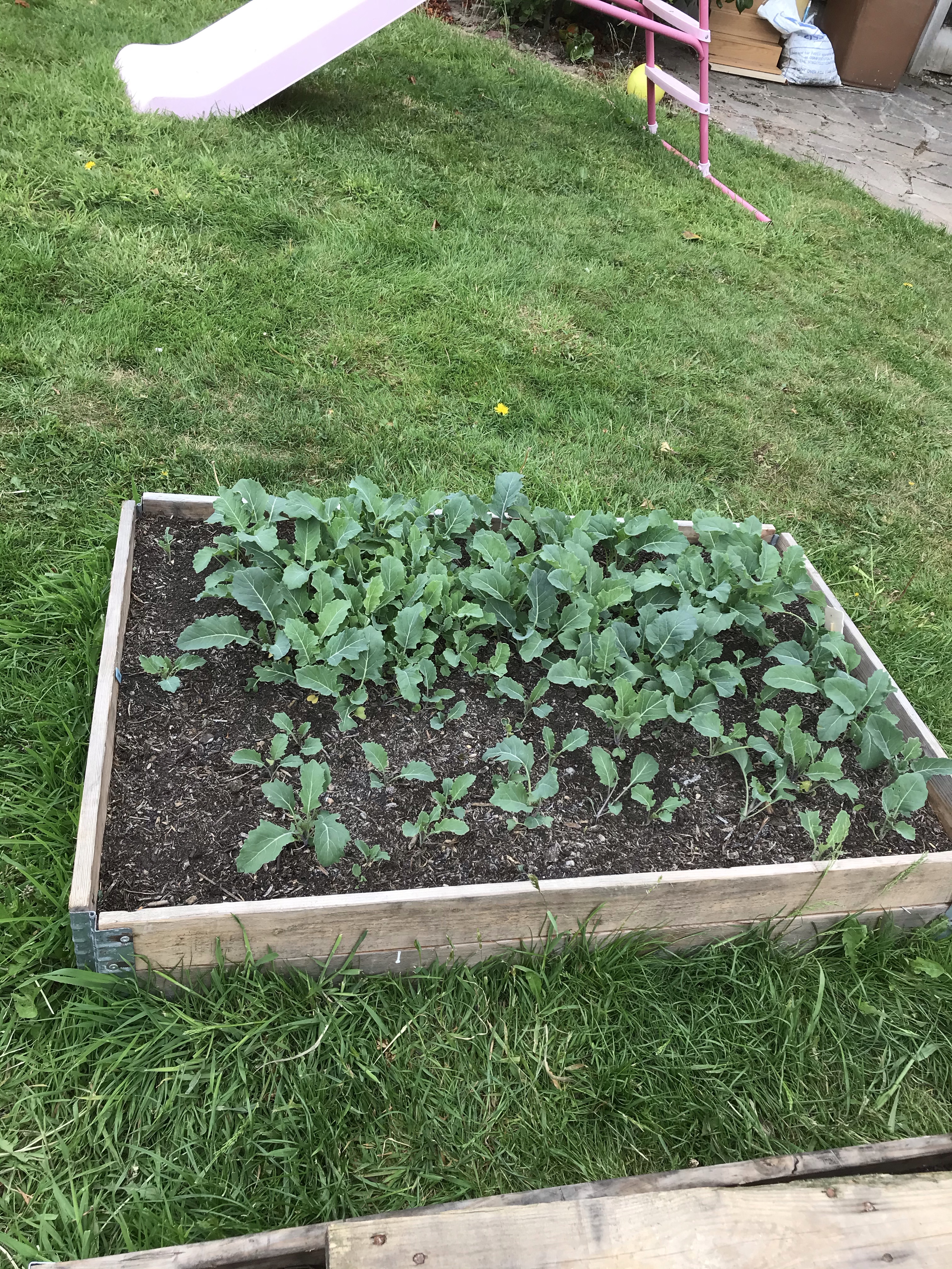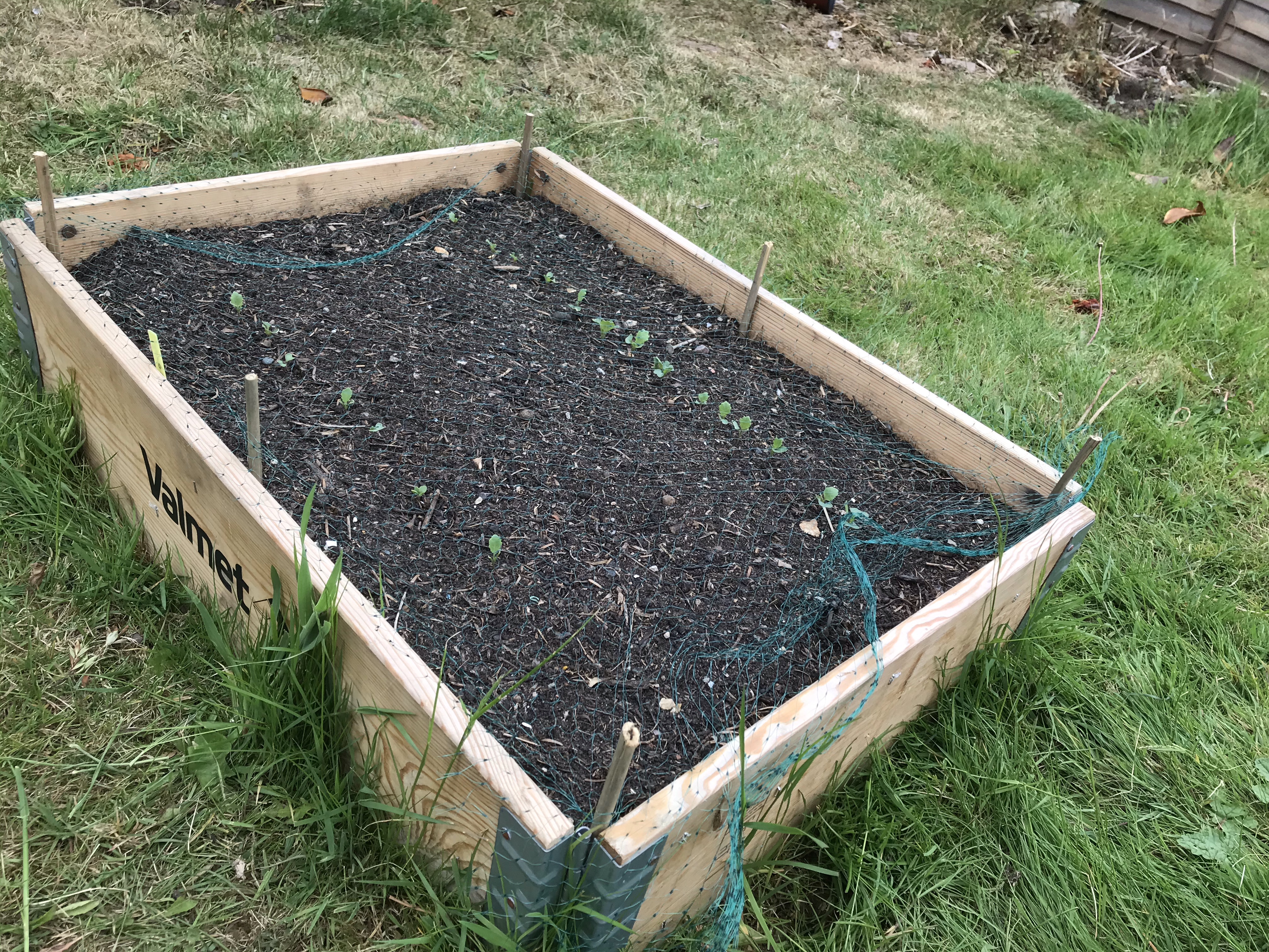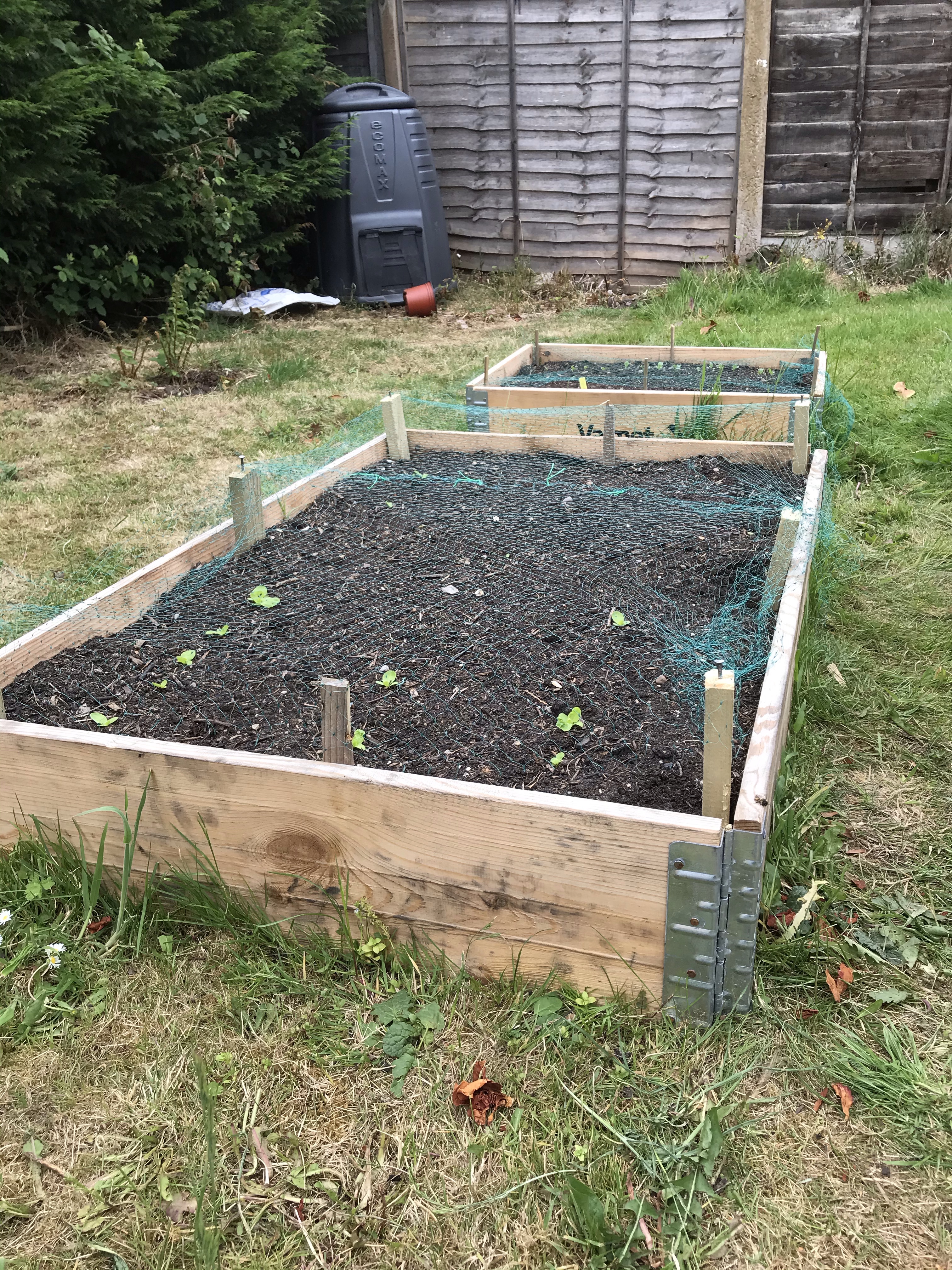 We have lots of things growing now. The herbs are all doing well, and the carrots have made an appearance. We have lettuces growing and sprouts. The Sweetcorn are doing well in their pots and will soon be ready to plant out. The broccoli is well on it’s way as it was the first thing we planted. Unfortunately the cauliflower all died off so in its place we are having a pumpkin patch. We also put the nets on and found a way to keep them higher up so the seedlings have room to grow and are kept safe from the birds.