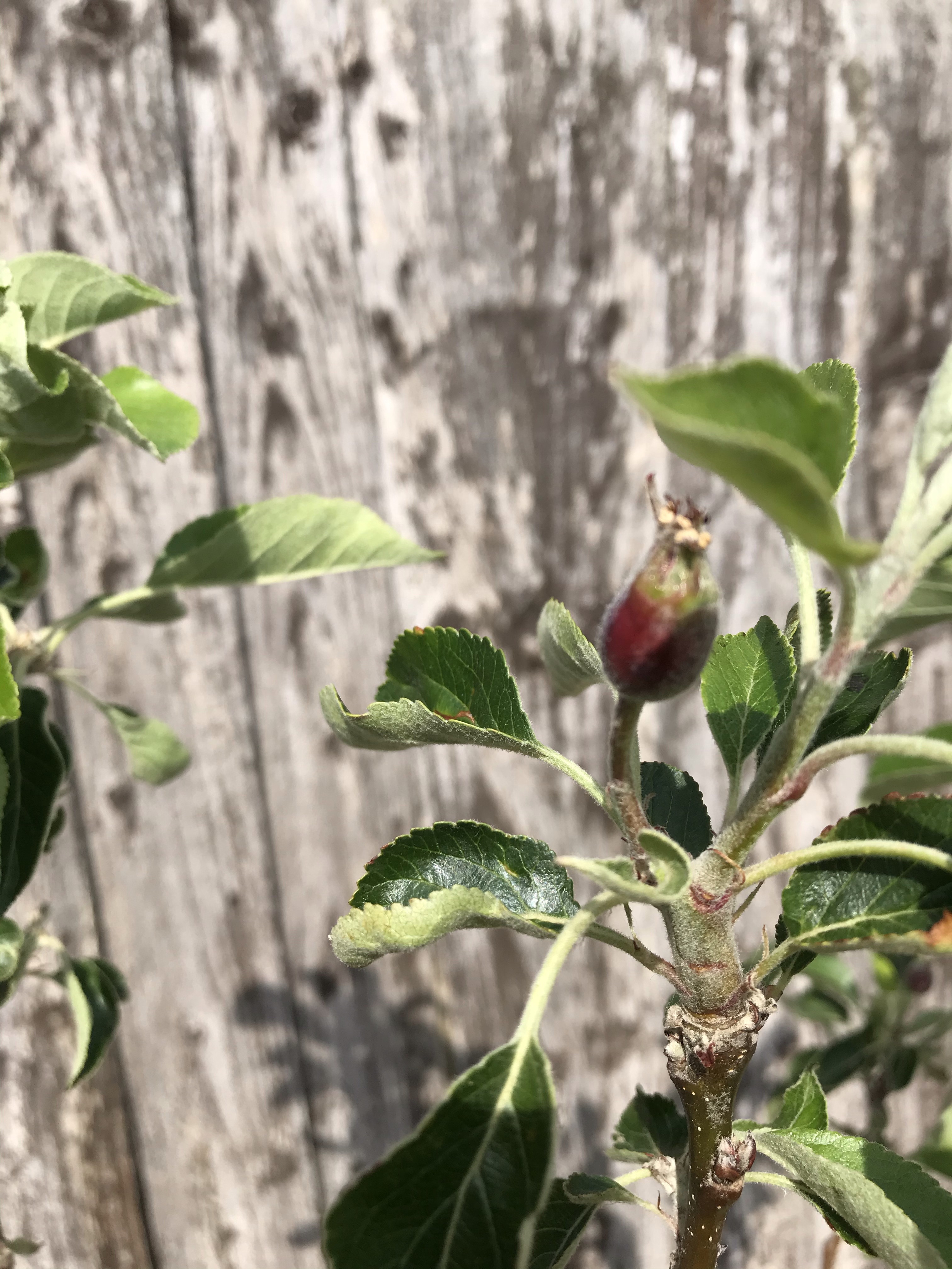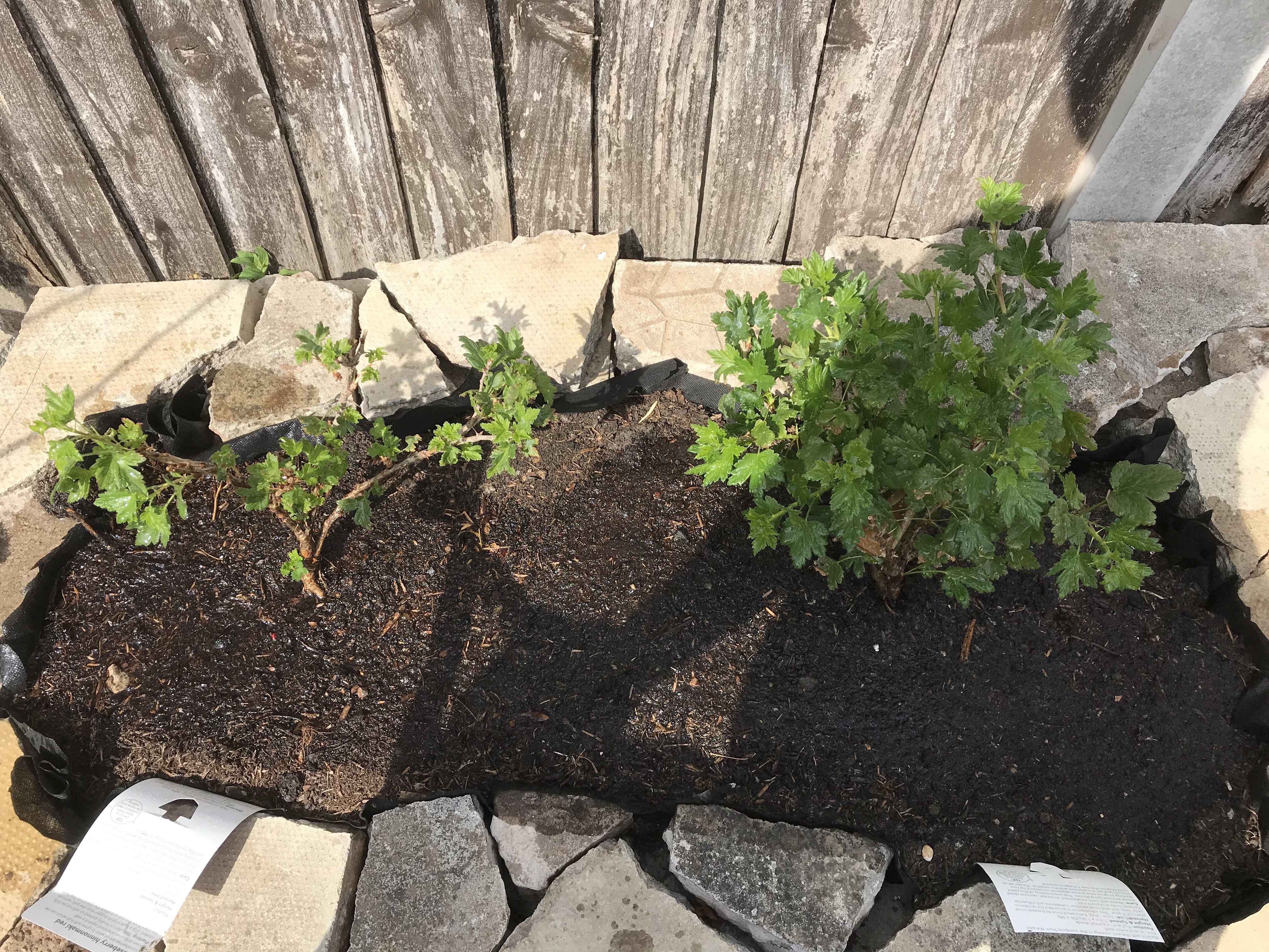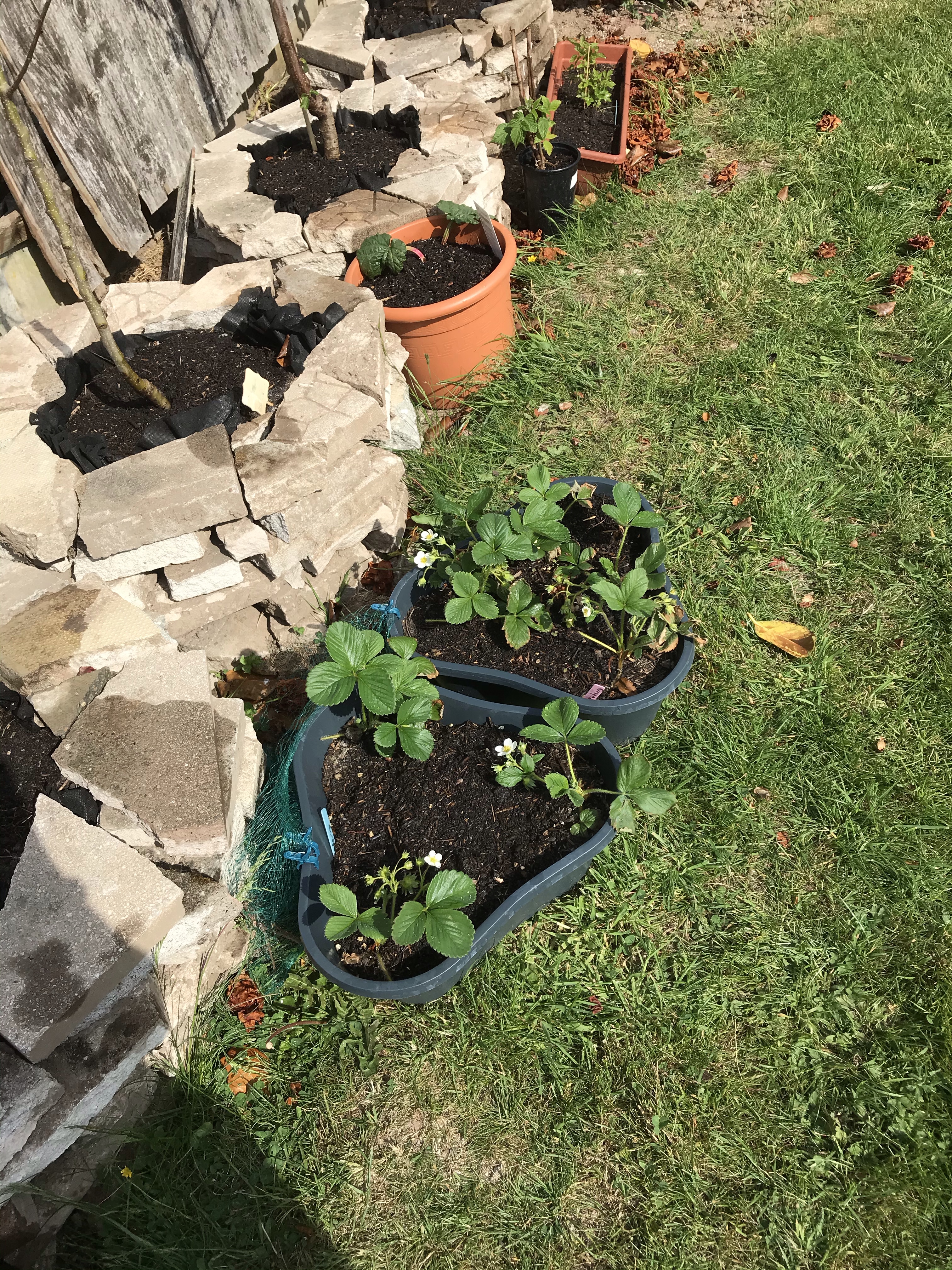 The pear tree is looking great now, and the apple tree has started growing a couple of tiny apples. The gooseberry bushes are starting to look much healthier since putting them in the stone planter and the strawberries are looking great too.
