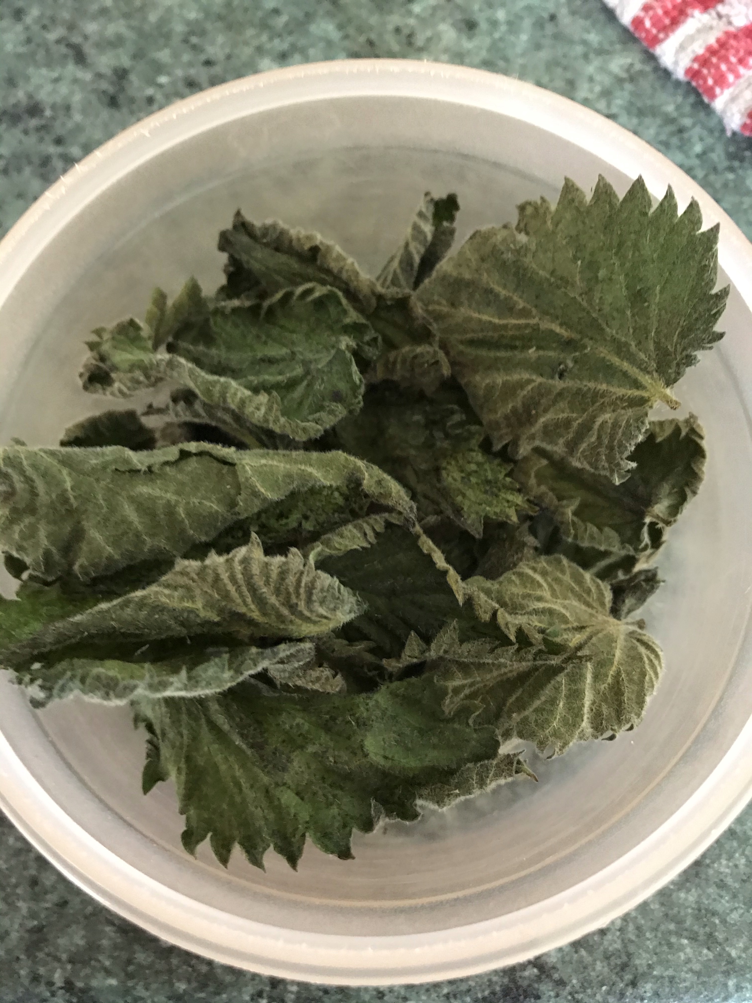 I set the oven to a really low heat only 50c and spread the nettles out. They dehydrated quite quickly in the oven and I then used a pestle and mortar to crush them.