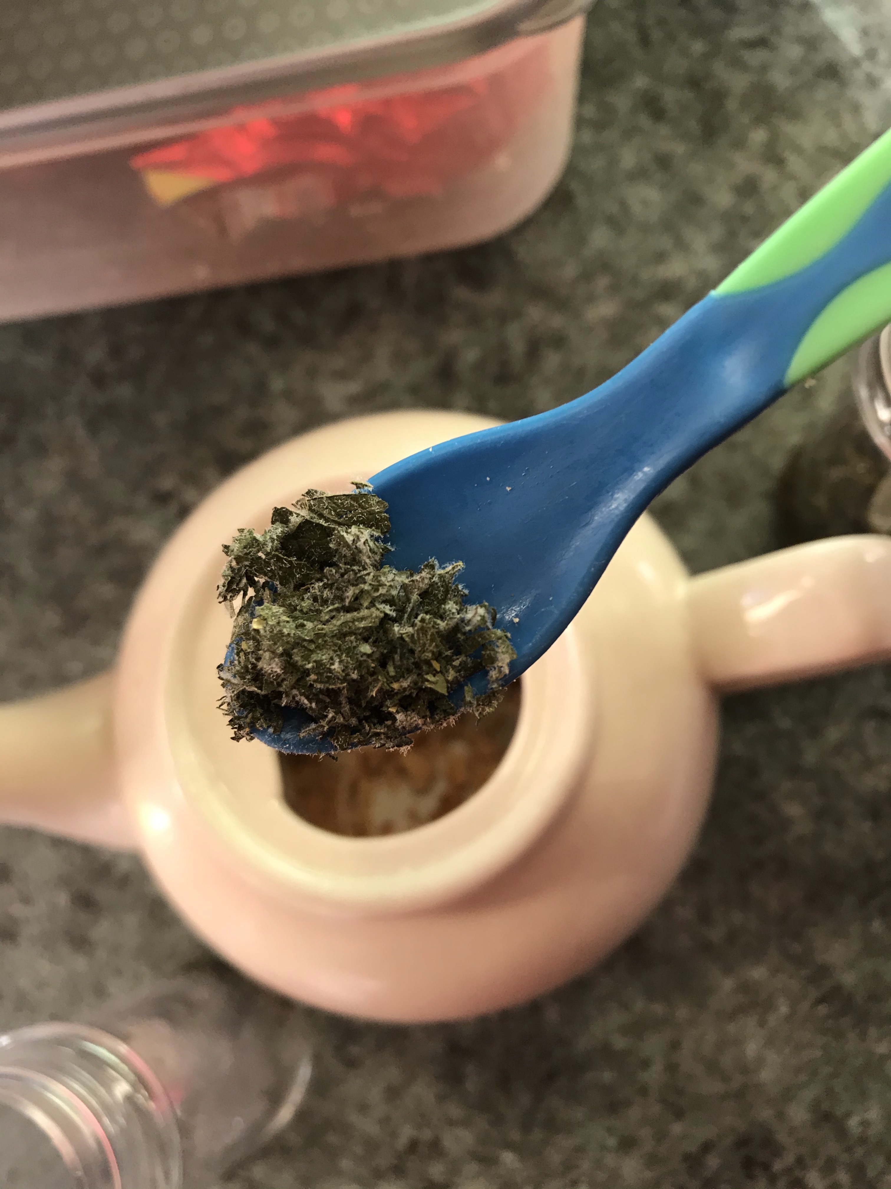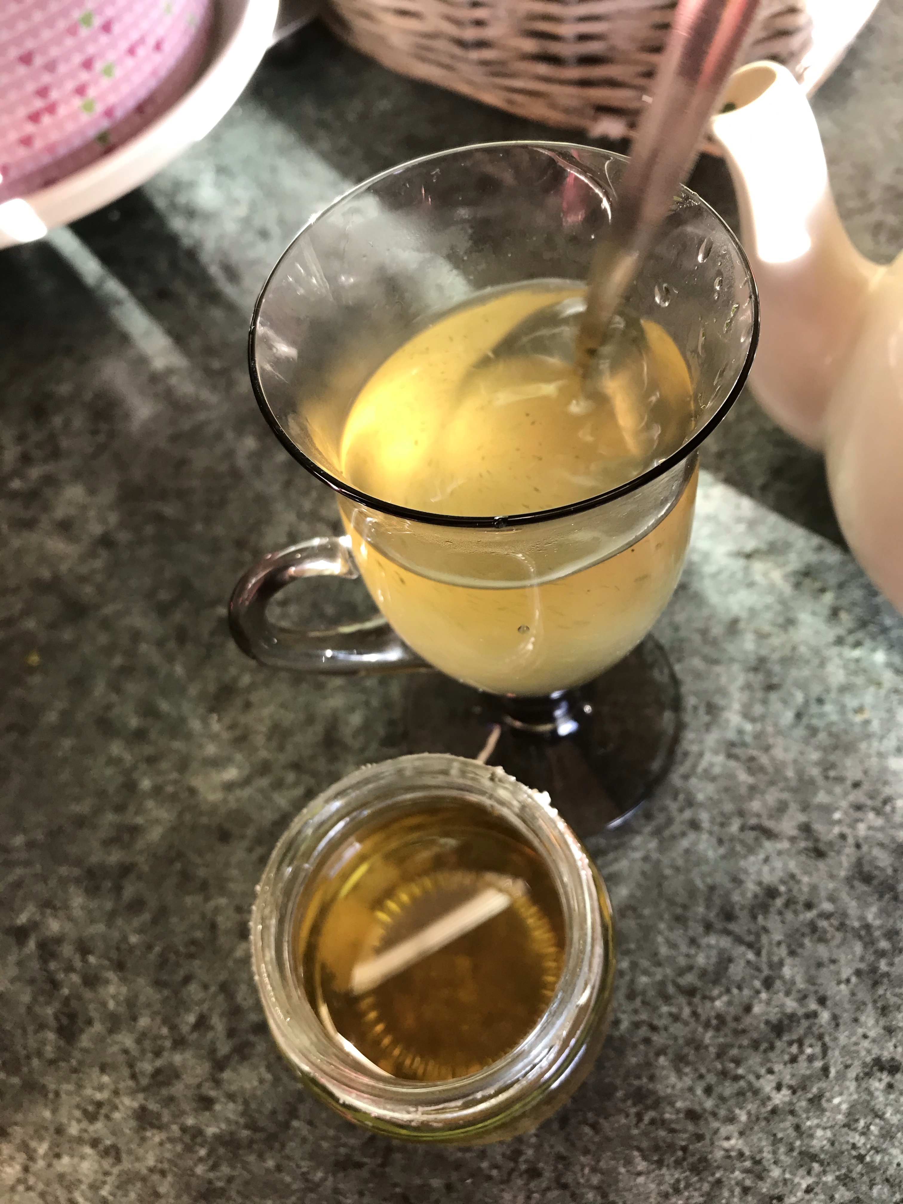 I decided to mix the nettle, apple mint and some of the dehydrated apple to make the tea. I left it a few minutes to infuse in the tea pot. I sweetened it with some of the dandelion honey that I made a few weeks ago. It was delicious, and refreshing, and I’ll definitely be trying out some more herbs and different variations.