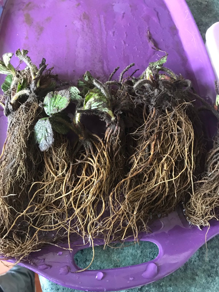The strawberries are growing nicely. If you remember what they looked like when they first arrived, bare root and shoved through the letterbox. I thought there was not much hope for them: