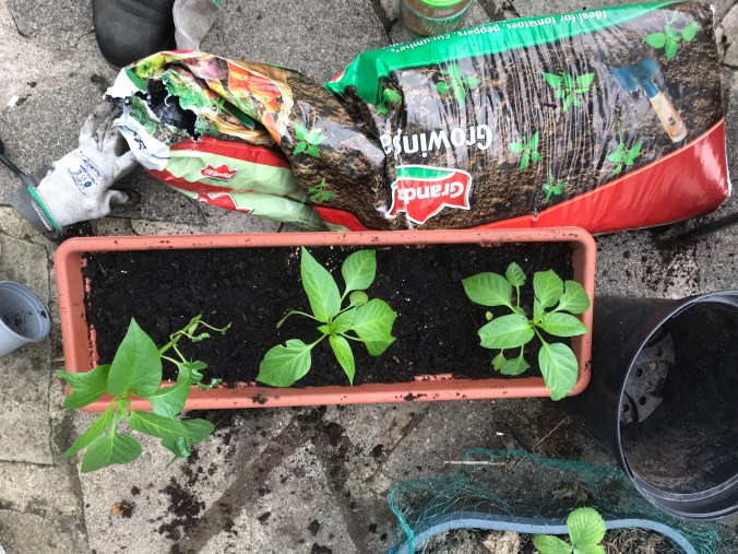 The peppers in the raised bed aren’t doing well at all, so I doubt we will see anything off them. The 3 peppers that I potted and put in pots are getting big! Whether they will actually grow peppers is yet to be seen, but if they don’t I will keep them inside over winter and hopefully next year we will have a head start with them. It is all a learning curve of course for us both.