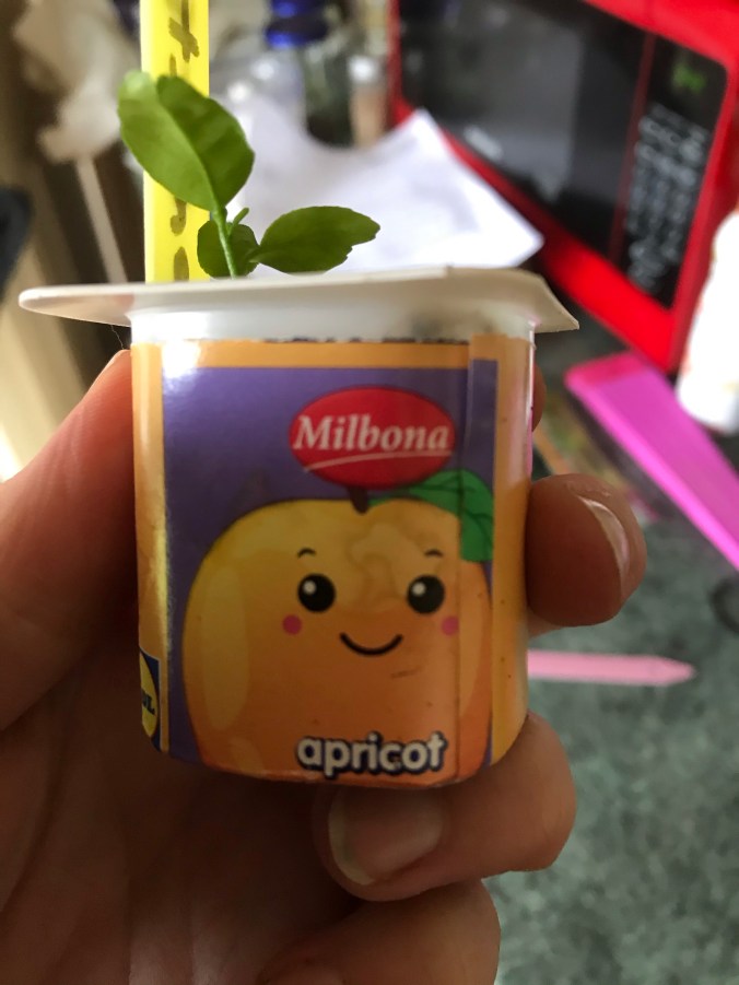 In one of our very early posts from March ‘isolation gardening’, I planted a satsuma seed in a yogurt pot. I thought it was a lost cause and was going to bin it, but it finally sprouted, its now been re-potted. We have way to many satsuma seedlings growing now, 7 in total.