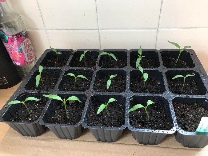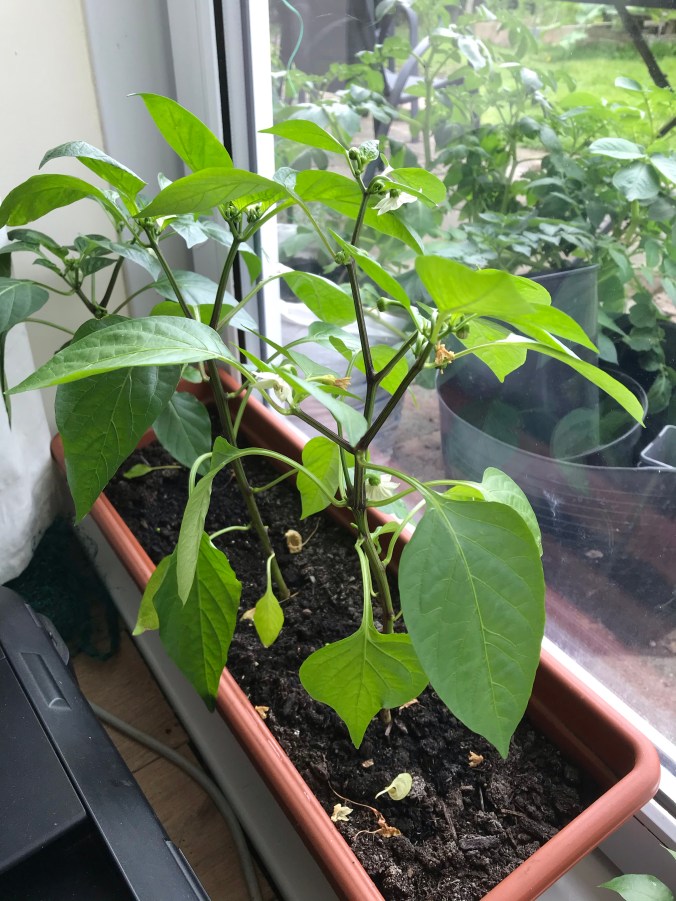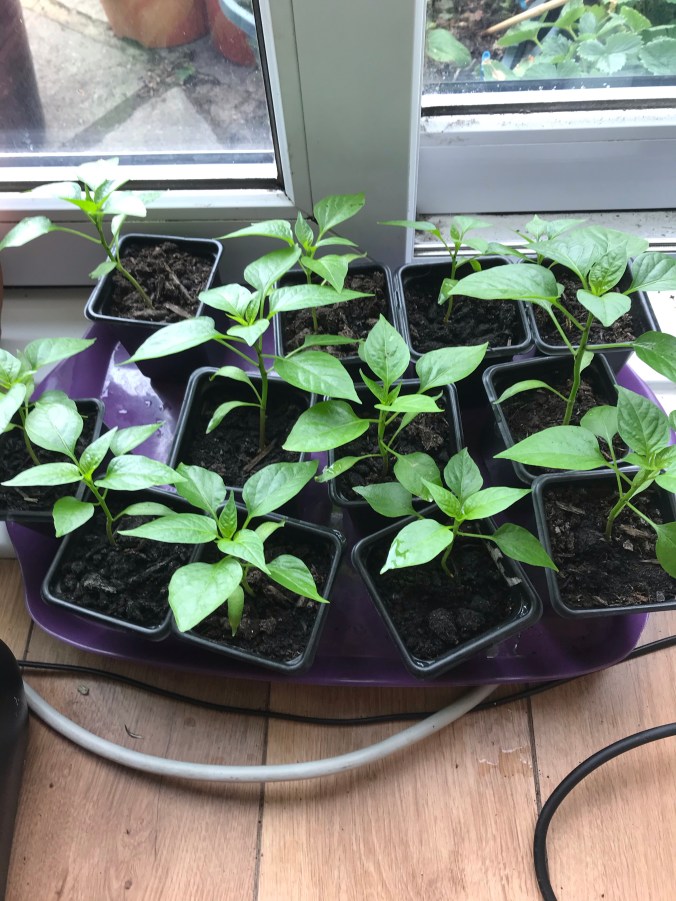 Quick update on the Peppers. The Bell Peppers are now flowering, I have taken them out doors occasionally, but decided to pollinate using a paint brush, because they are indoors most of the time. We chose to keep them inside, because the ones we planted outside just didn’t do very well and are still very small. The Chilli peppers are now re-potted and doing really well. We have also re-potted the mini pointed peppers, having only planted 2 seeds they both grew really well and fast!