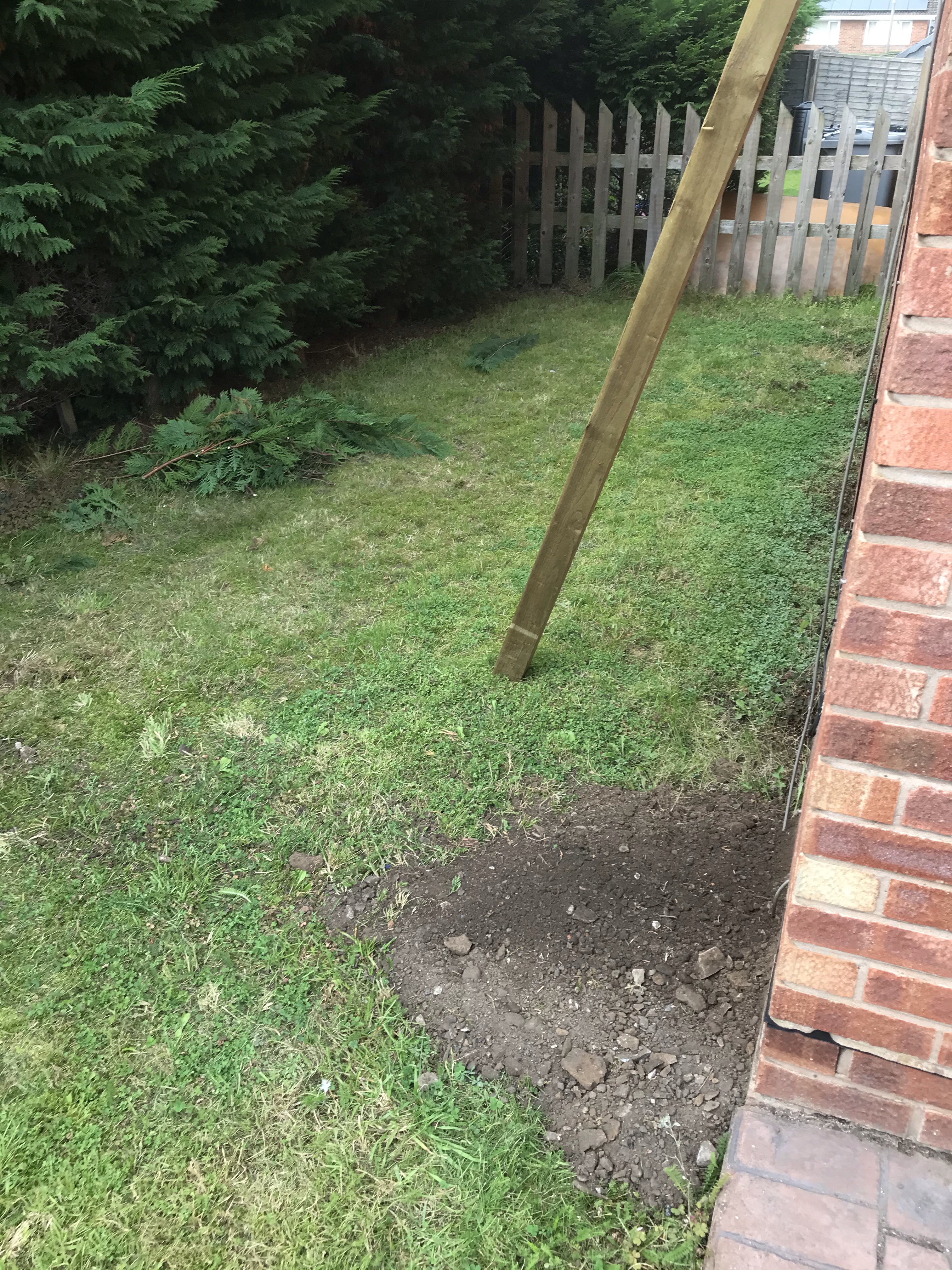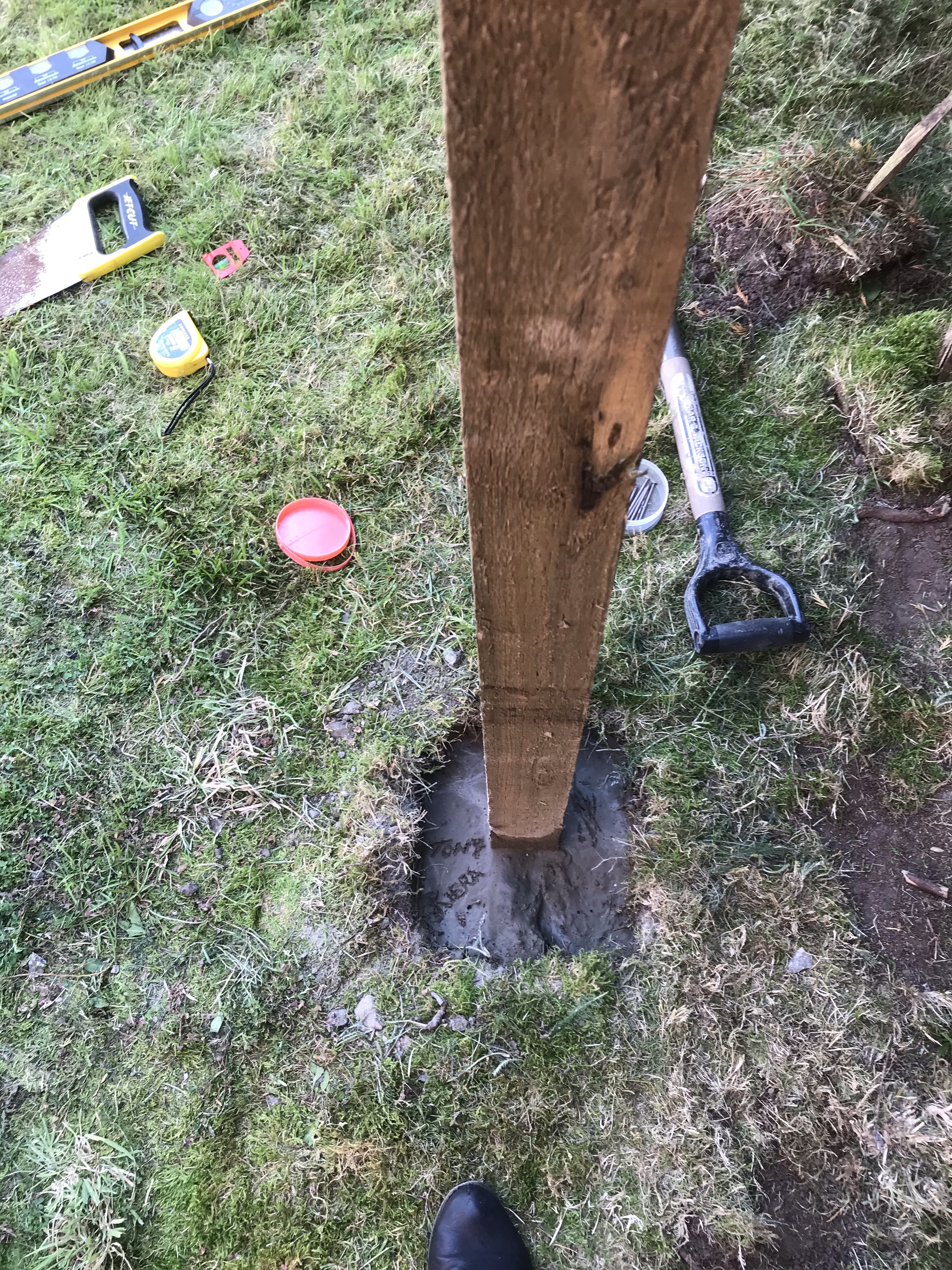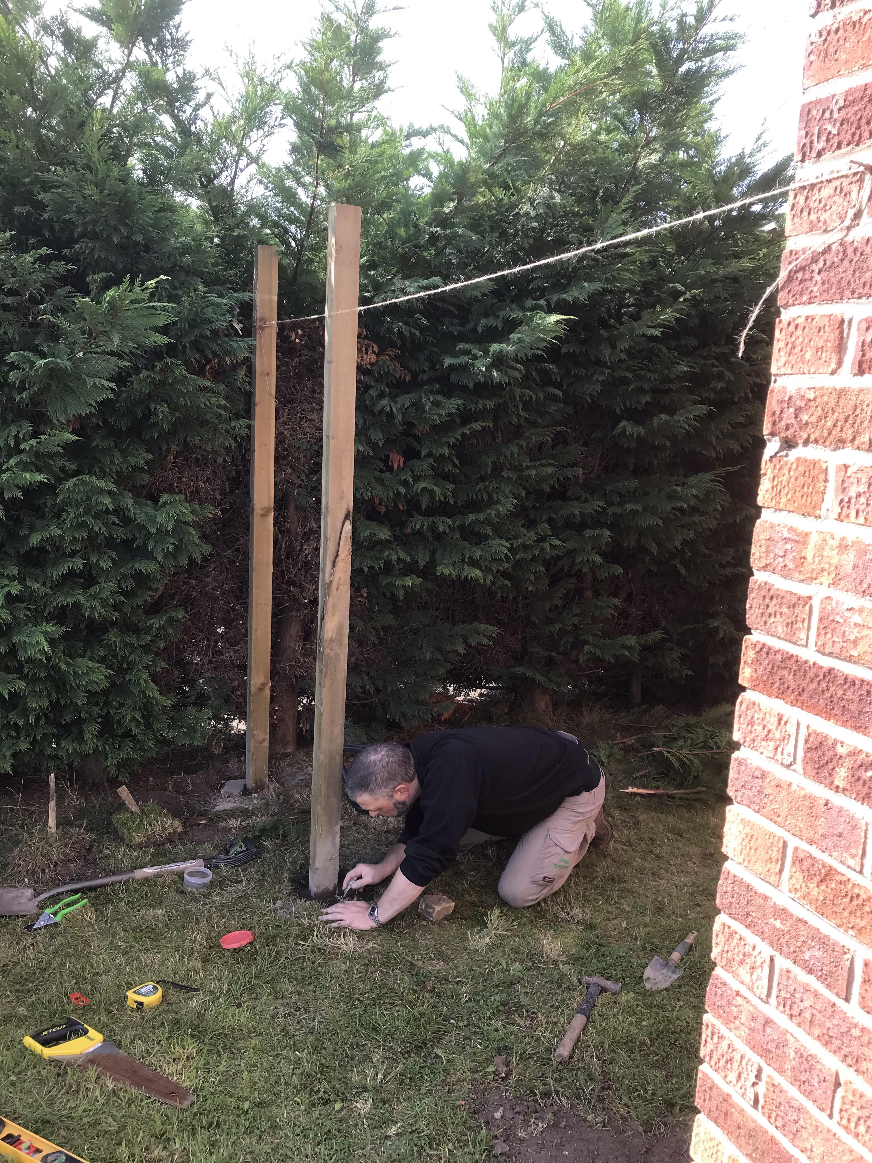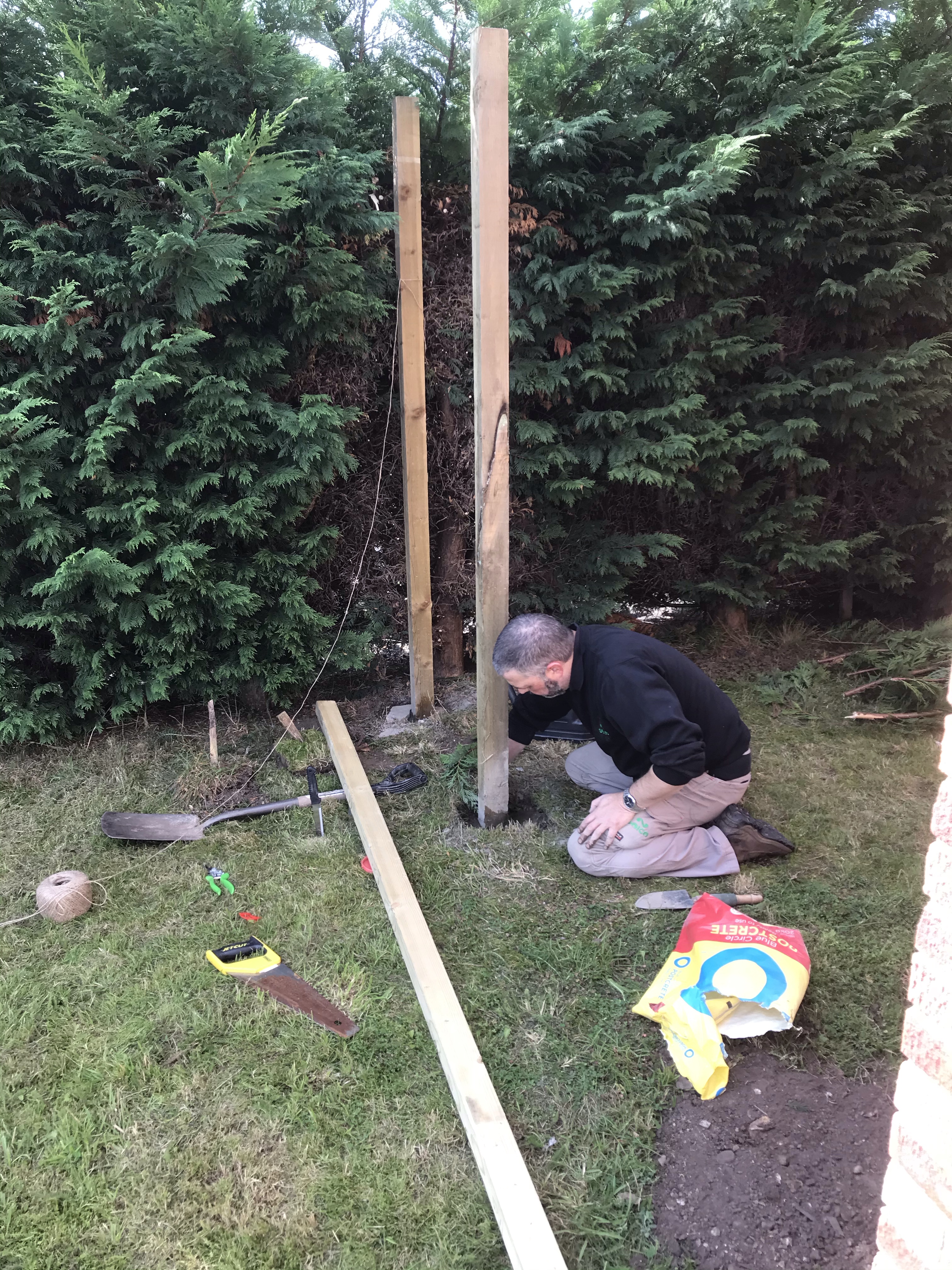 Tony started the fence at the front of the house, giving us a huge amount of space that previously wasn’t being used. He ordered the timber from Wicks, and he started by digging the holes, putting in the posts, and securing them with concrete.