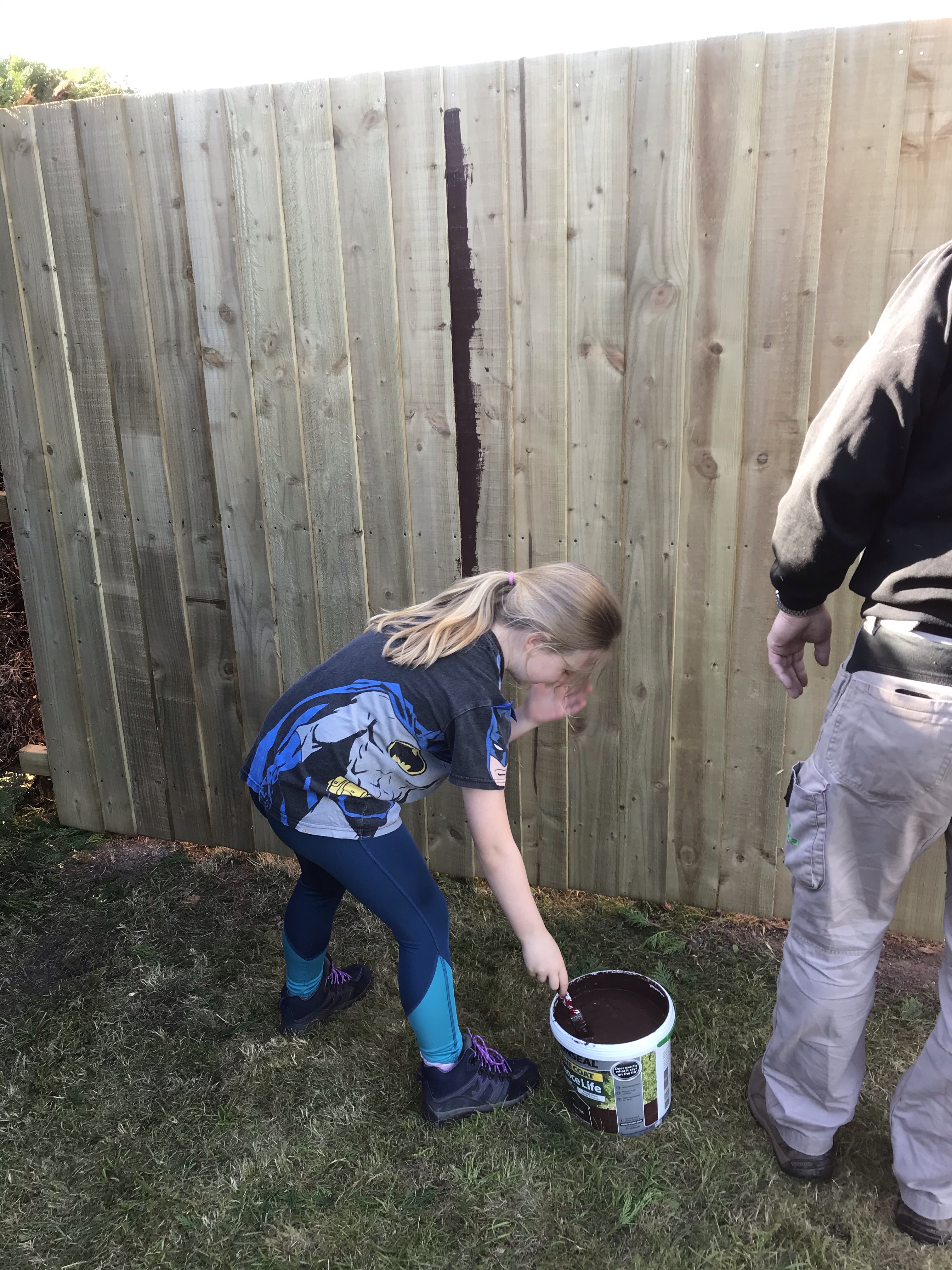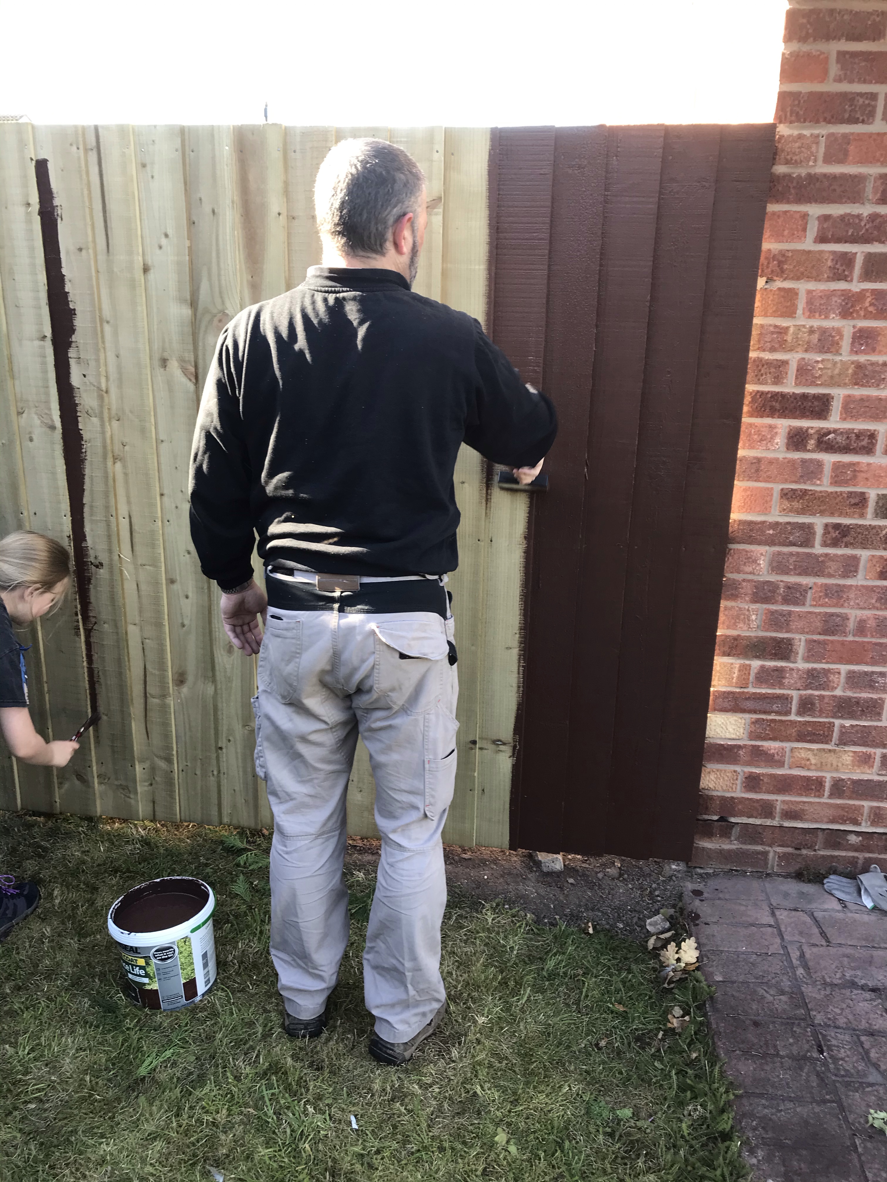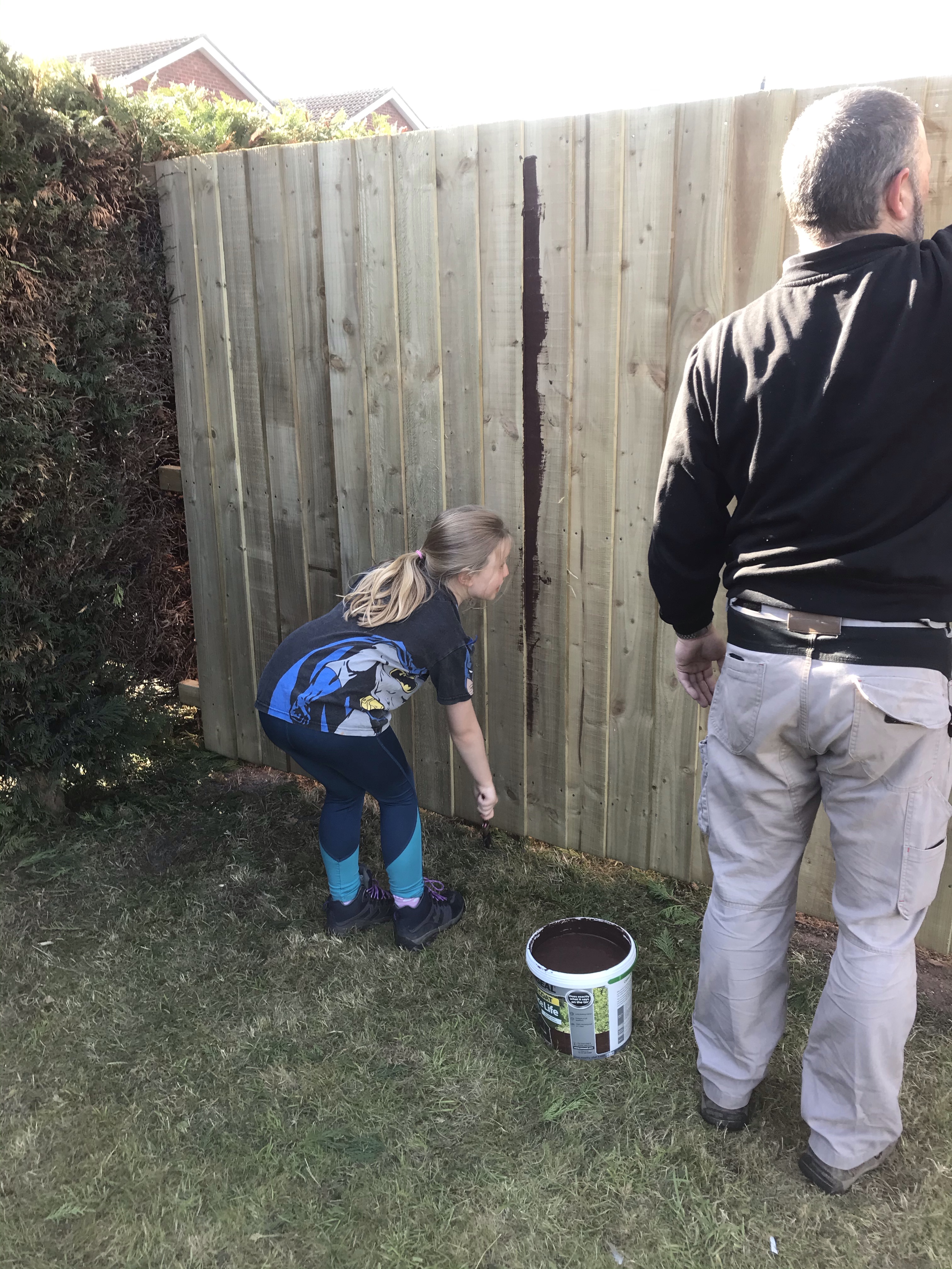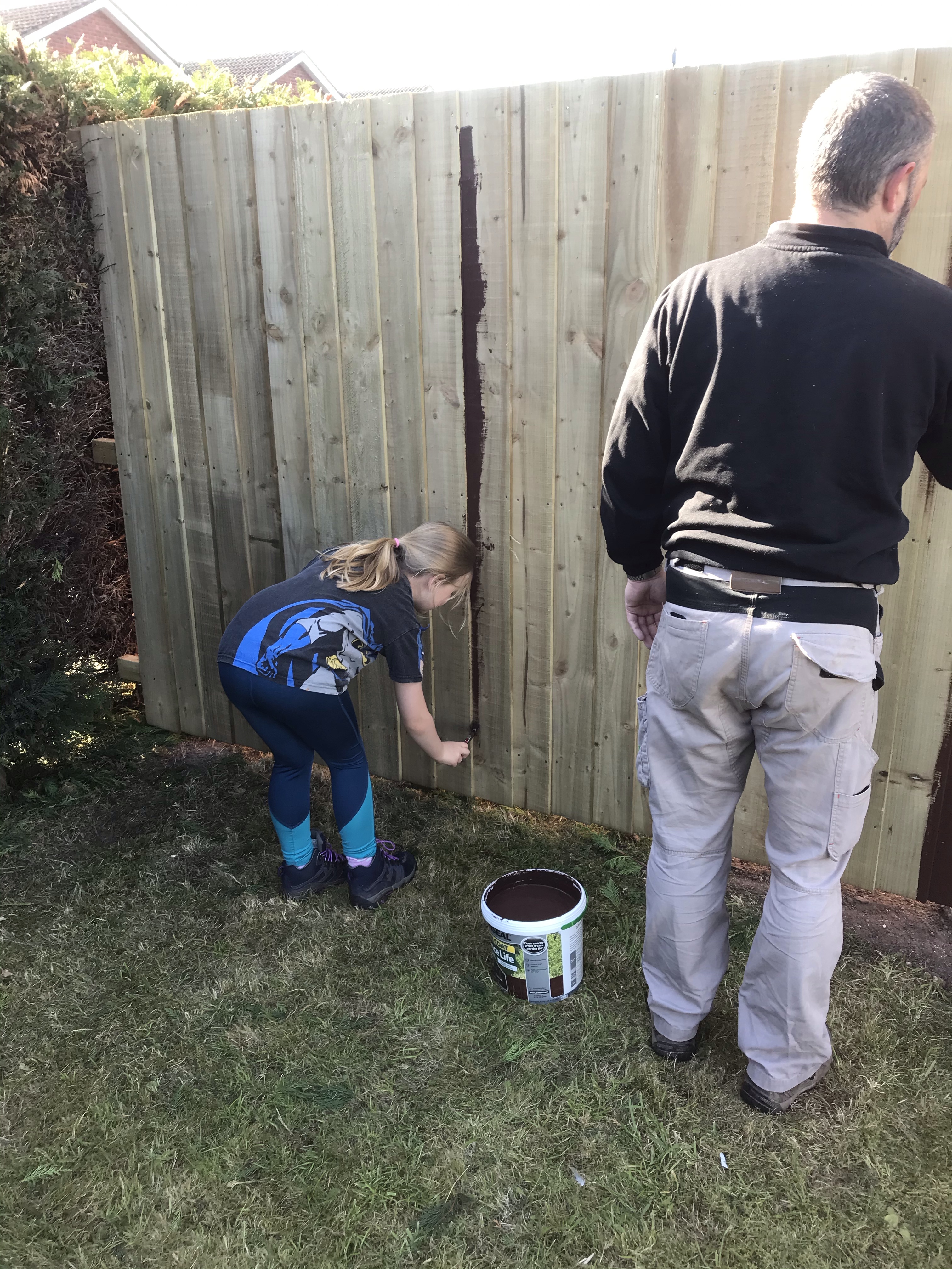Tony finished the rest of the fence about a week later, securing the feather boards on in no time at all. We then all shared the painting duties. We used a dark wood stain and luckily it washed out of our clothes…. because we were covered!! Especially Tony who got painted by Aria.