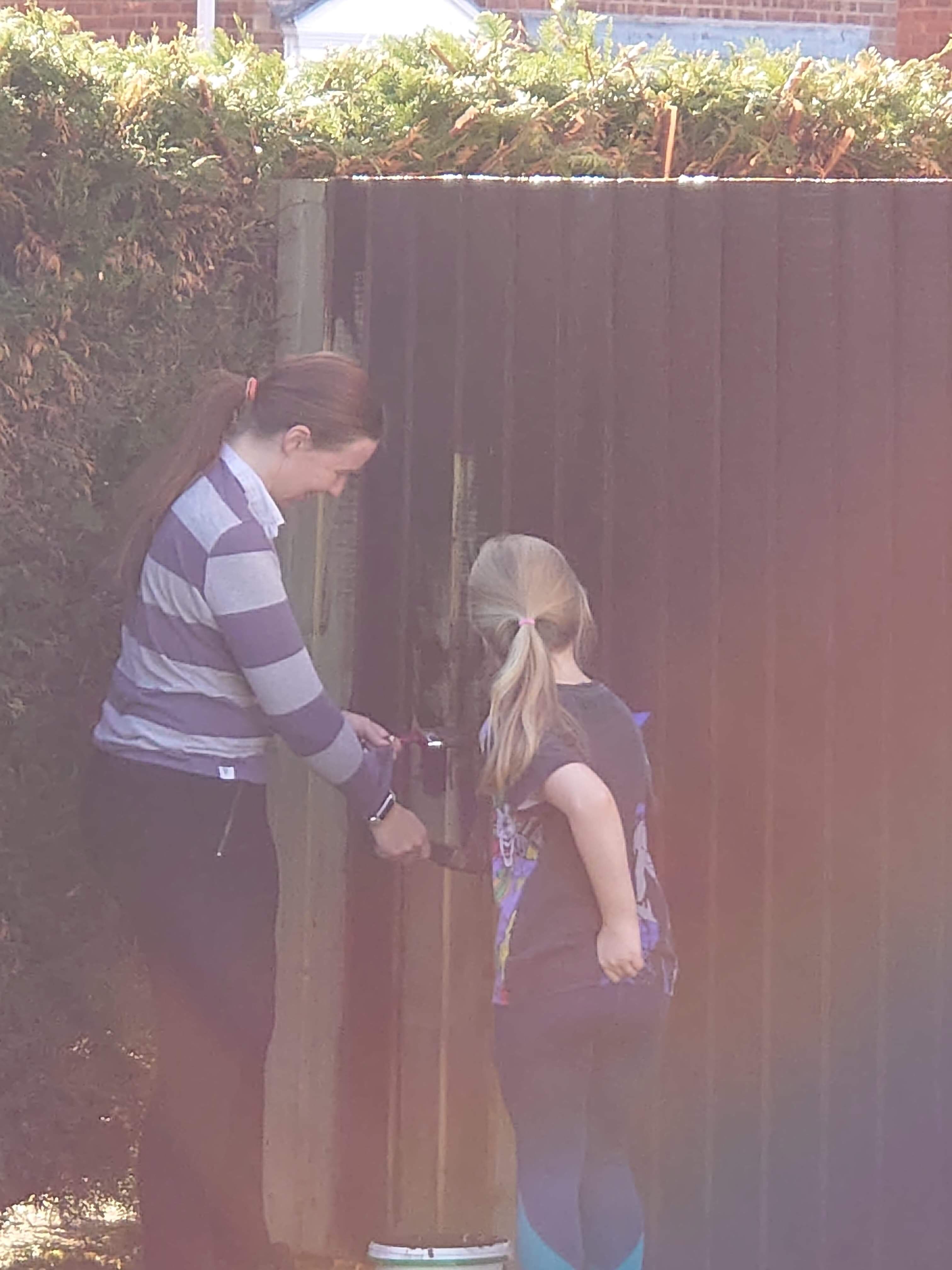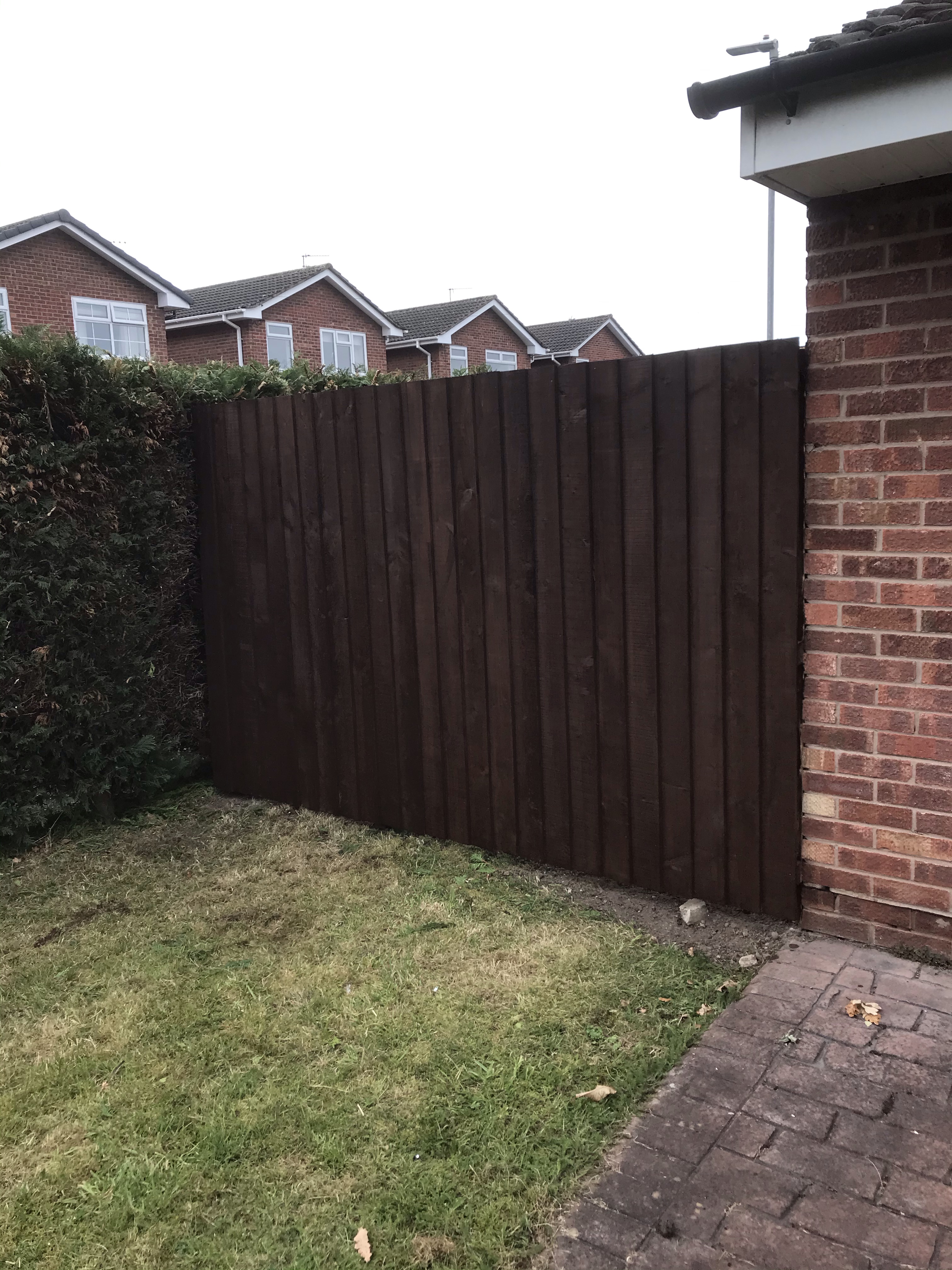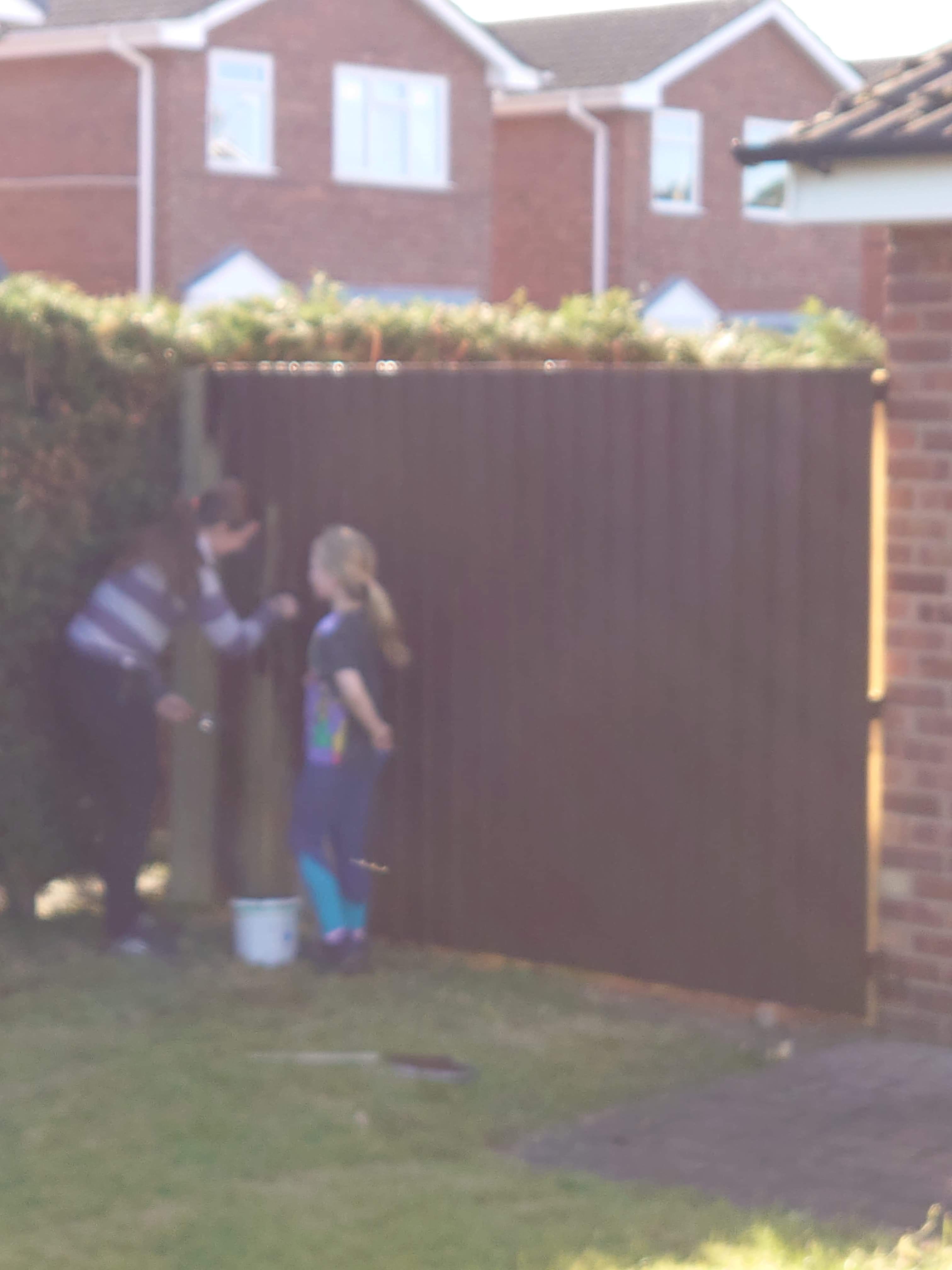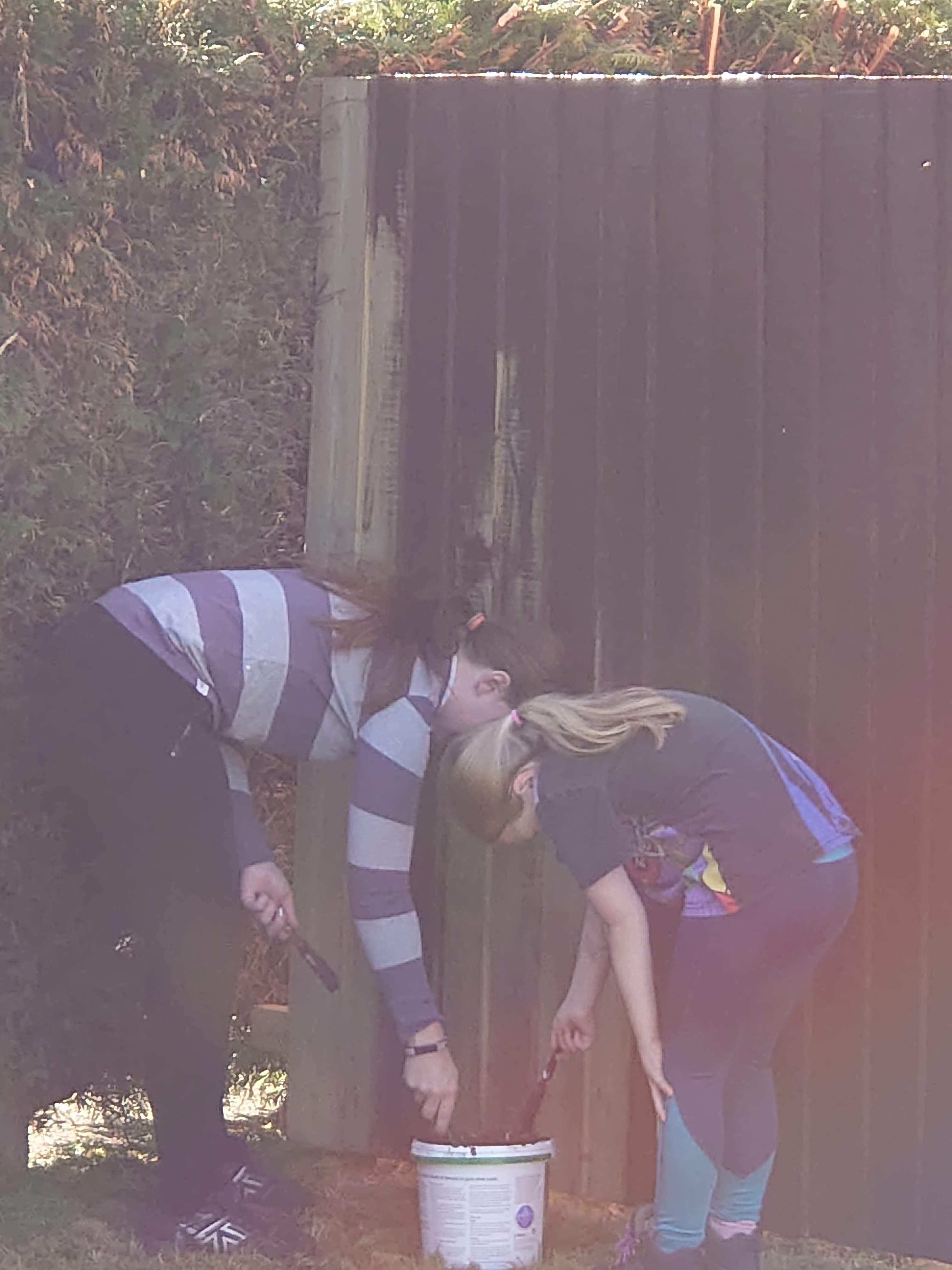 Tony finished the rest of the fence about a week later, securing the feather boards on in no time at all. We then all shared the painting duties. We used a dark wood stain and luckily it washed out of our clothes…. because we were covered!! Especially Tony who got painted by Aria.