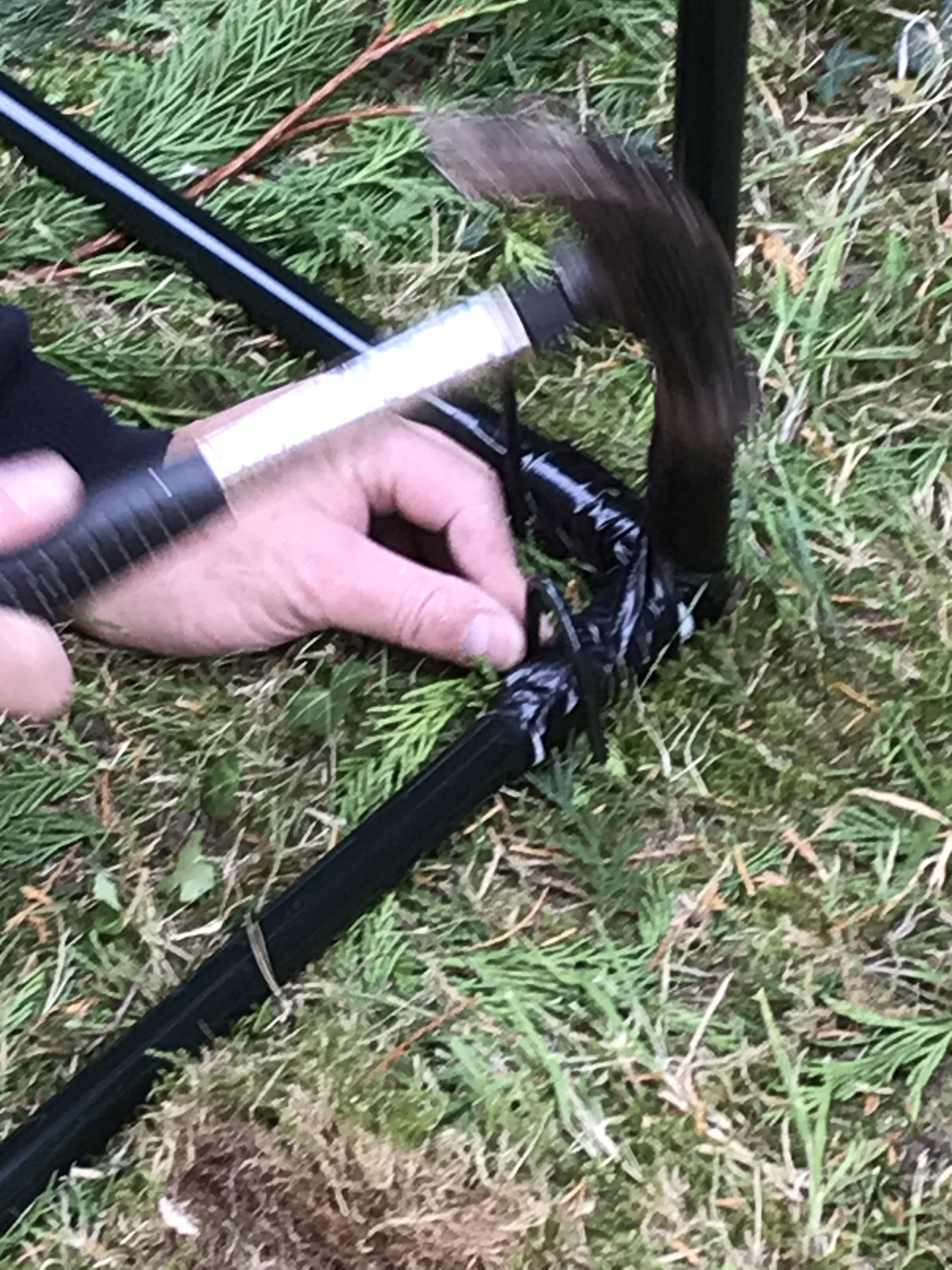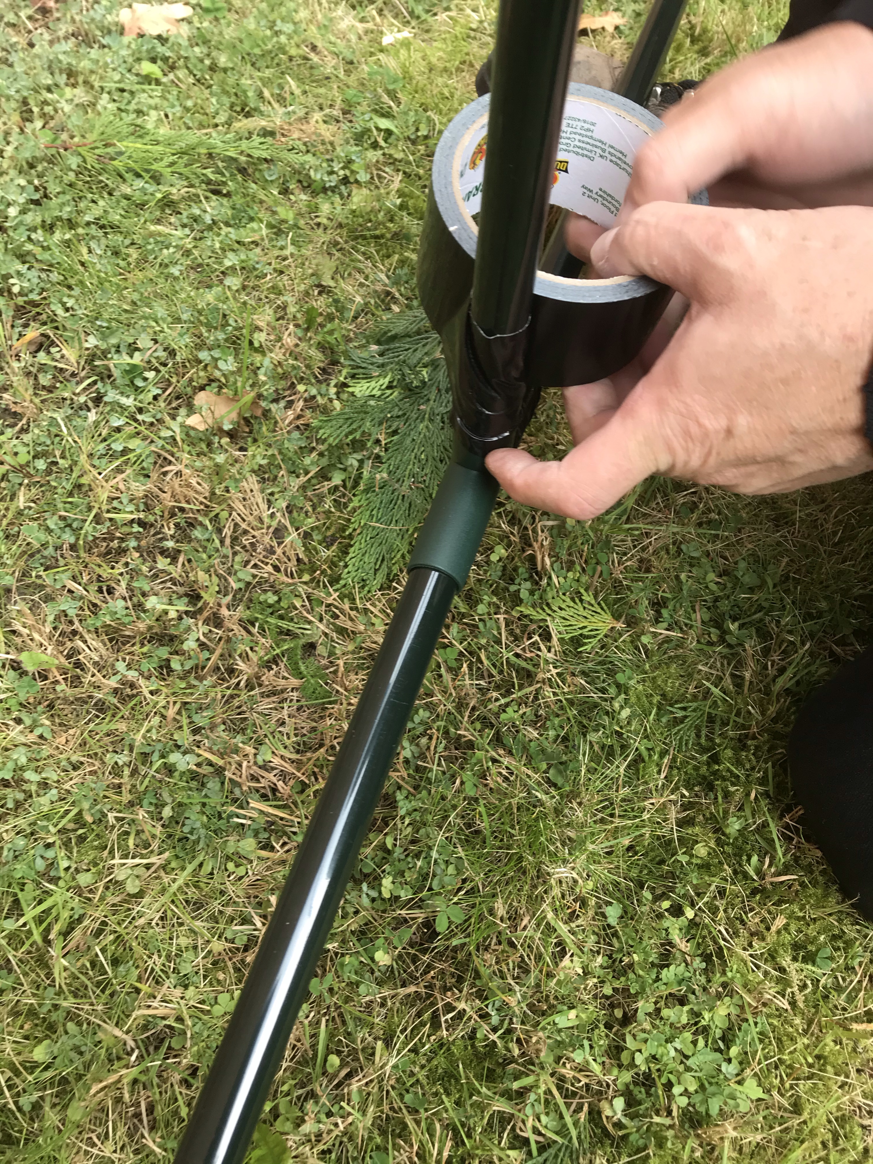 We decided to duct tape all the joints, as they weren’t very stable, and kept popping out. Once the plastic was put on the frame and tied on to the poles, it was then pegged down. We have had a few stormy days and so far, so good. So keeping my fingers crossed it stays where it is.