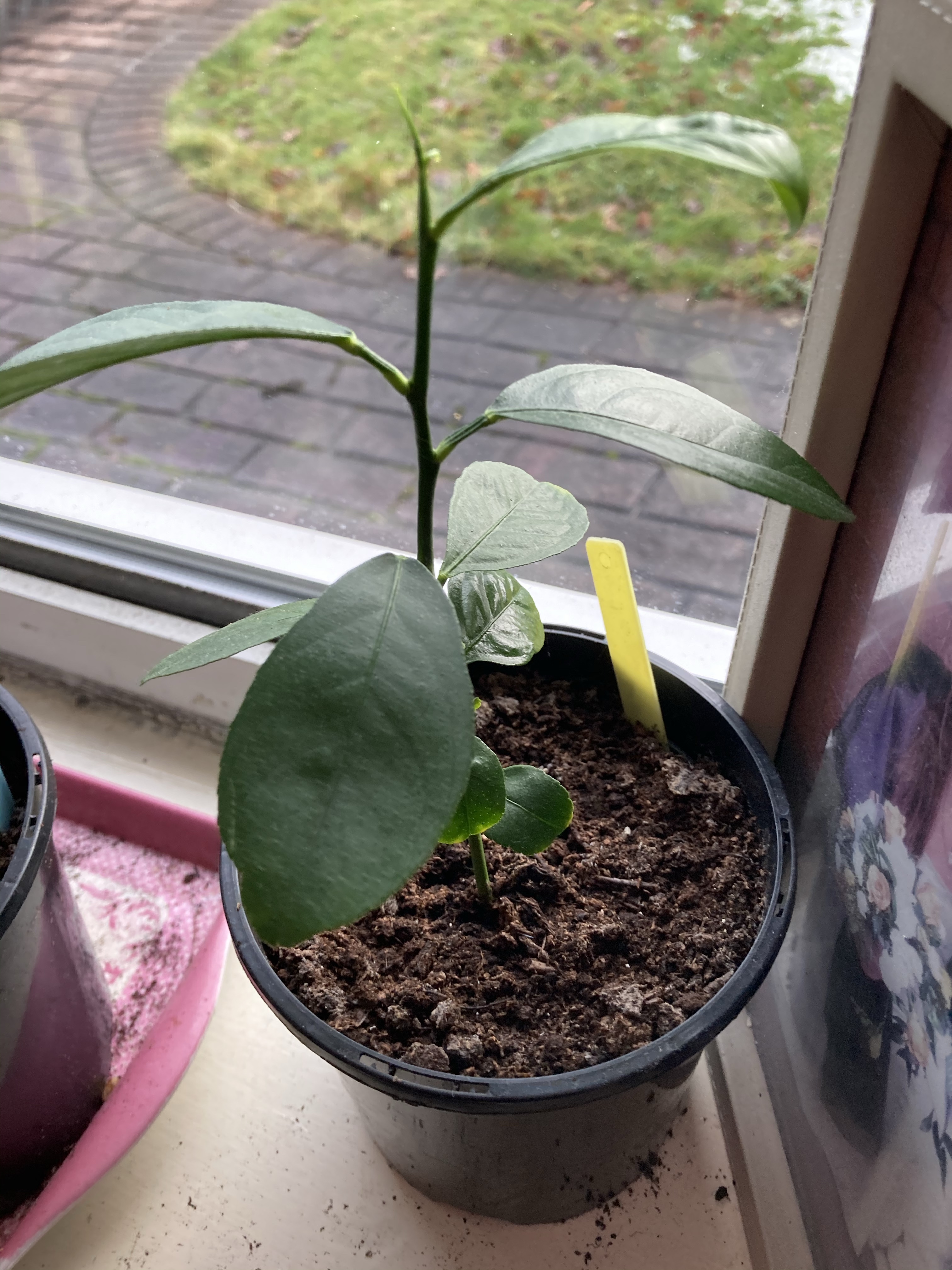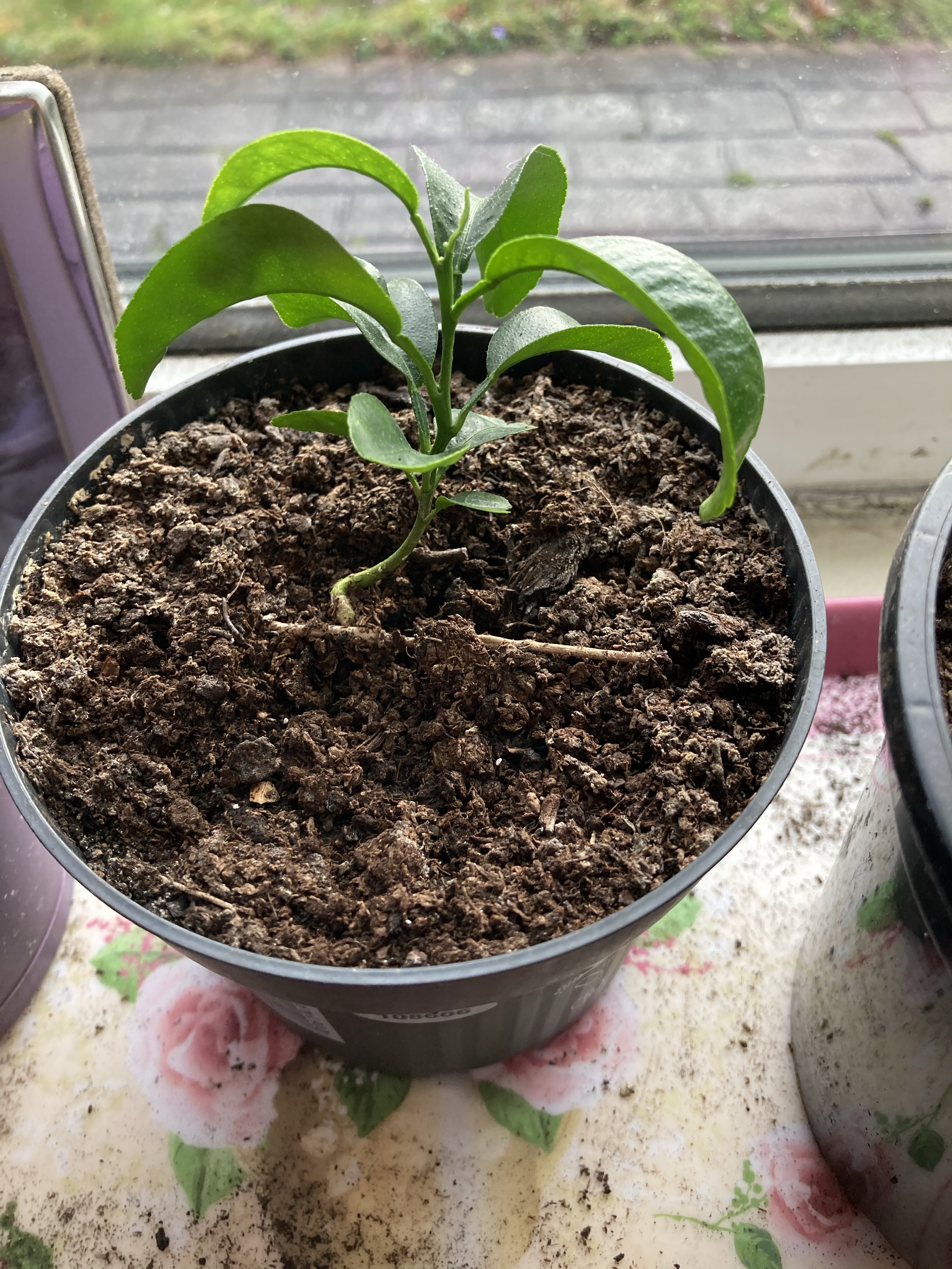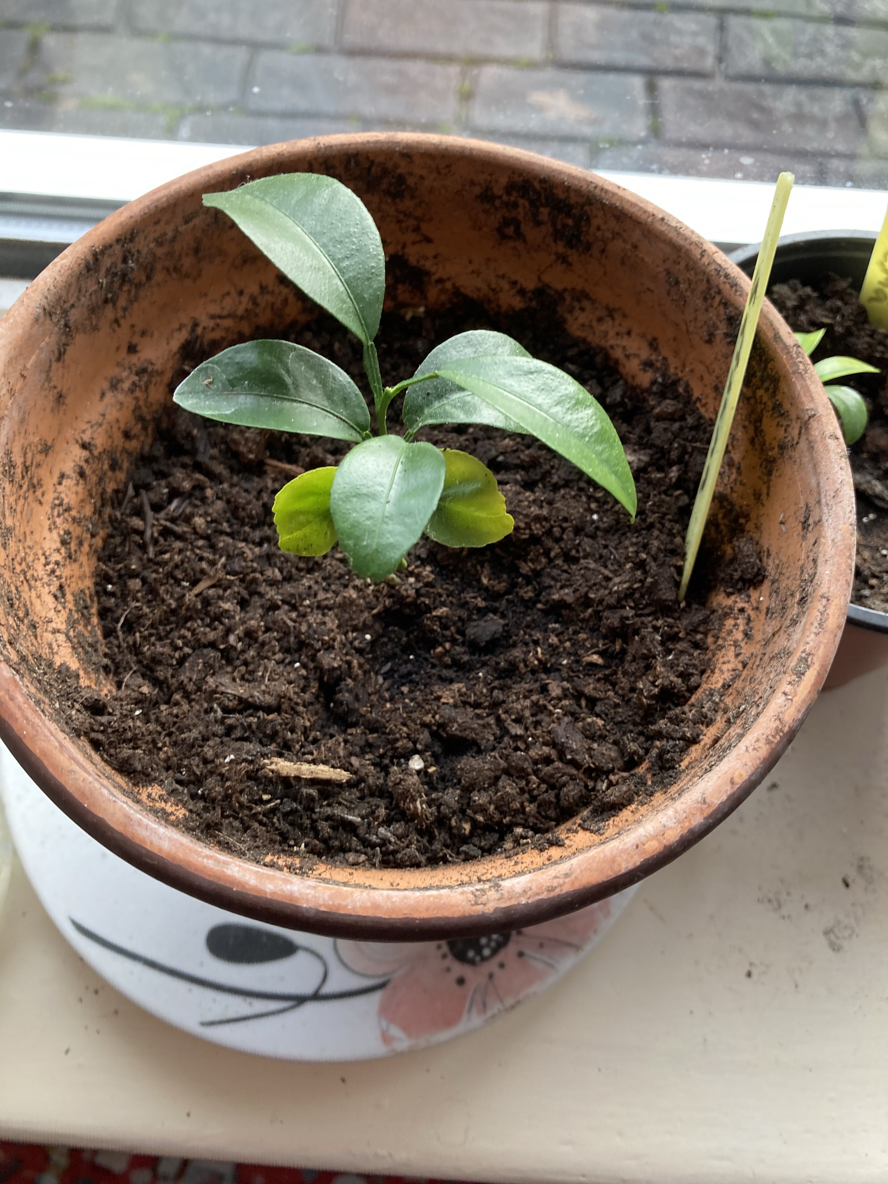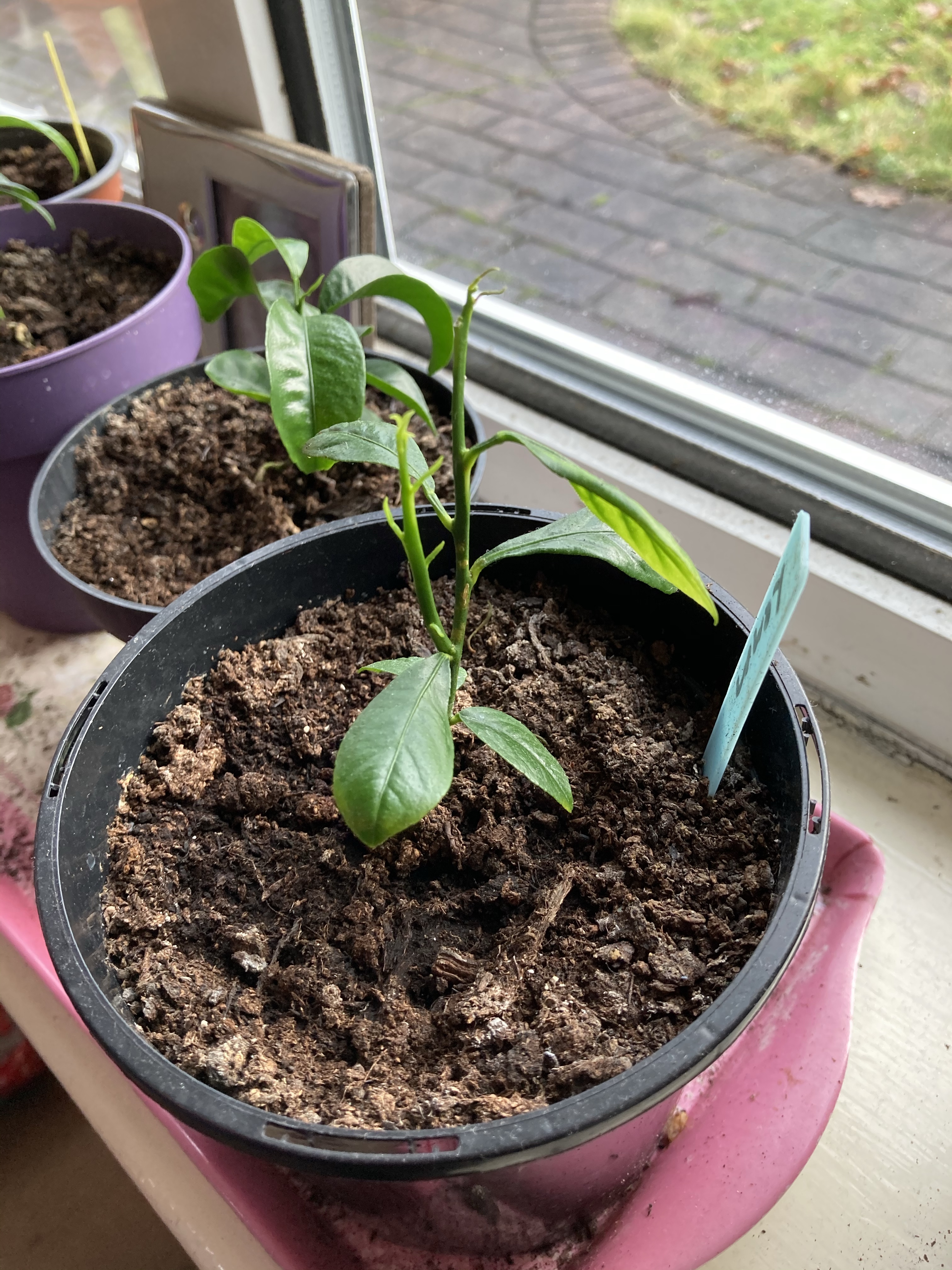 A few pictures of the Satsuma and Lemon saplings, which were some of the first things I started from pips early last year. Still very small, but as they are in big pots, I’m guessing there’s more going on under the soil than on top. The two taller ones are lemon.