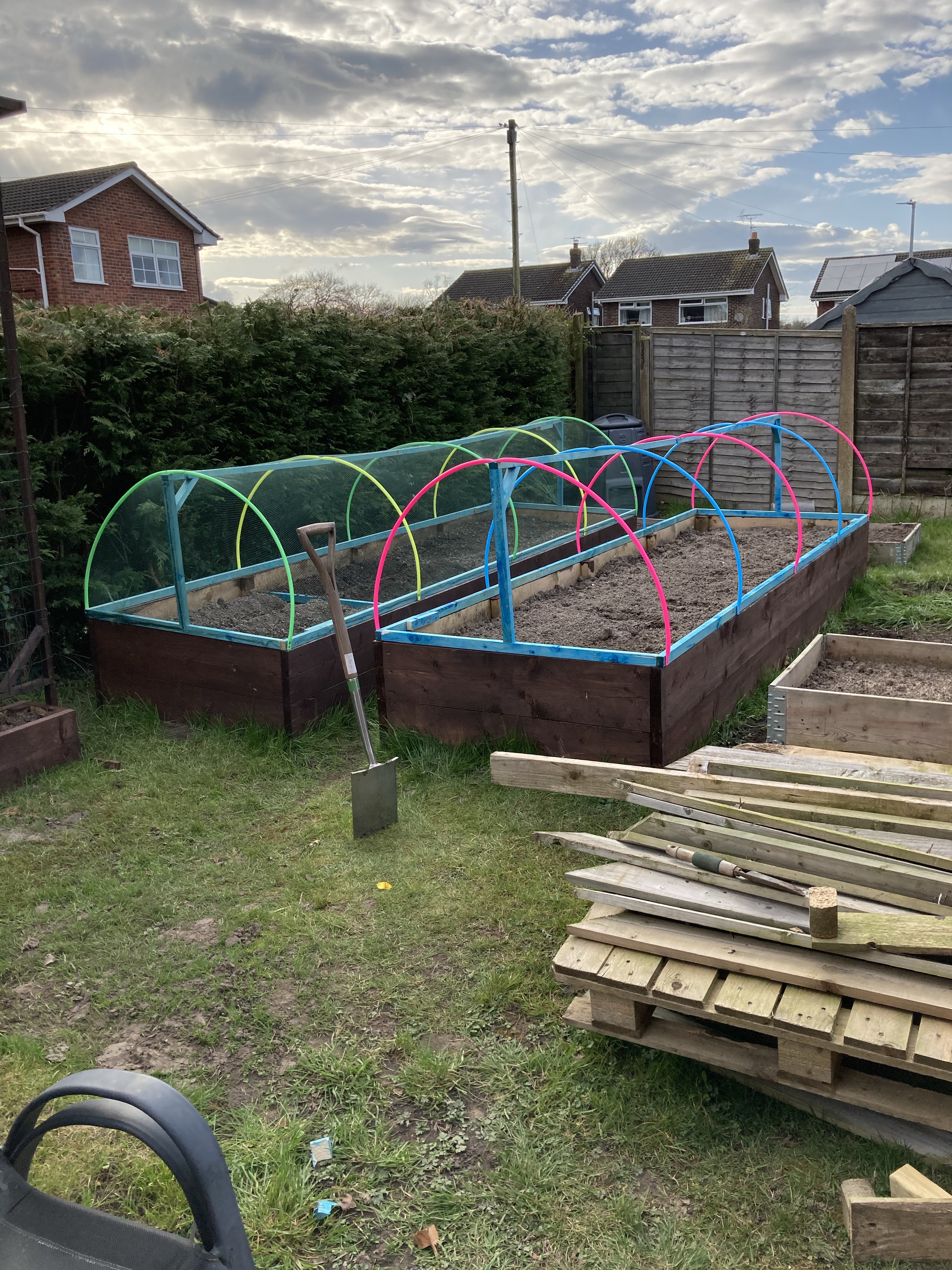 In one we have planted red onions, and already they are sprouting up, we have a second pallet collar bed ready for broccoli this too will be netted, frame is built and once netted ready to go.