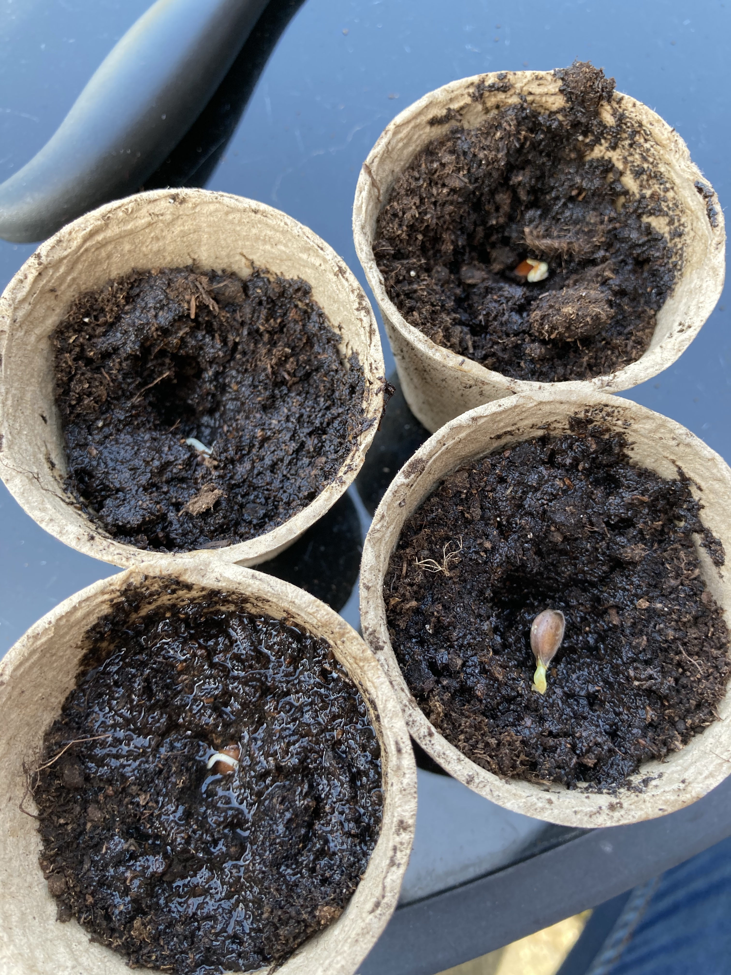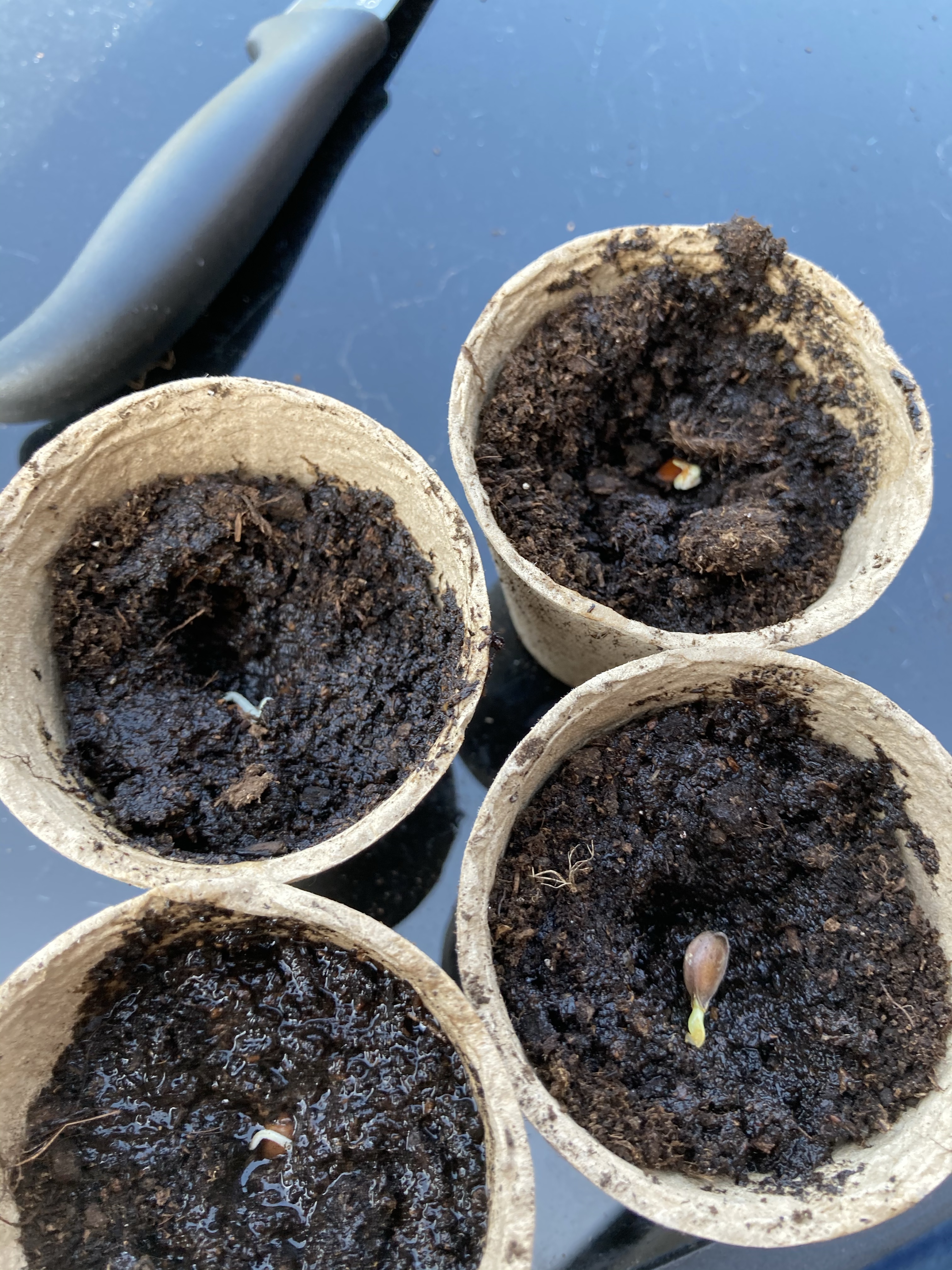 I thought ooooo the pip is sprouting inside what a bonus. So I cut it open and there were 4! So as usual I can’t resist planting them to see if they will grow.