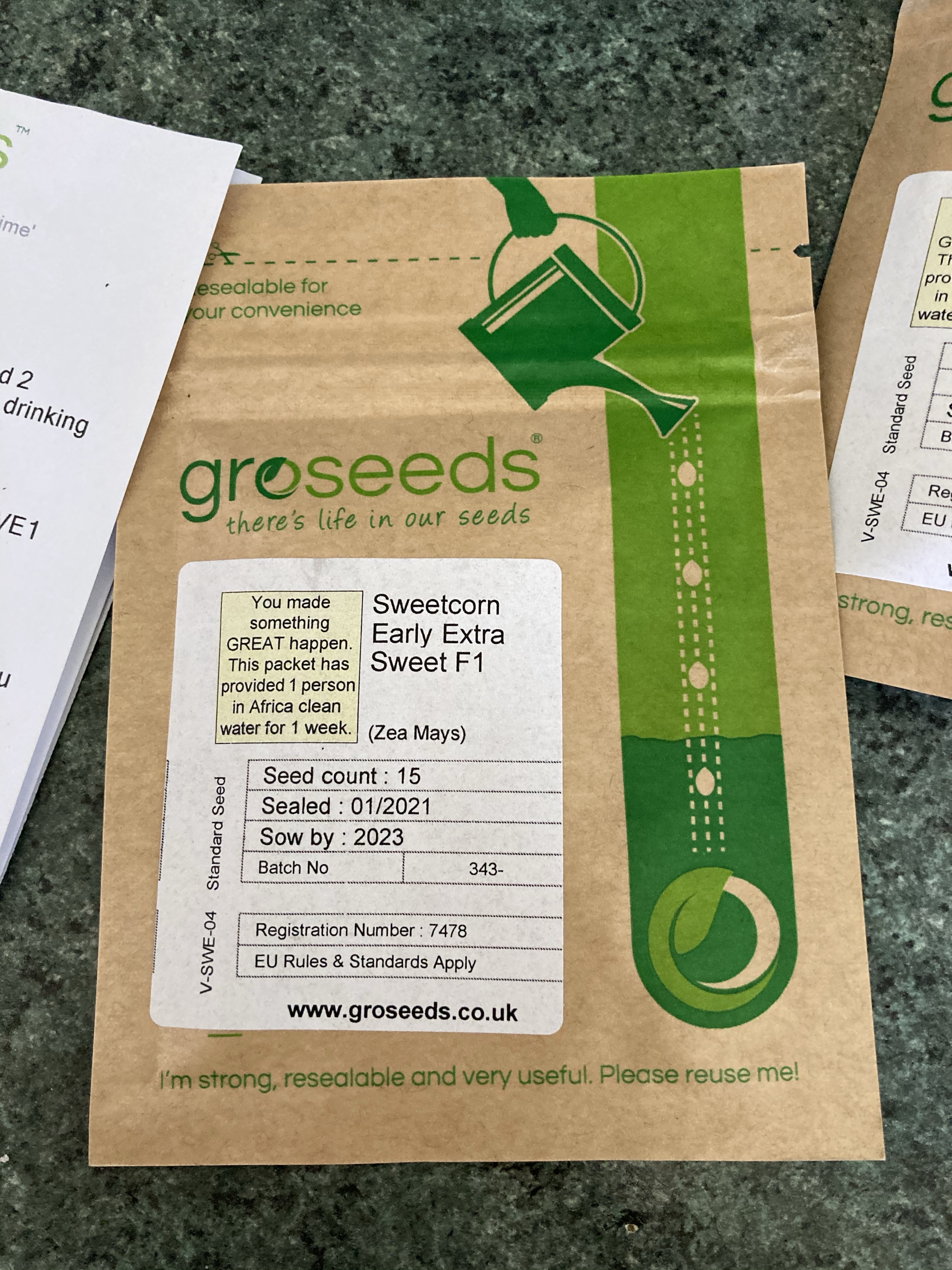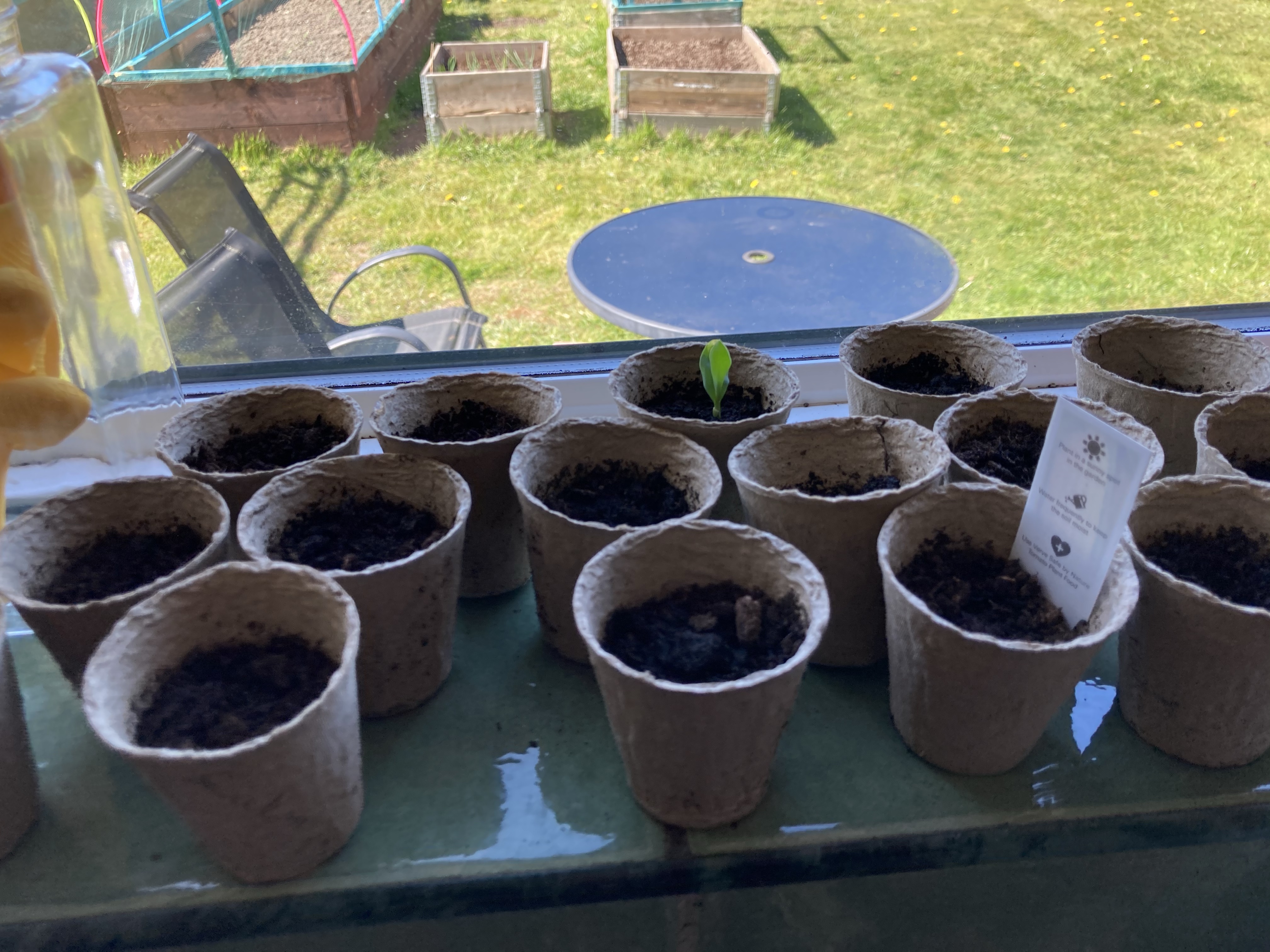 The sweetcorn that We started off hadn’t grown at all. We had 2 from last years seeds, that were growing but the new ones we had bought from B&Q weren’t doing a thing. So after taking a look to see what was happening under the soil I knew that none of them were germinating. So I ordered some more seeds from the same place I got them last year. I wish I had got them from there in the first place considering the message I received with the seeds. They are all potted up again and hopefully they will do a little better.
