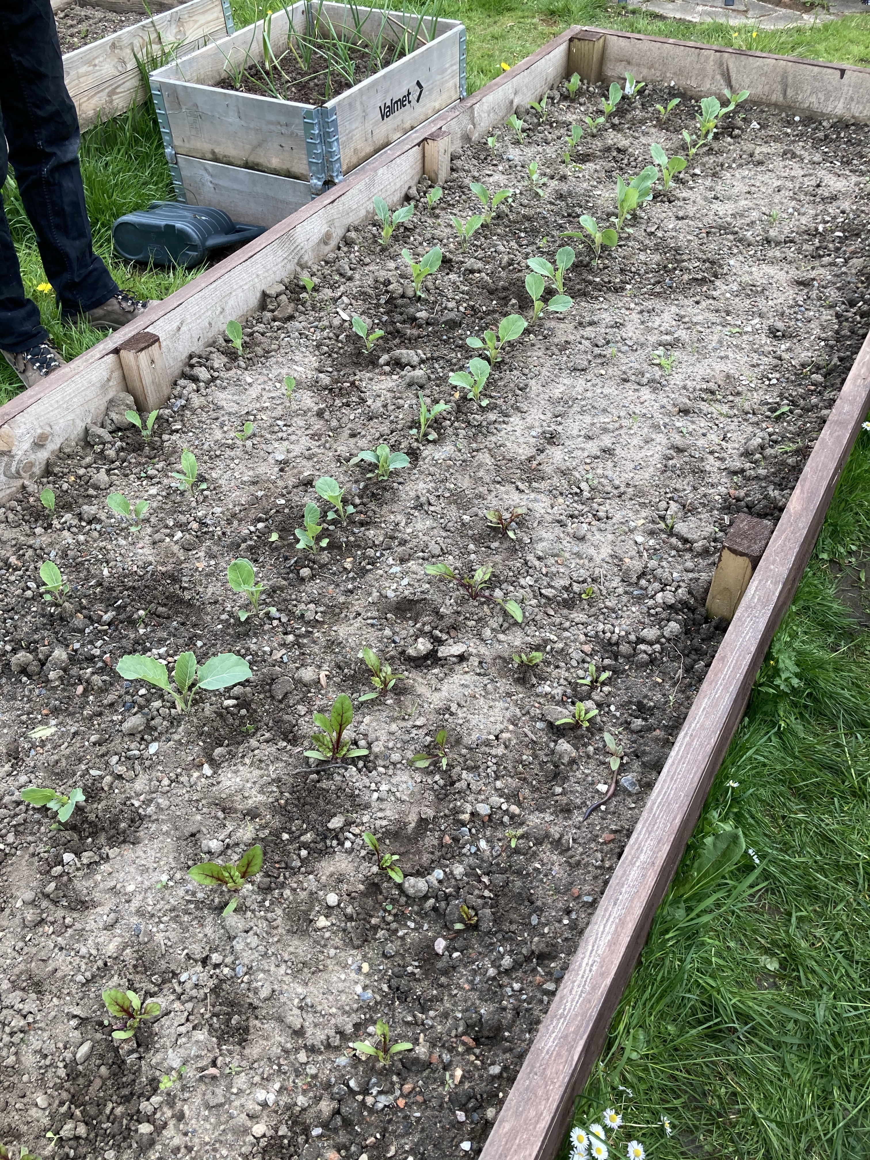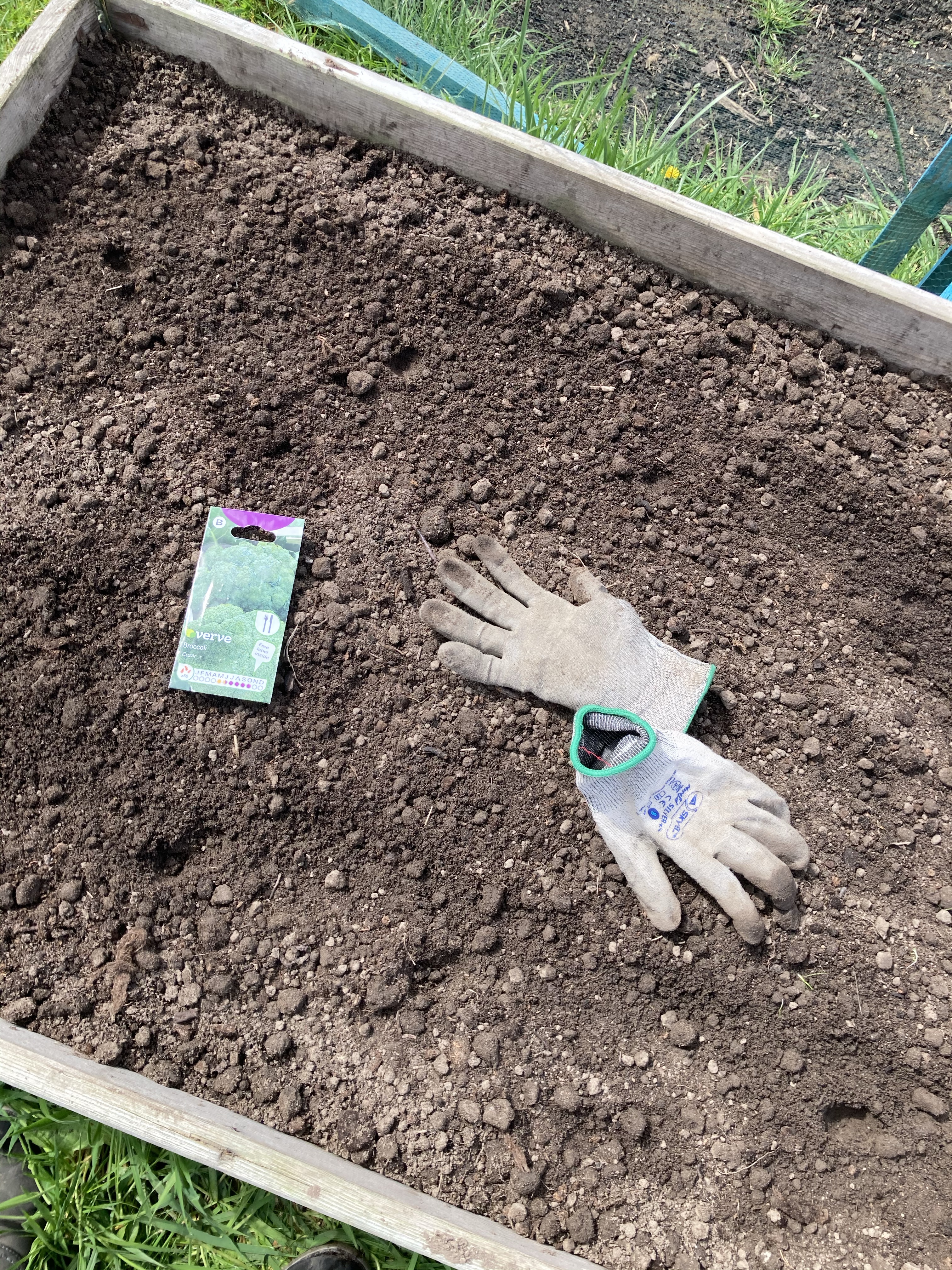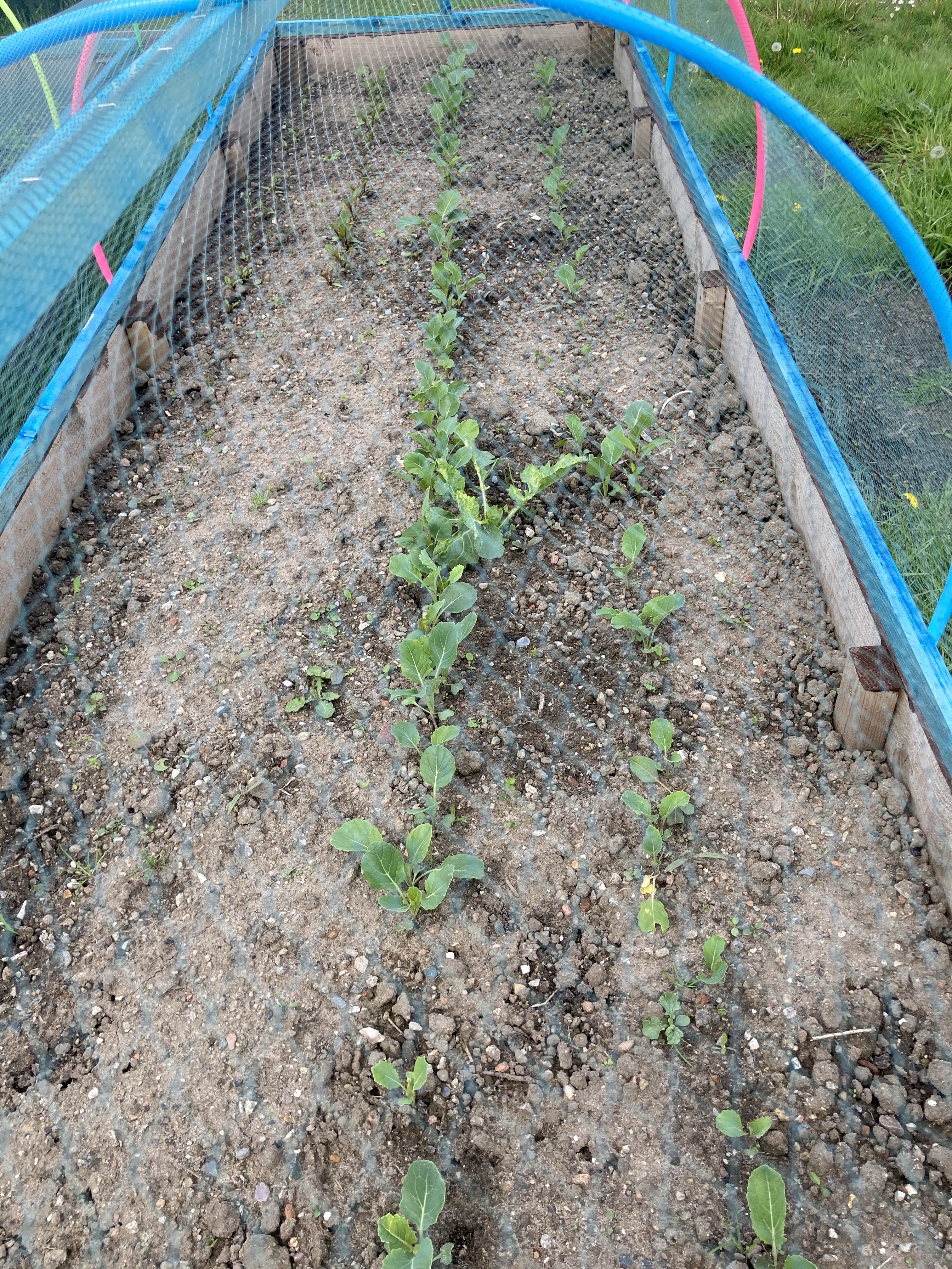 The broccoli was planted out a few weeks ago and has now started to sprout. We used a separate raised bed with the wooden frame with netting. So fingers crossed for a better crop with no caterpillars eating them to nothing.