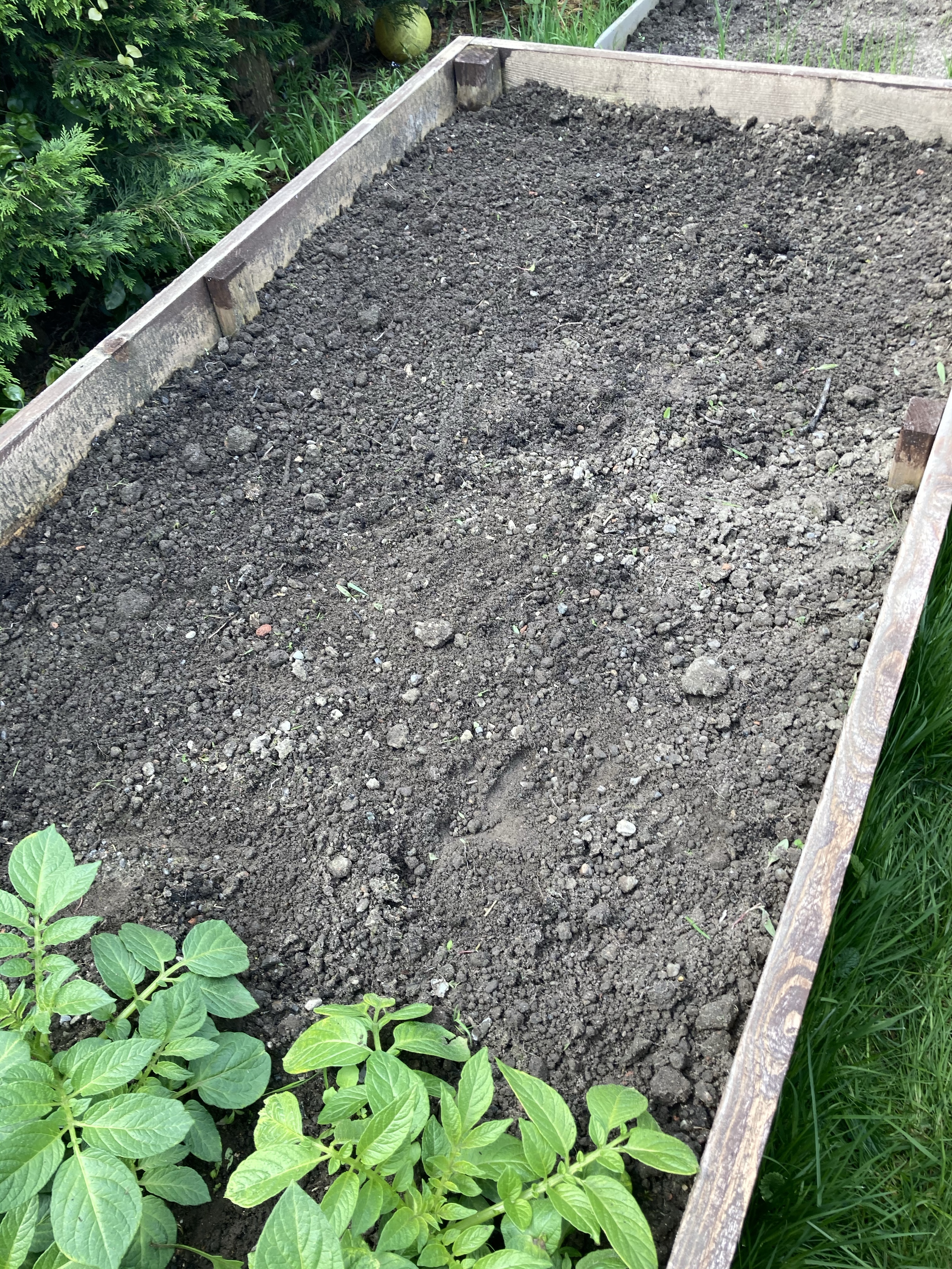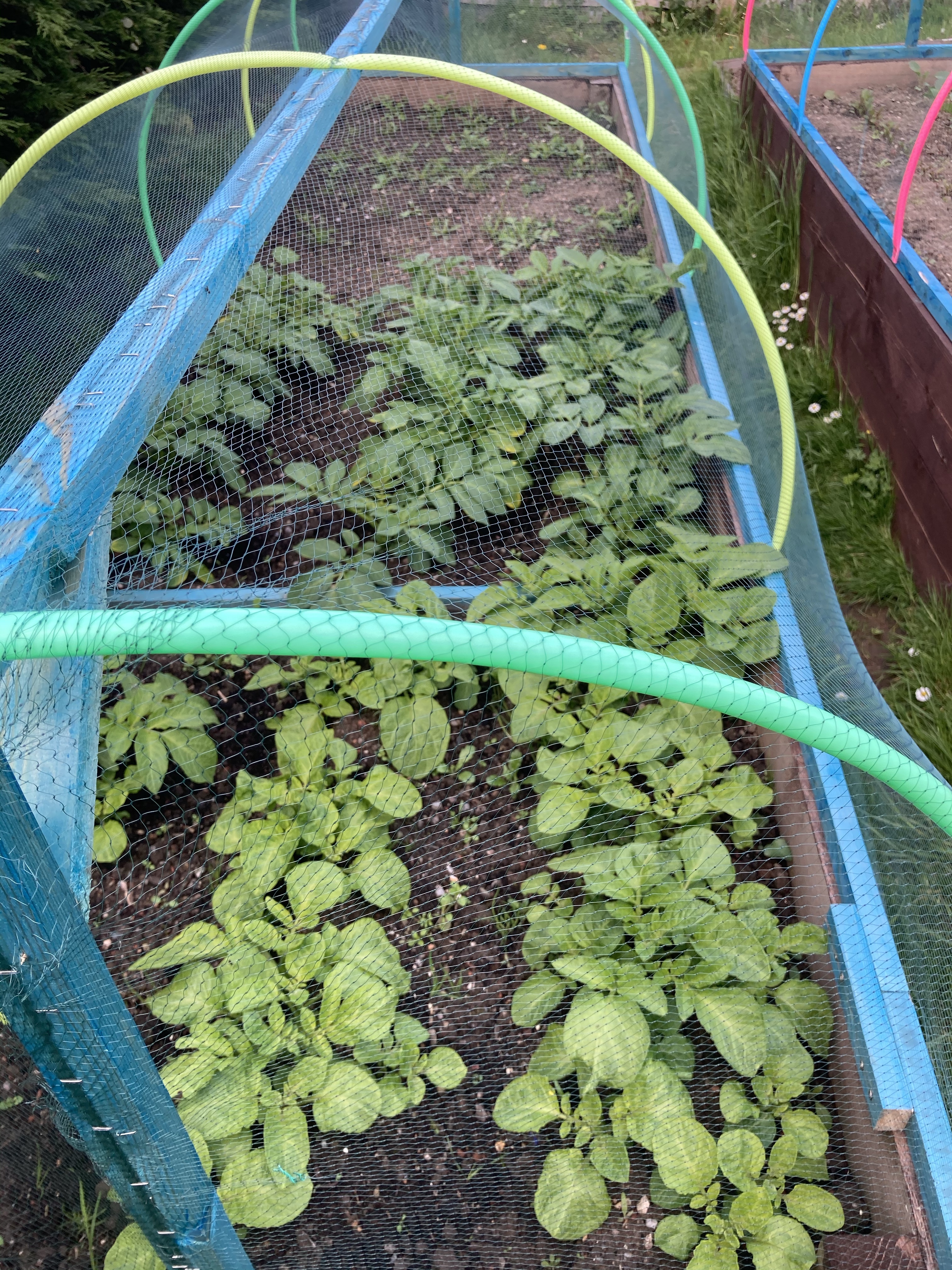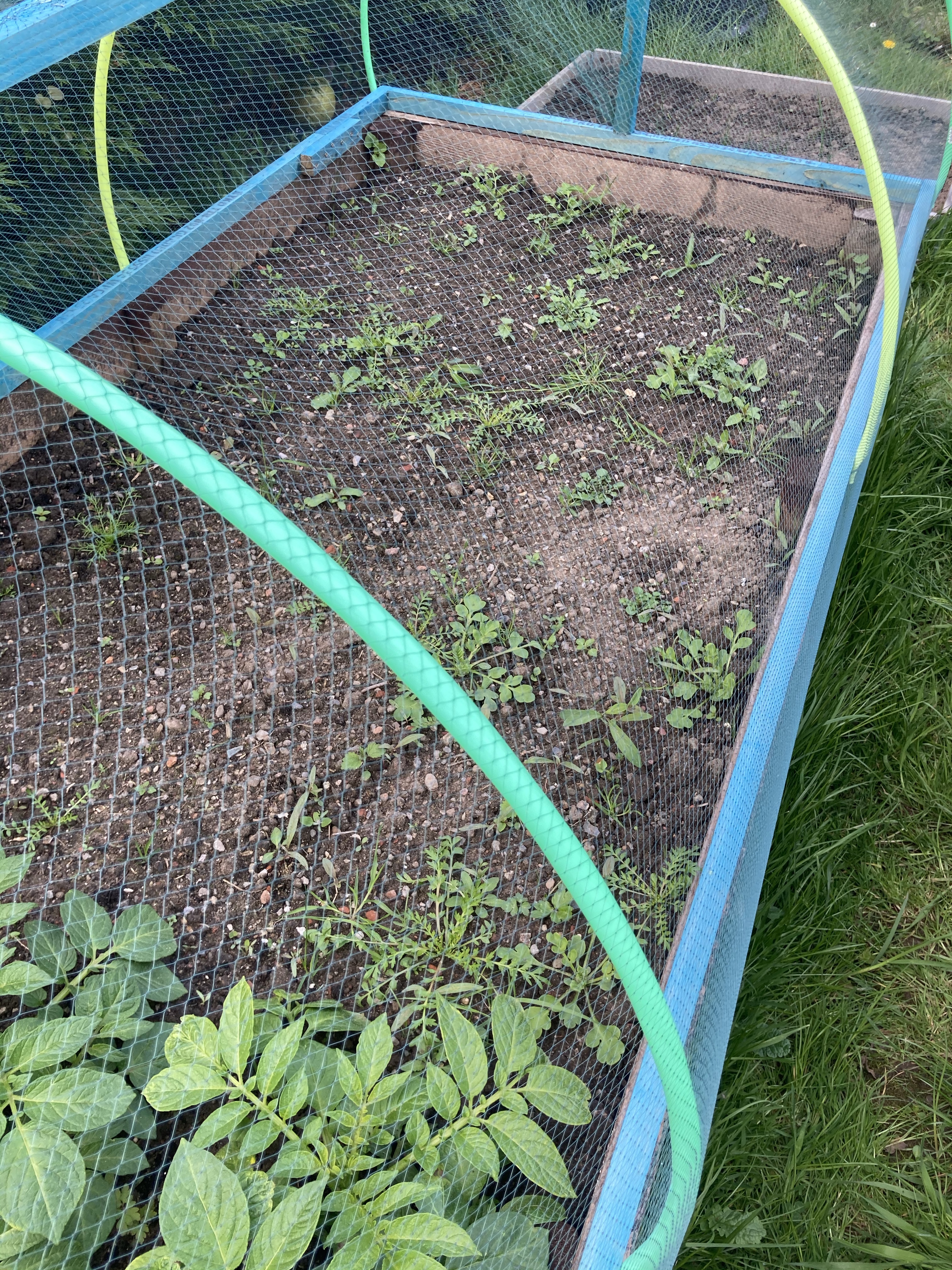 The broccoli was planted out a few weeks ago and has now started to sprout. We used a separate raised bed with the wooden frame with netting. So fingers crossed for a better crop with no caterpillars eating them to nothing.