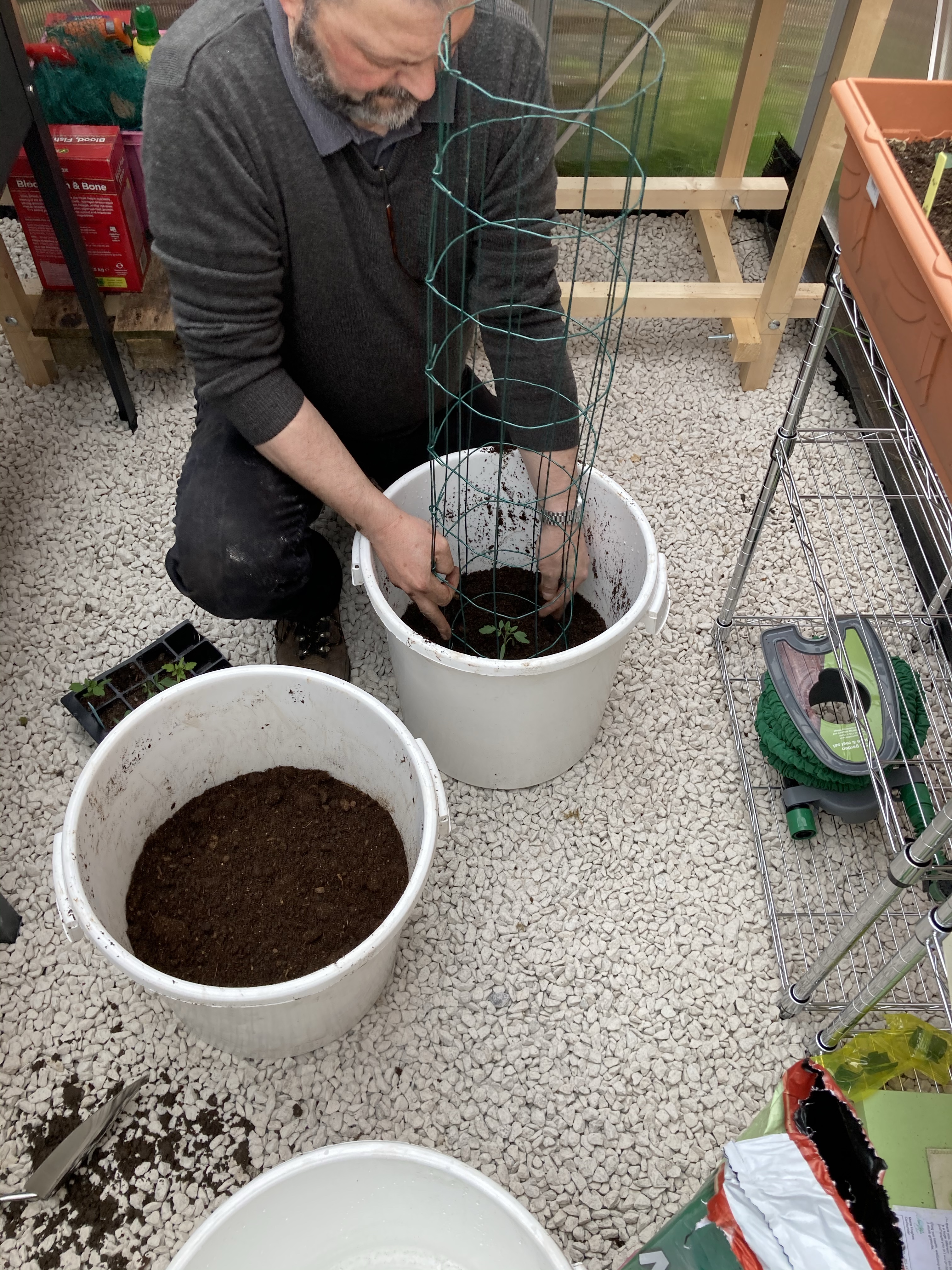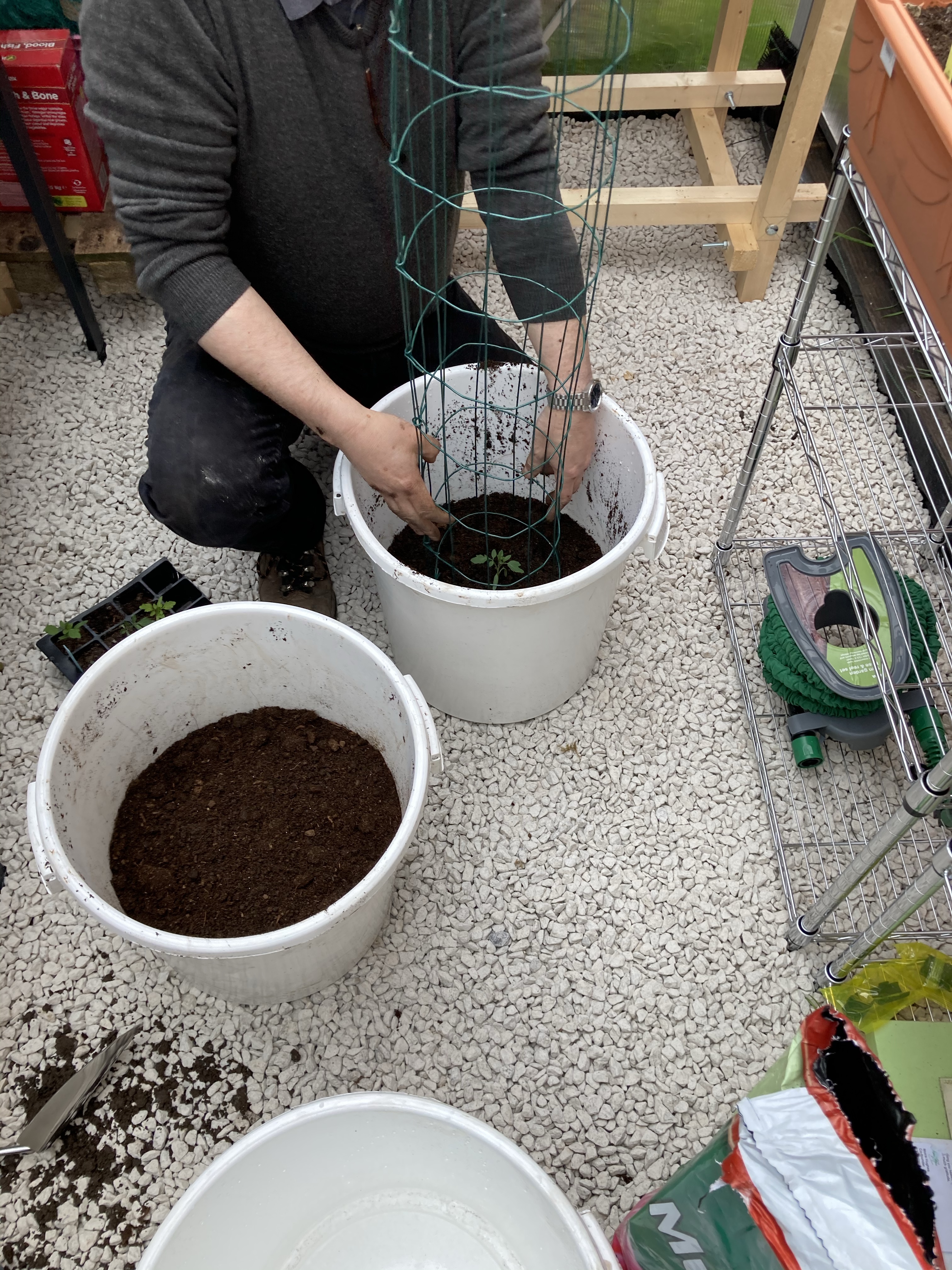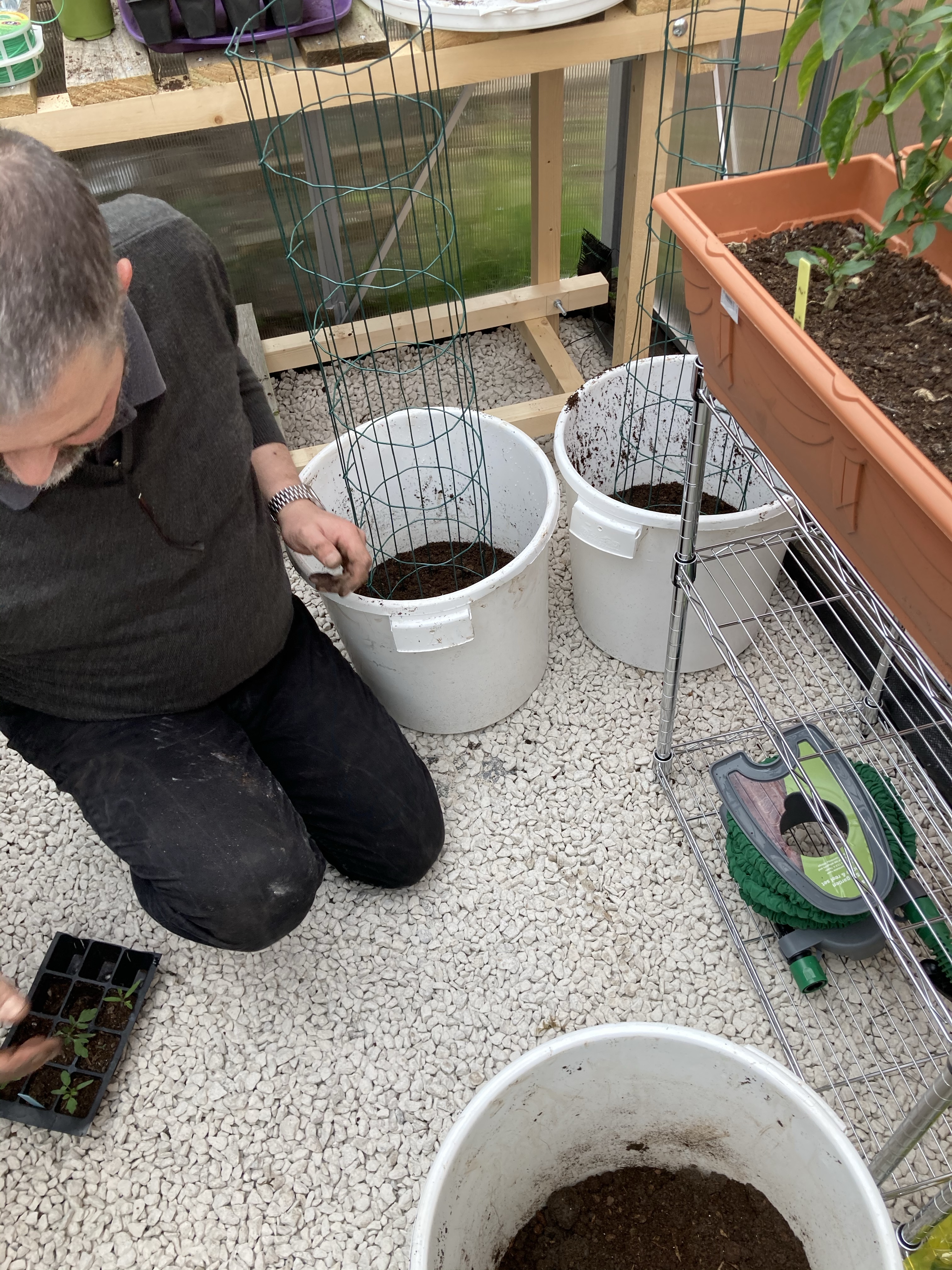 We then headed off into the greenhouse to repot our Cherry Tomatoes and Cucumbers. We used some buckets and Tony fashioned supports with the wire we had bought for the pea trellis.