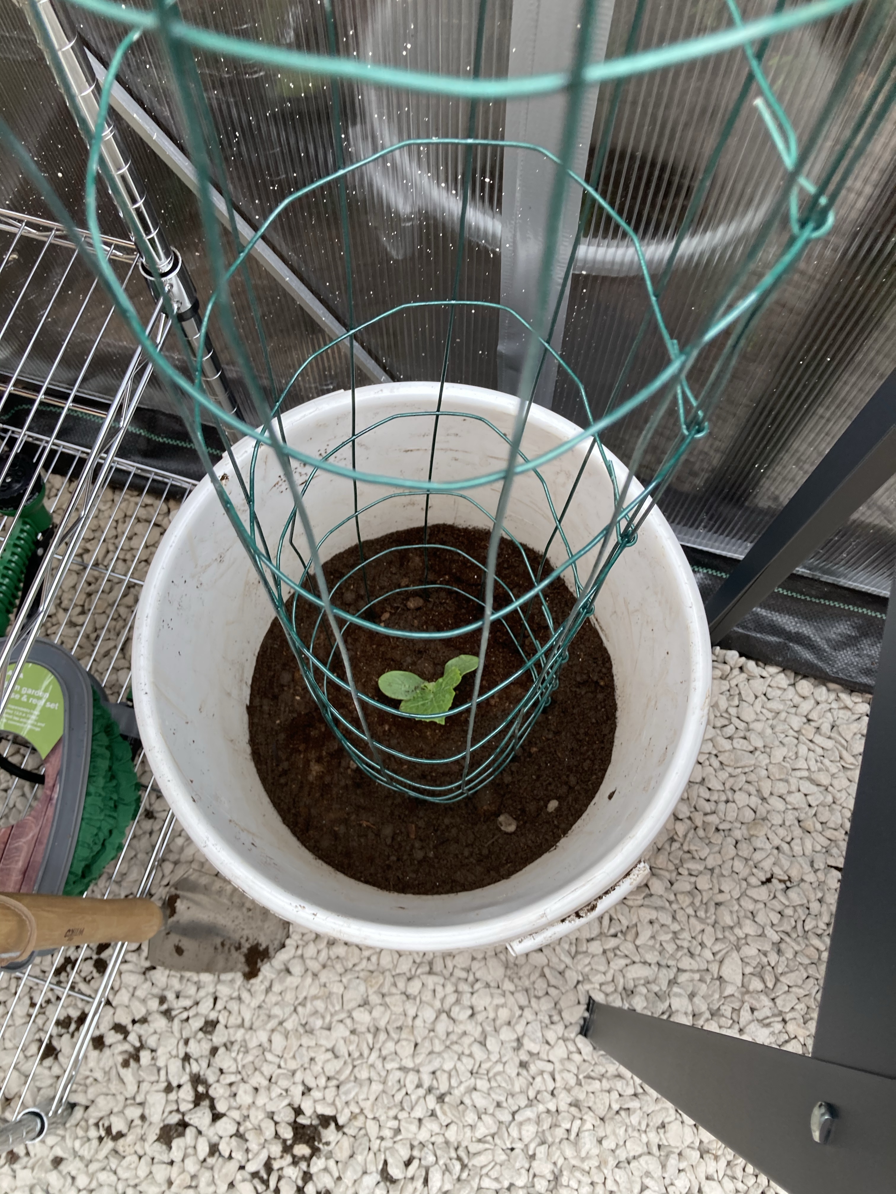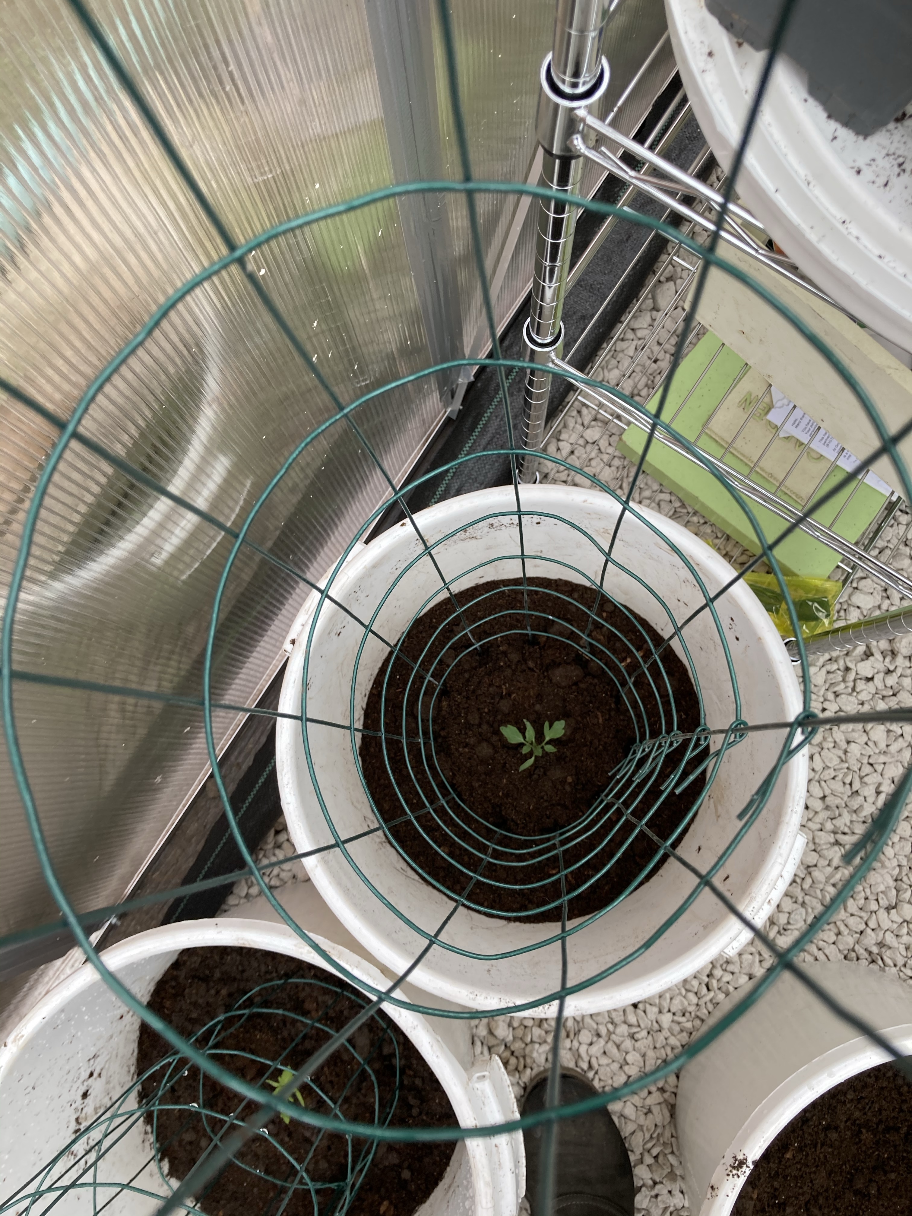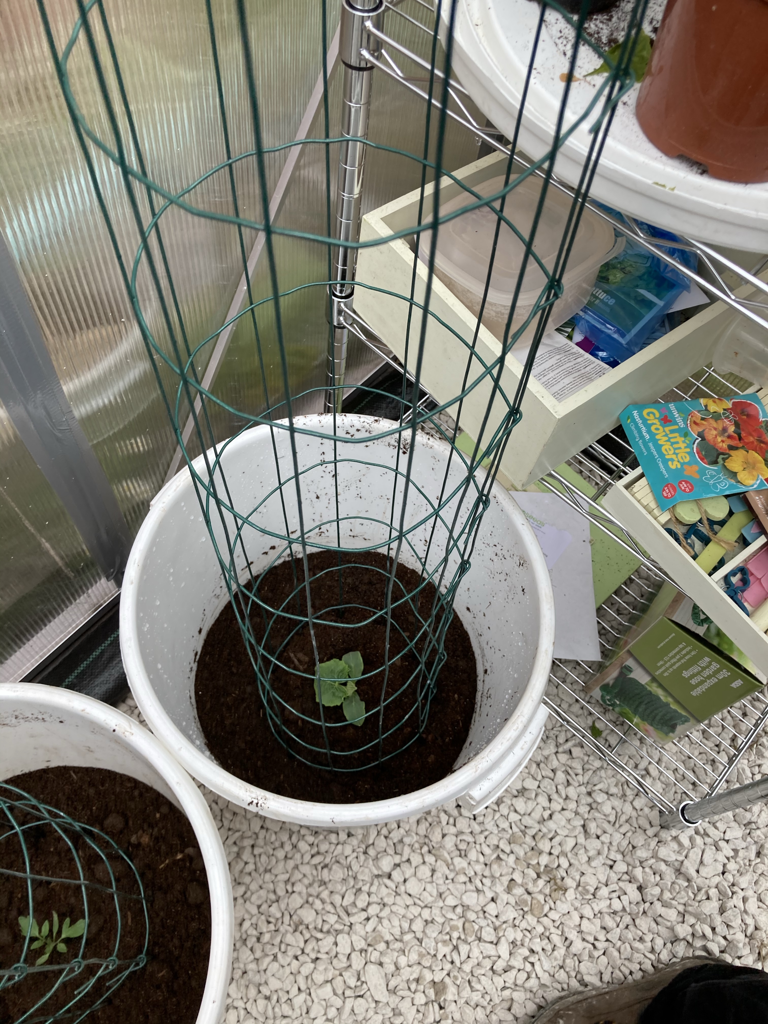 We then headed off into the greenhouse to repot our Cherry Tomatoes and Cucumbers. We used some buckets and Tony fashioned supports with the wire we had bought for the pea trellis.