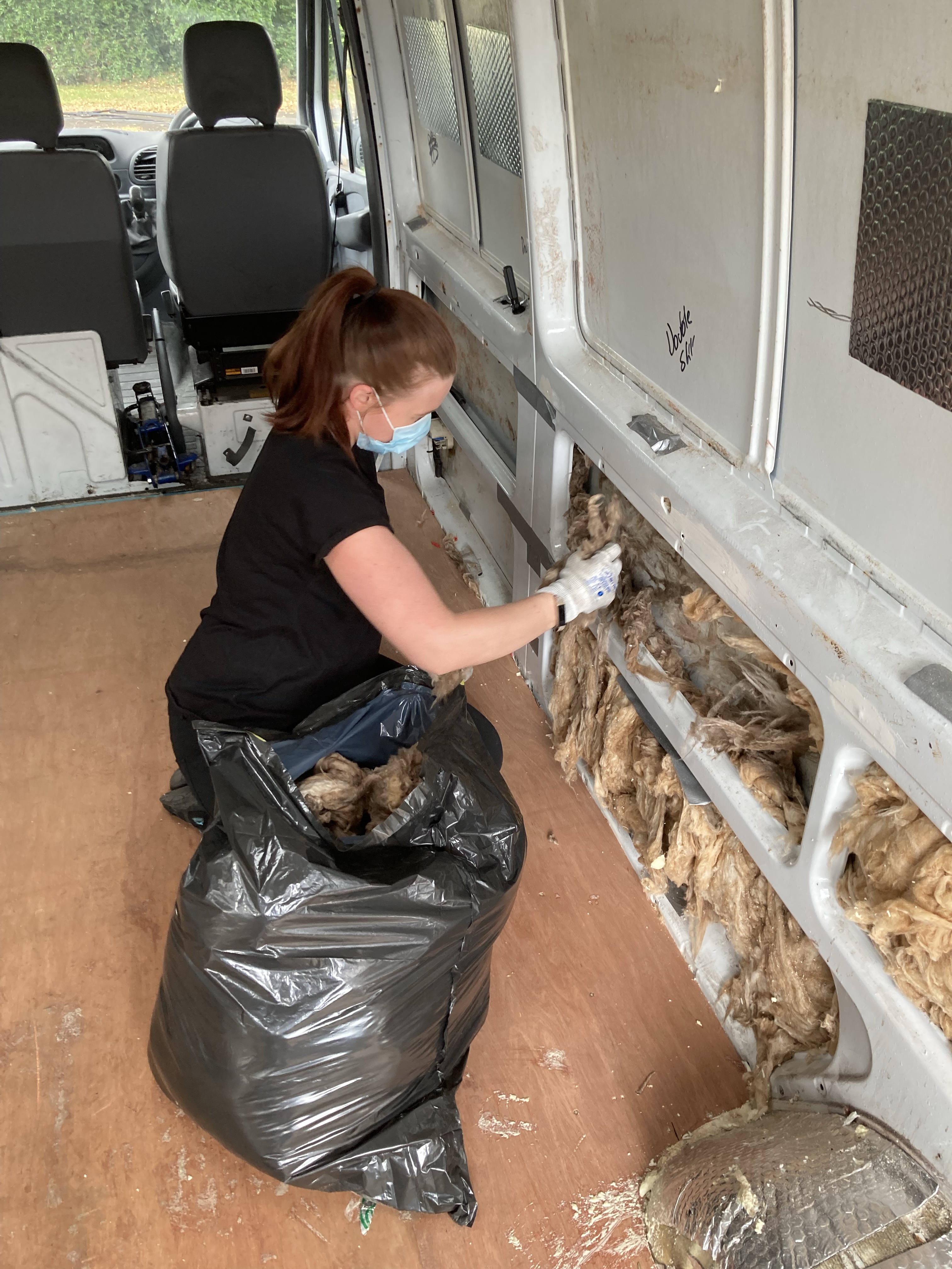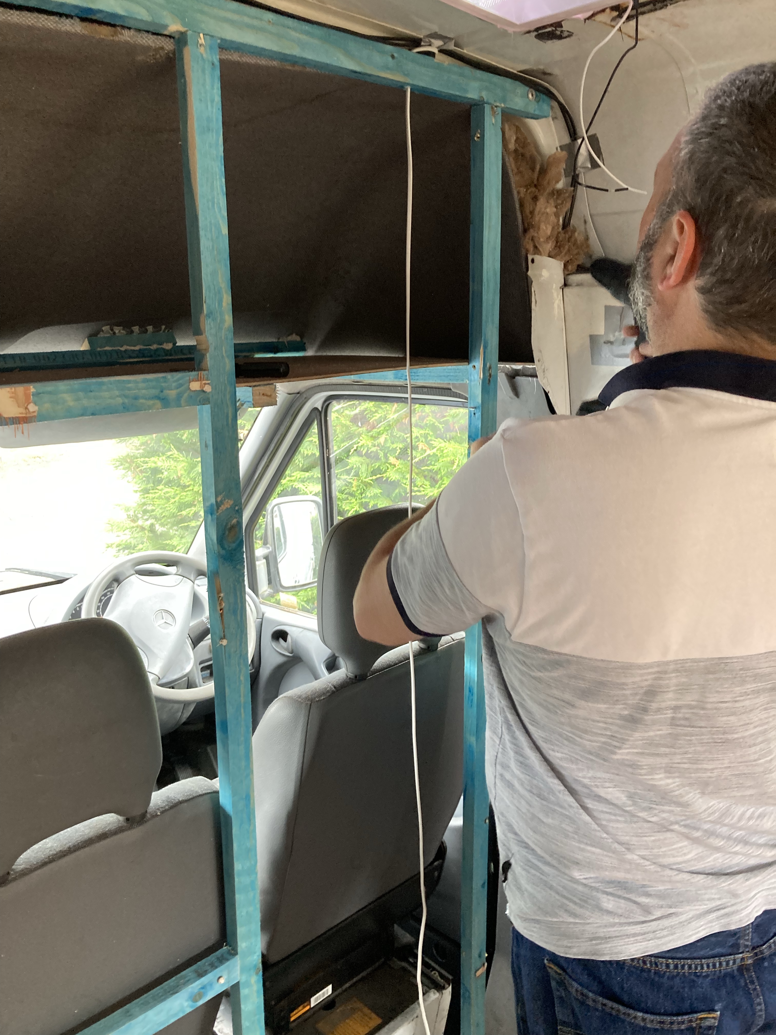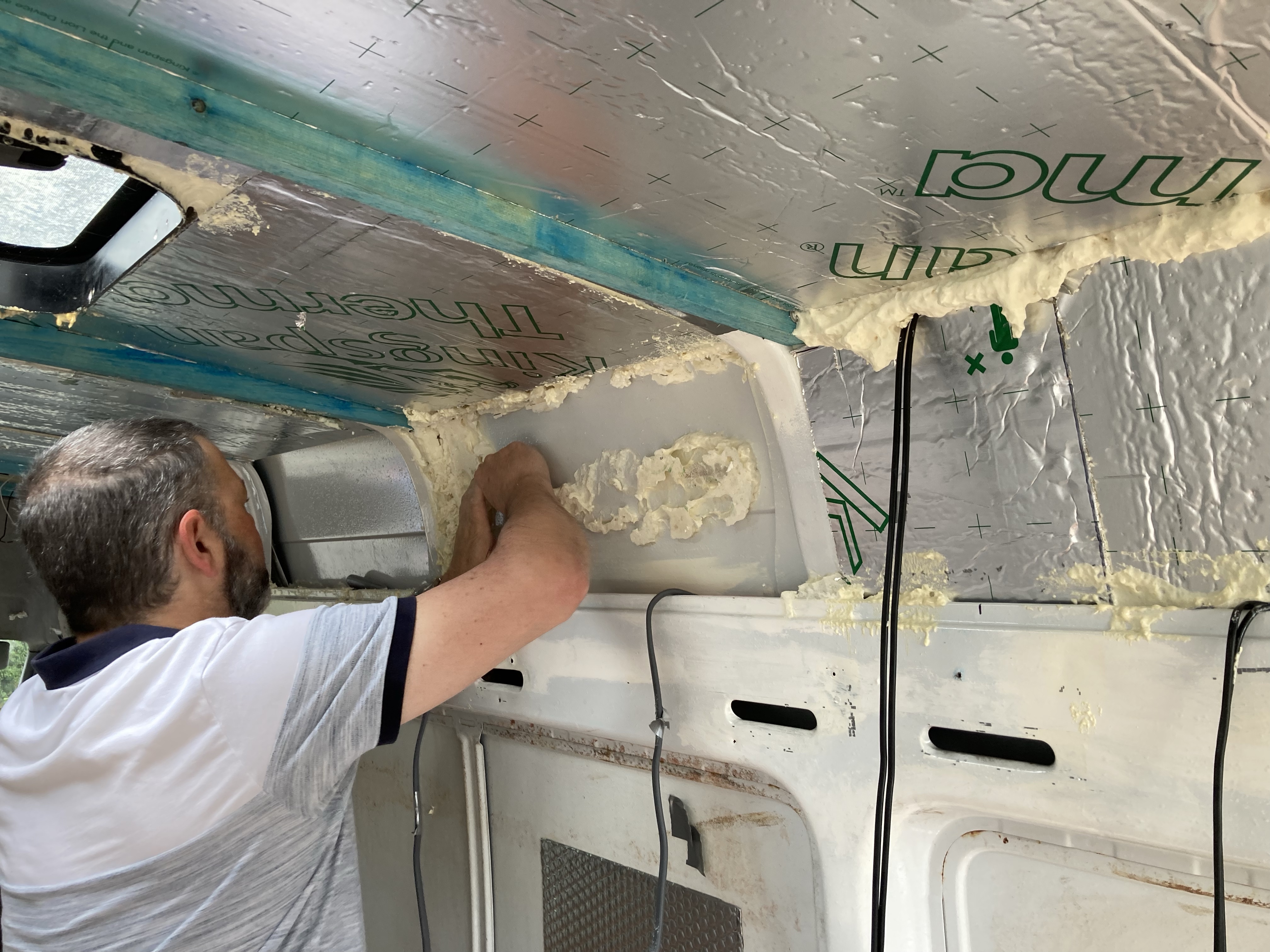 We started by taking out the panels and batons behind the drivers seats because we plan to have swivel chairs to be able to incorporate them into the seating. While removing the batons and insulation on the ceiling of the van, we realised that a lot of things were stuck with silicone and expanding foam, there was also duct tape everywhere. There was a lot of rust and bare metal, so we knew that it needed to be treated.