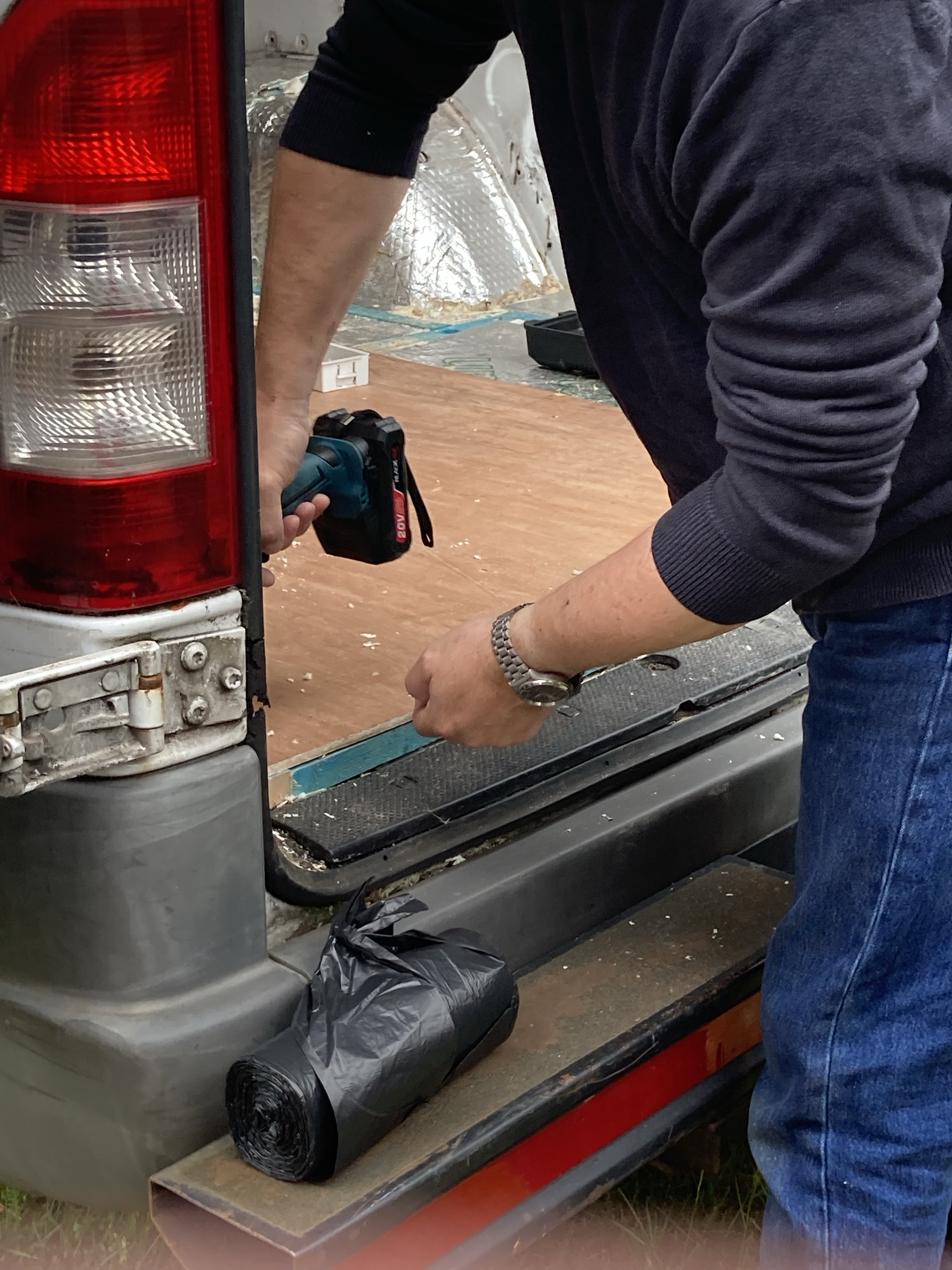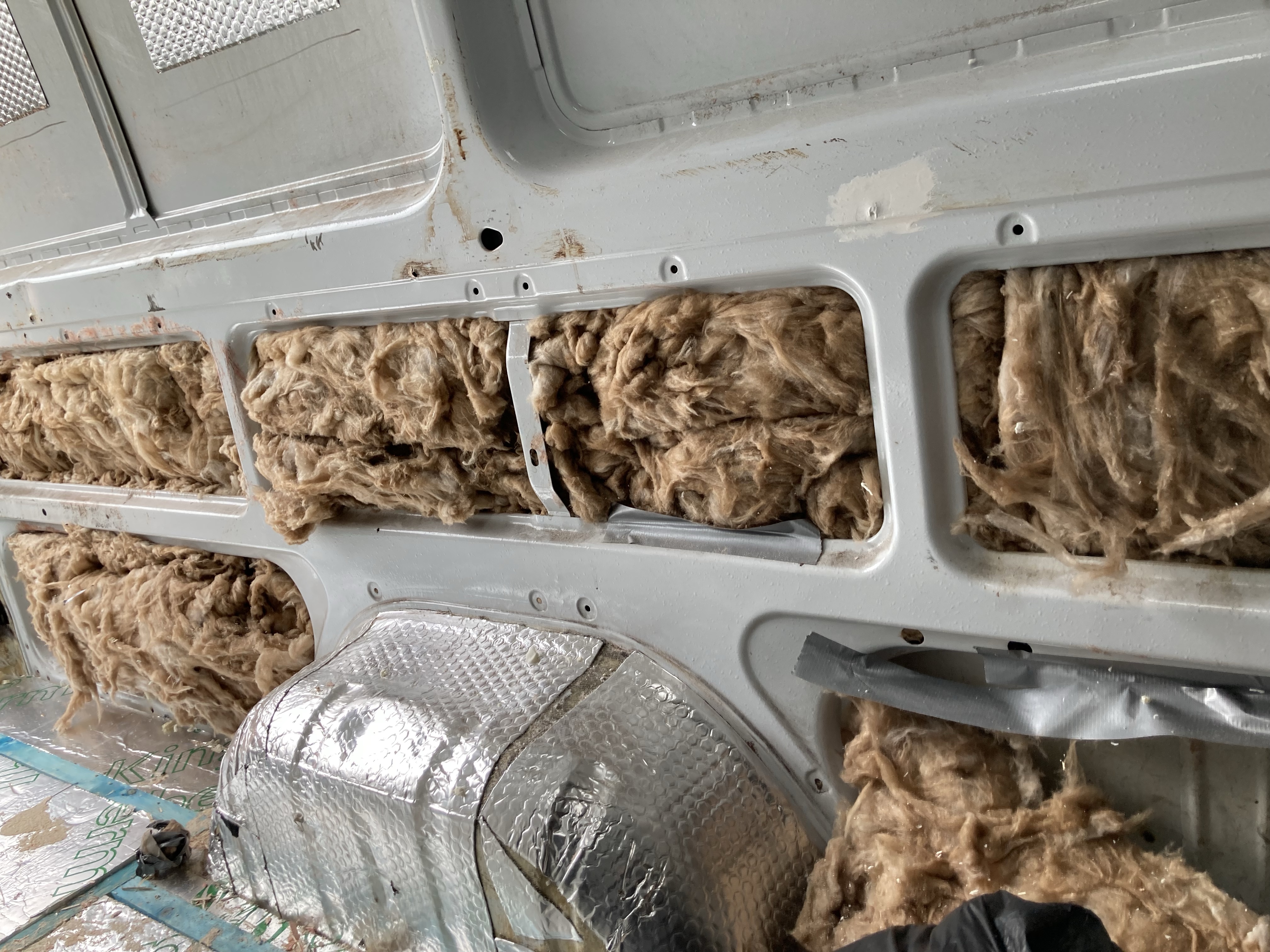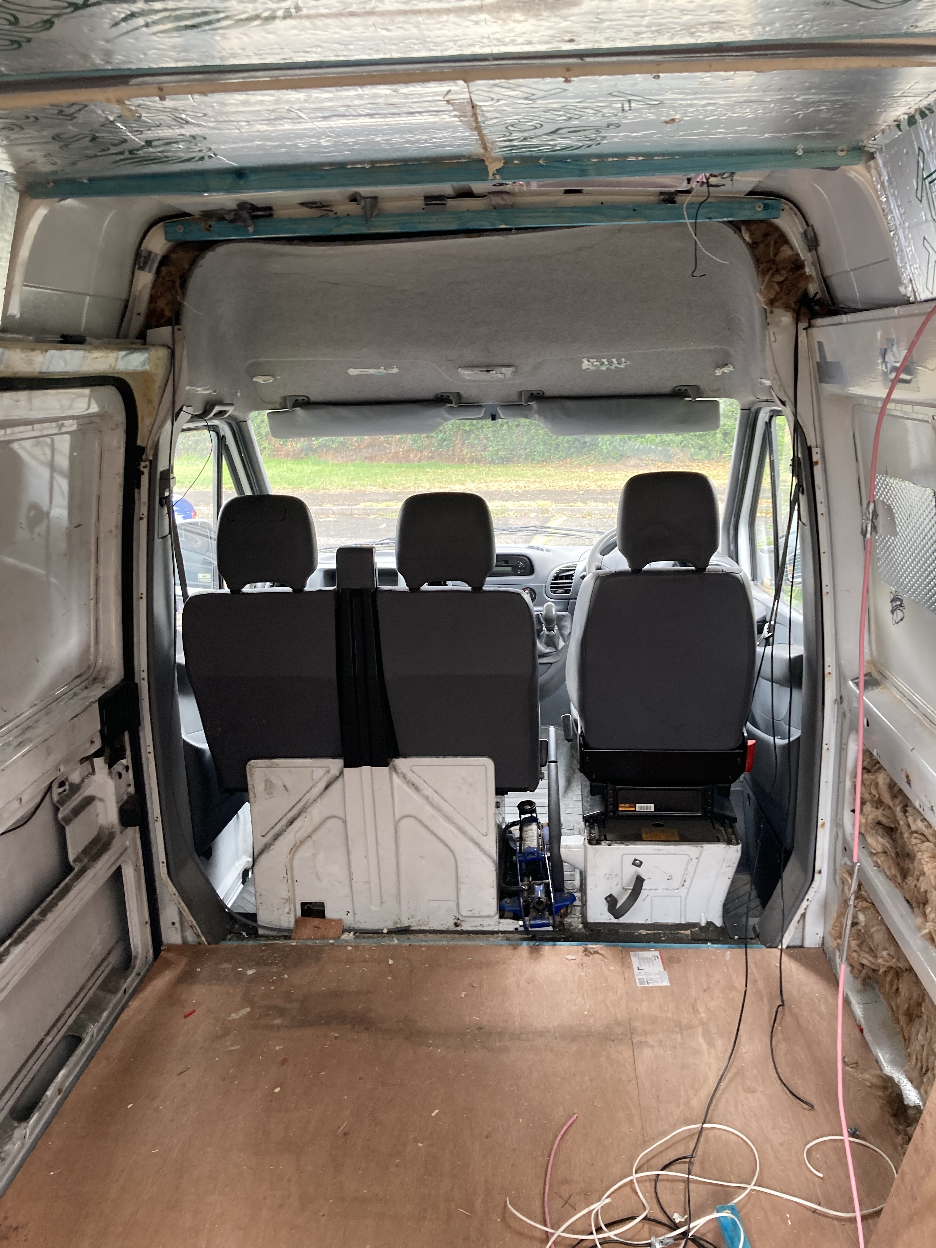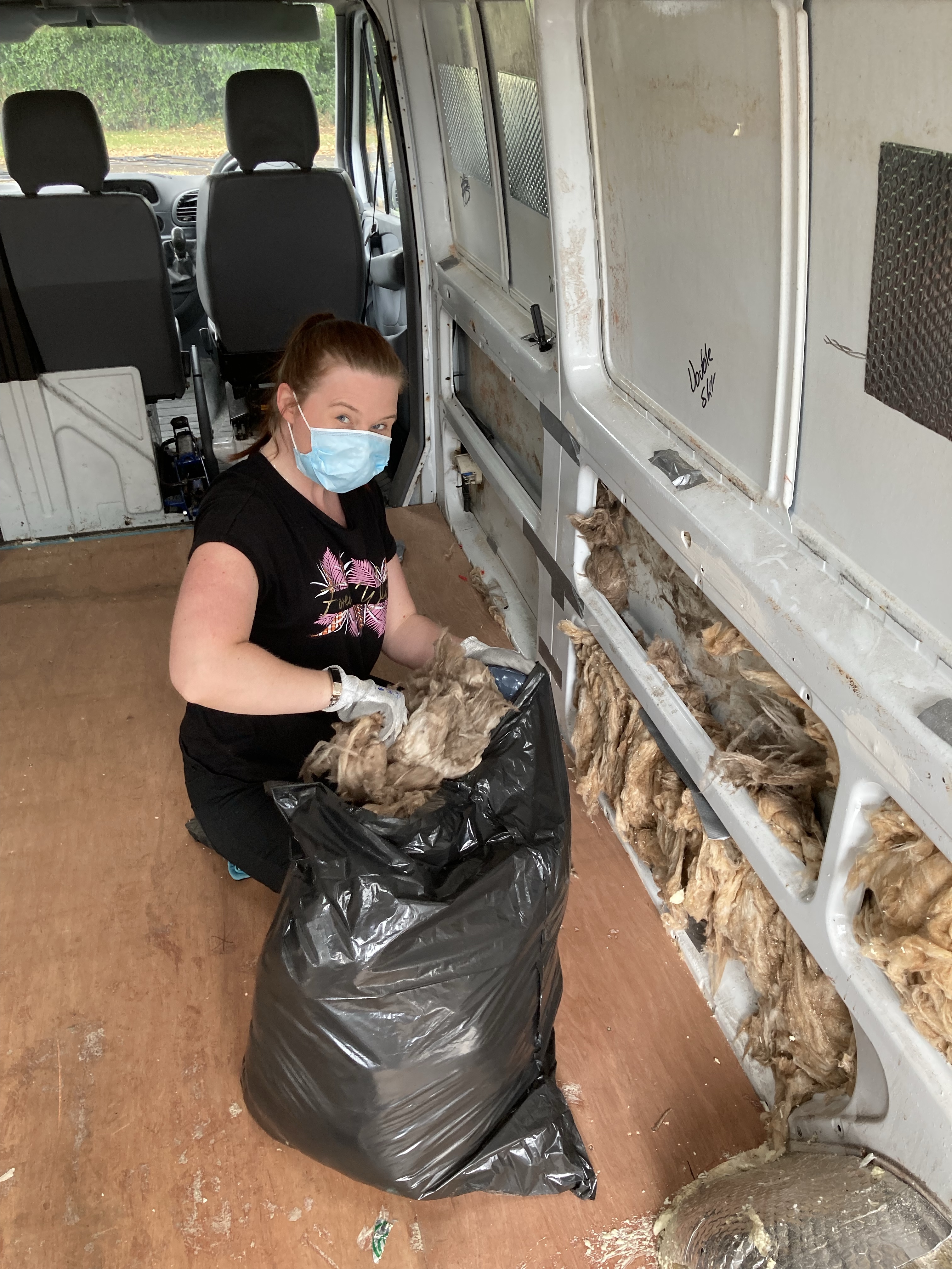 We started by taking out the panels and batons behind the drivers seats because we plan to have swivel chairs to be able to incorporate them into the seating. While removing the batons and insulation on the ceiling of the van, we realised that a lot of things were stuck with silicone and expanding foam, there was also duct tape everywhere. There was a lot of rust and bare metal, so we knew that it needed to be treated.