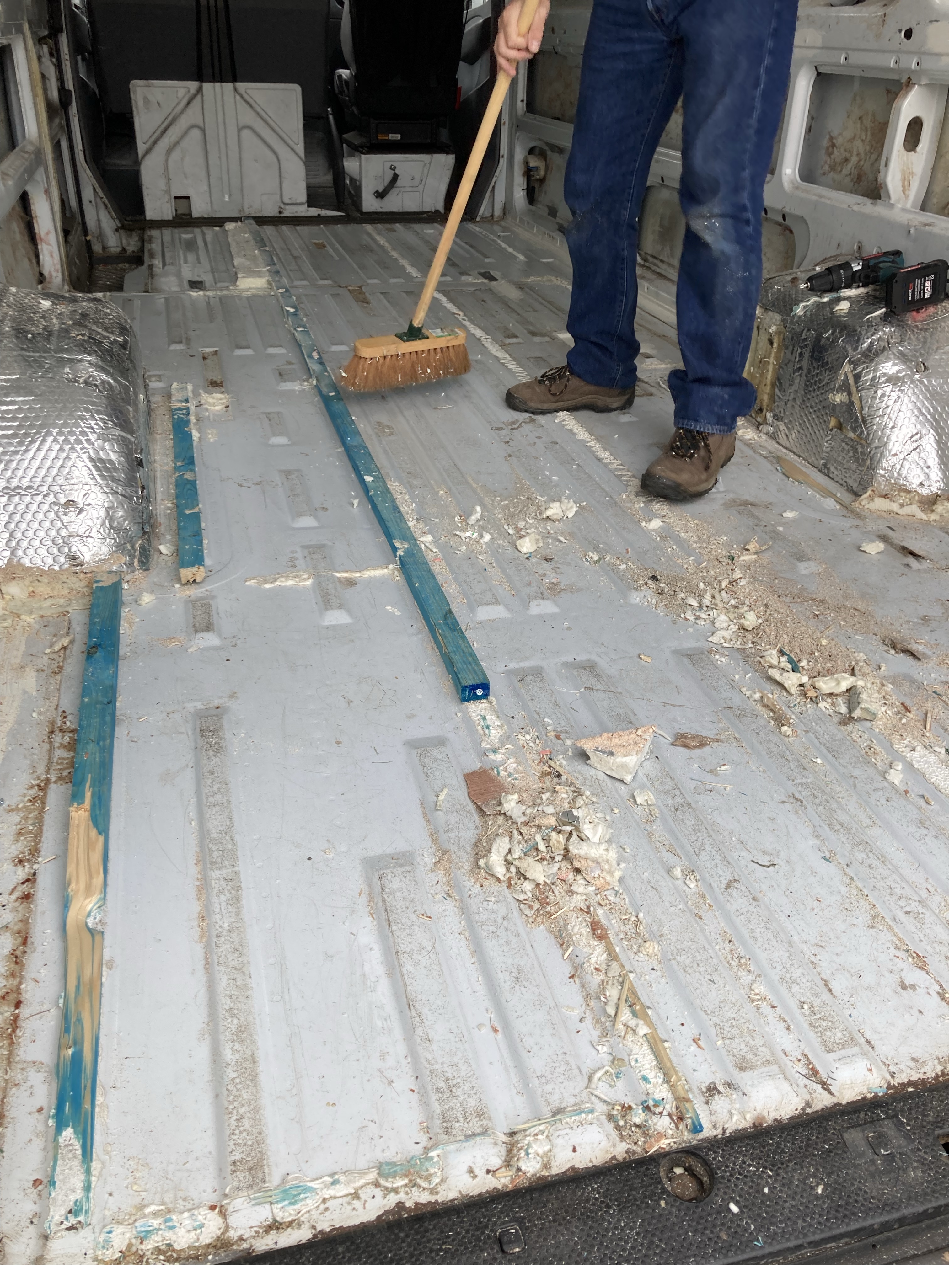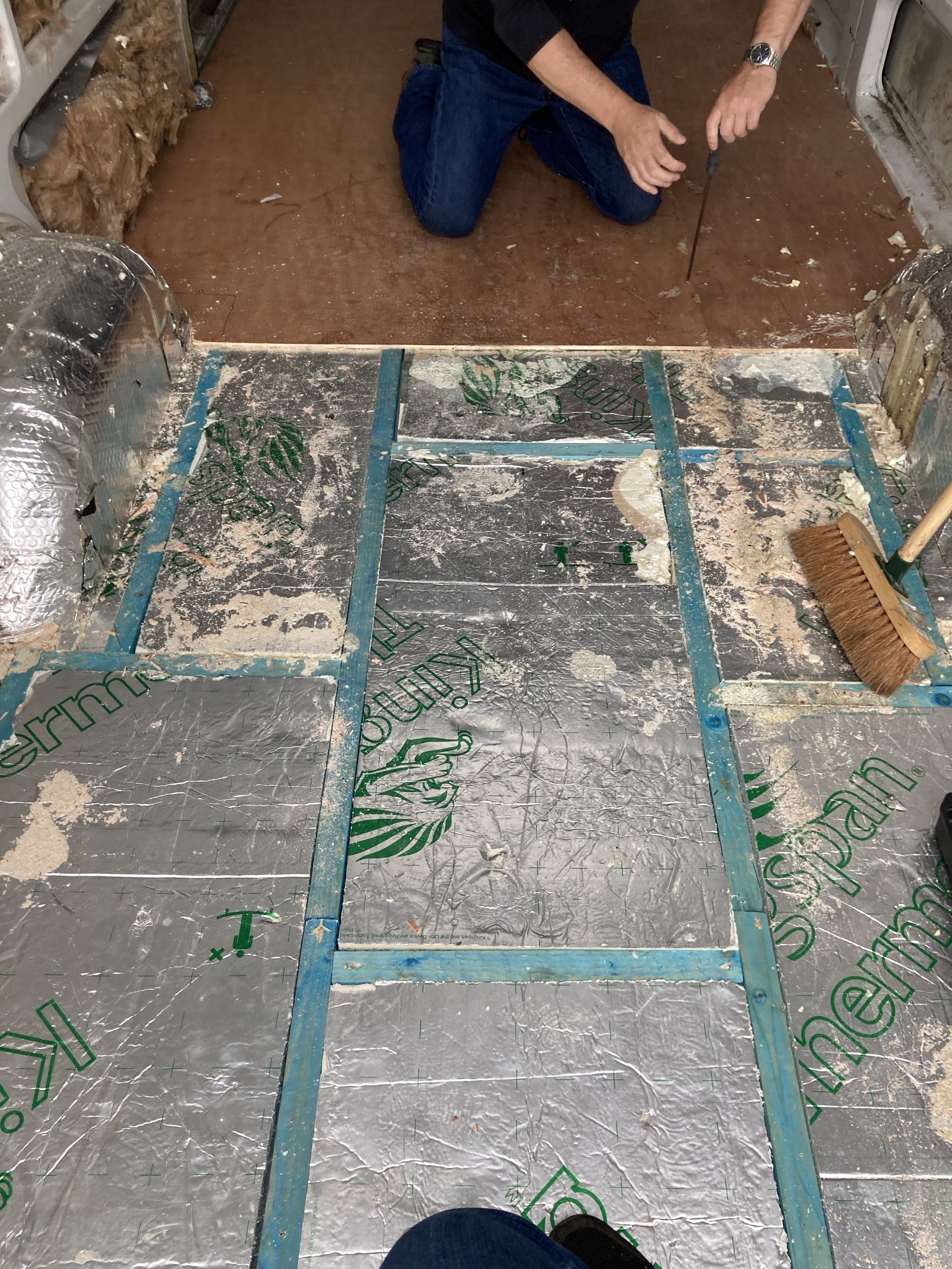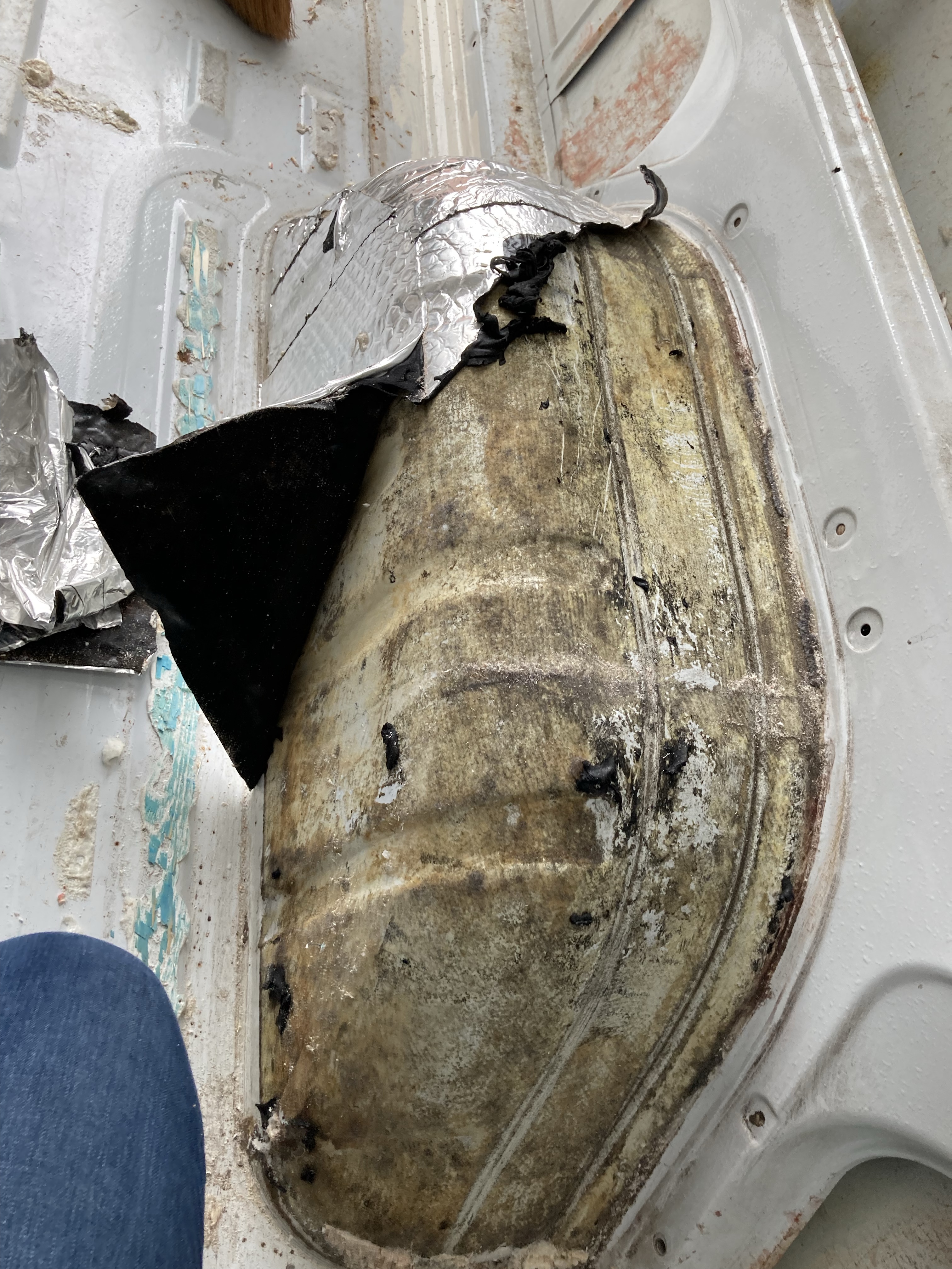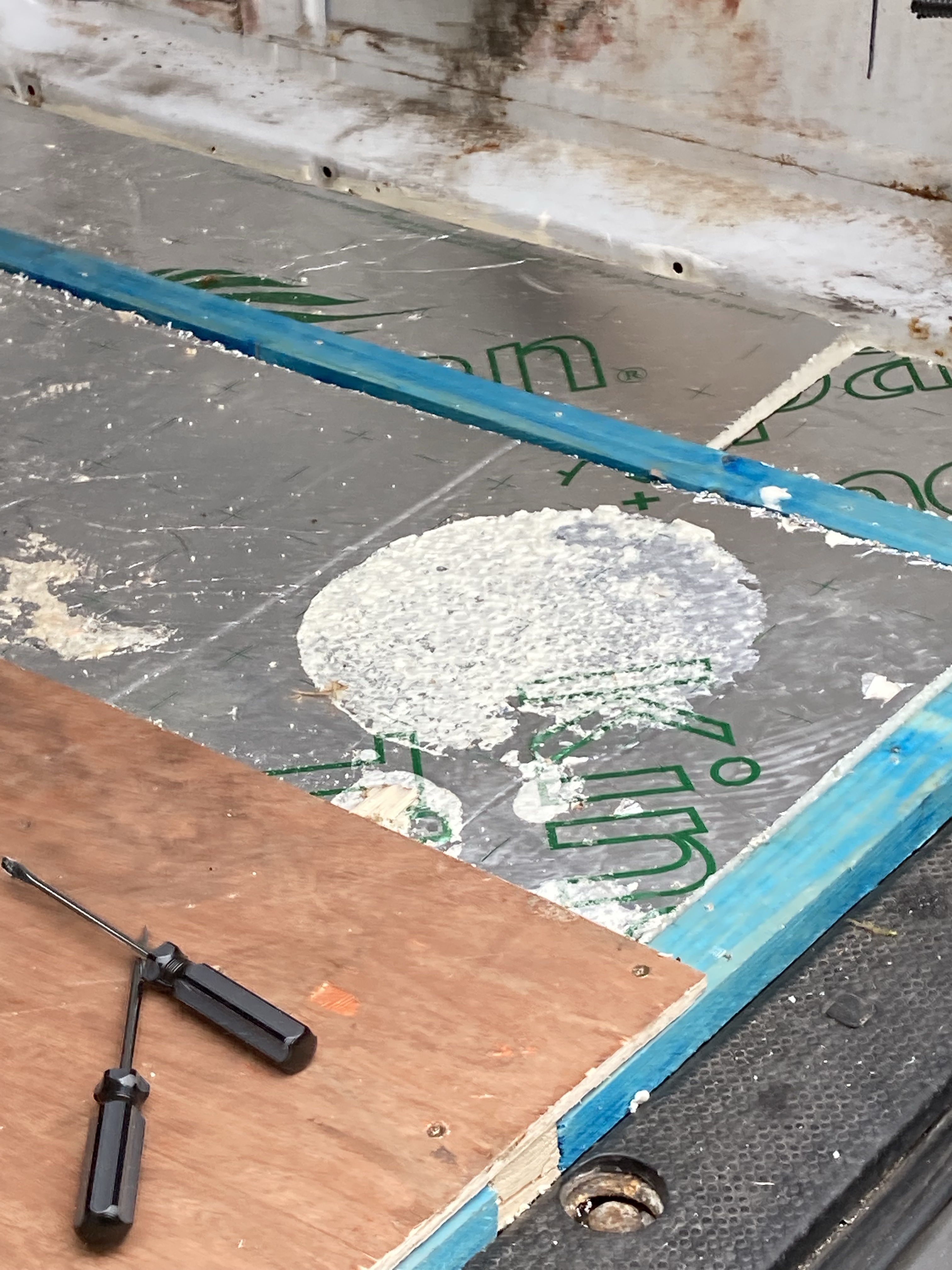 This was not an easy job. The batons and insulation were glued to the floor and we had make sure everything was up and the silicone and foam scraped away. We were so glad we did pull it up as there were holes and rust everywhere.