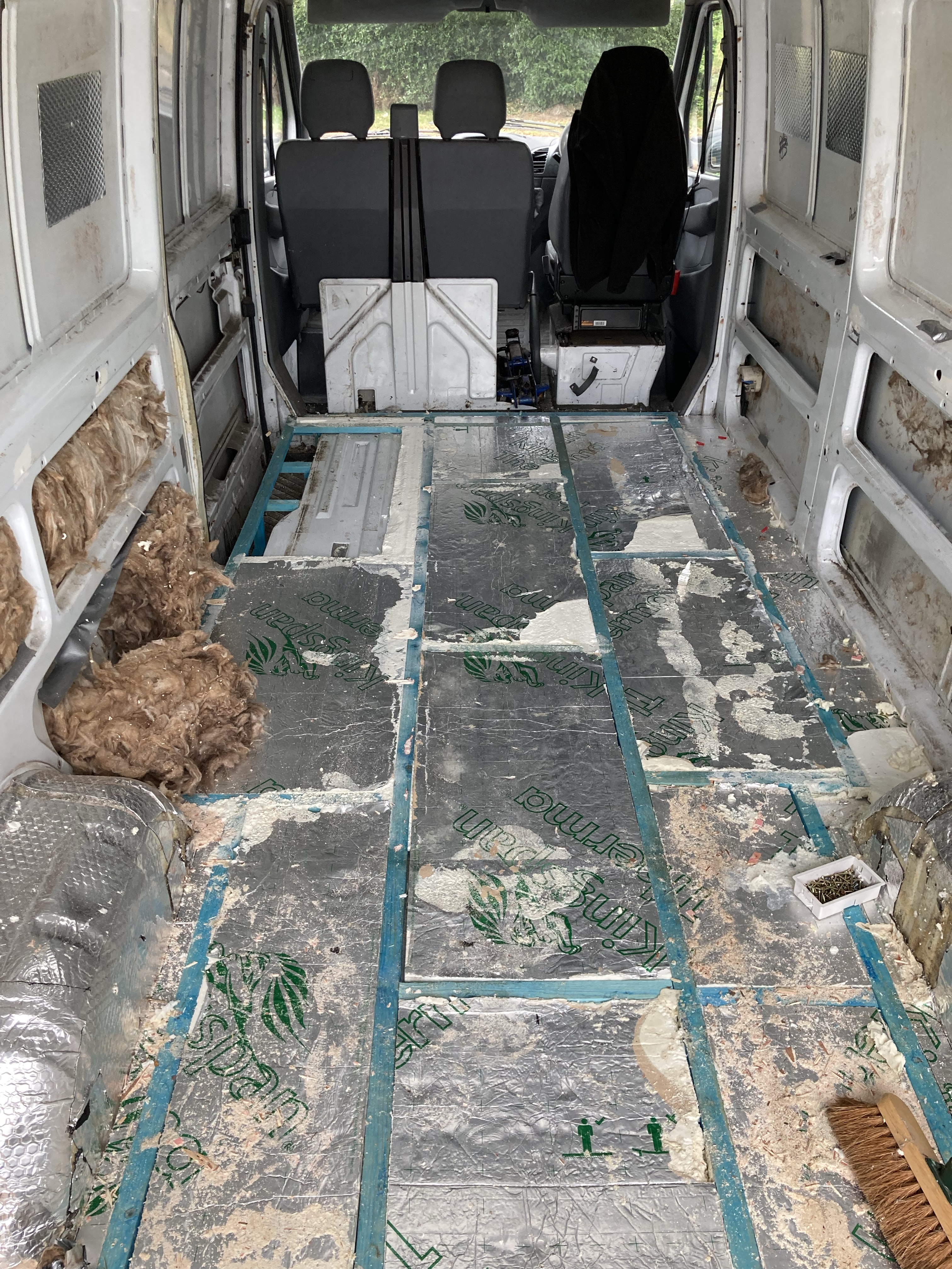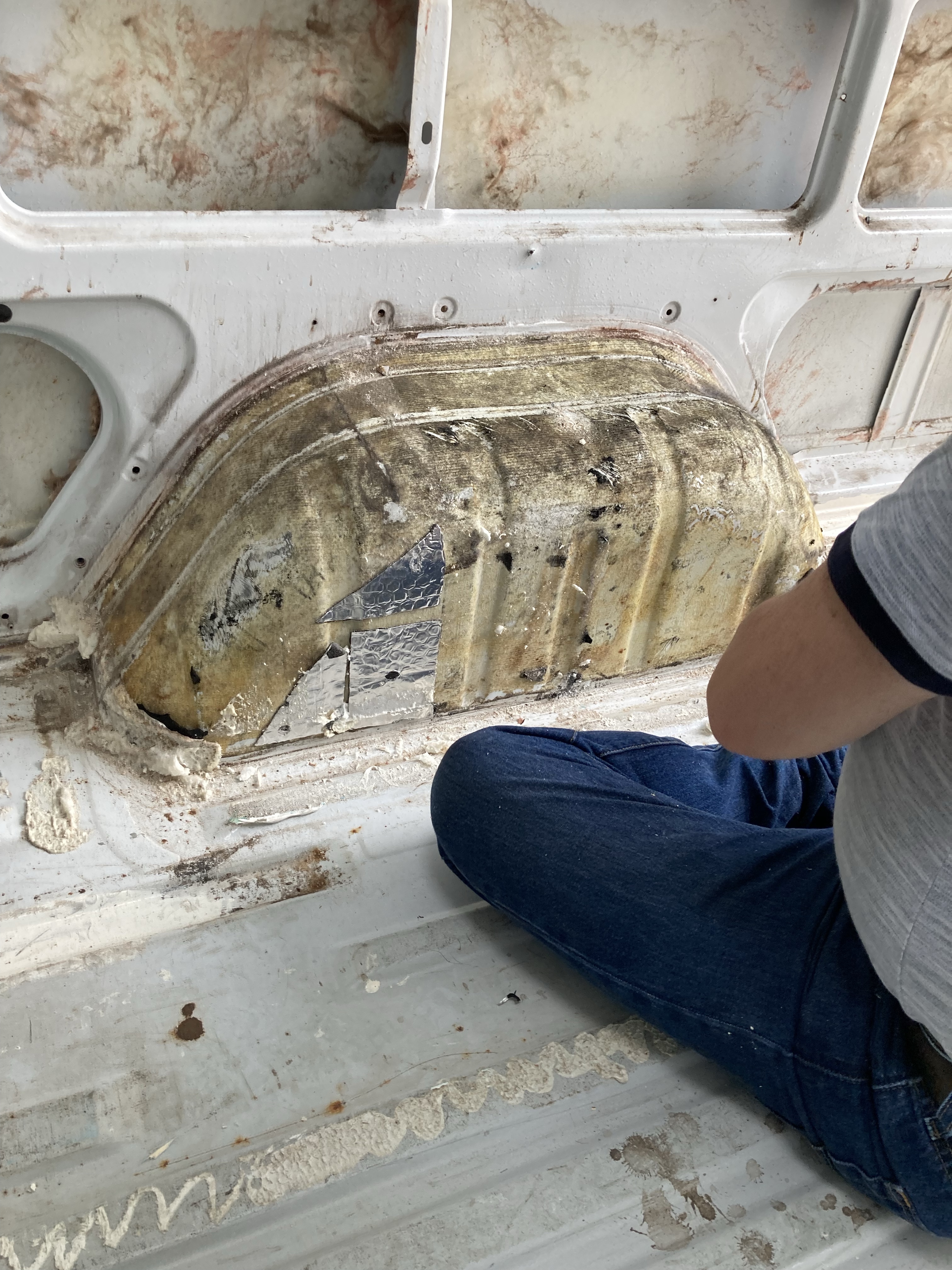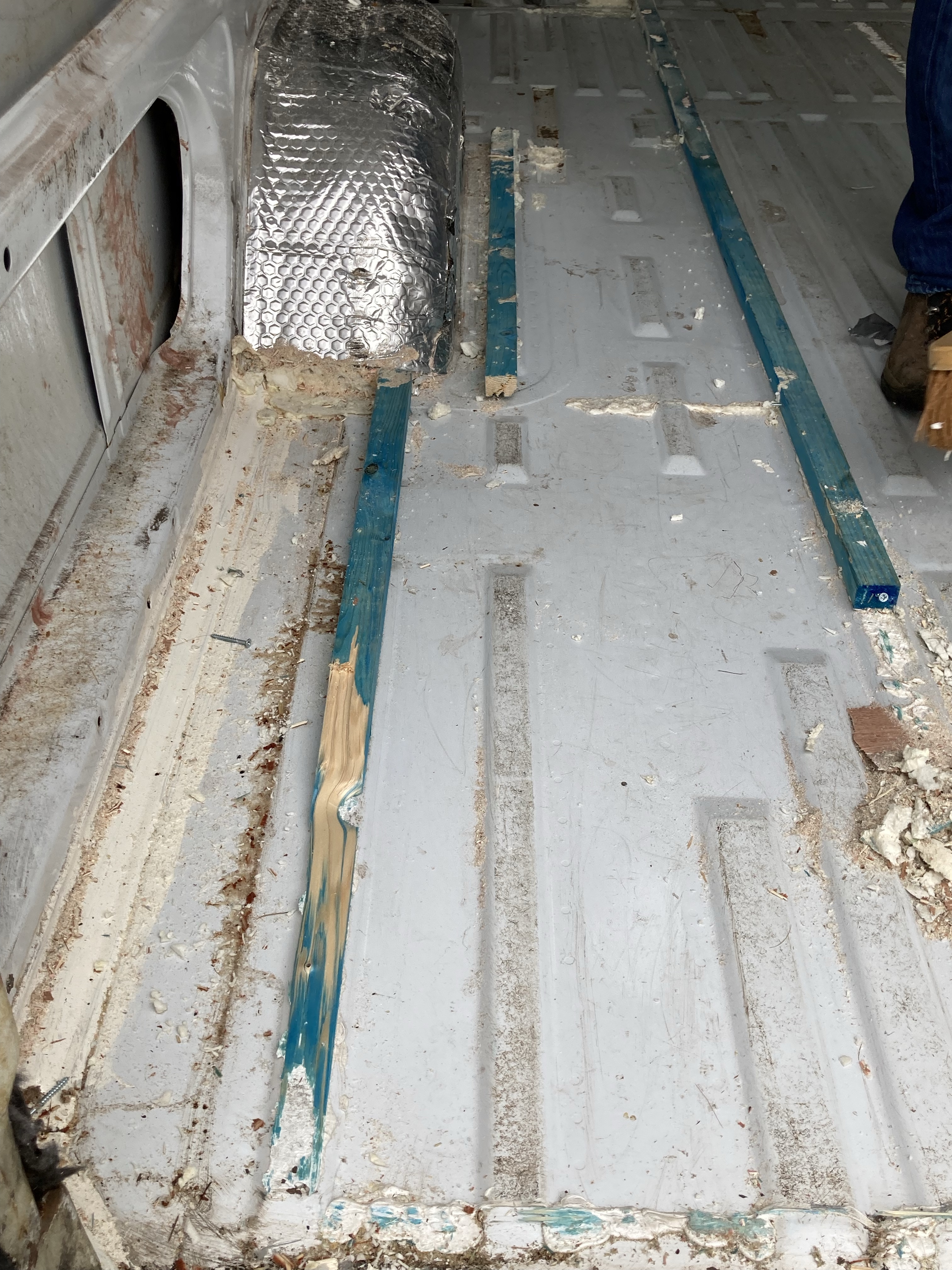 This was not an easy job. The batons and insulation were glued to the floor and we had make sure everything was up and the silicone and foam scraped away. We were so glad we did pull it up as there were holes and rust everywhere.