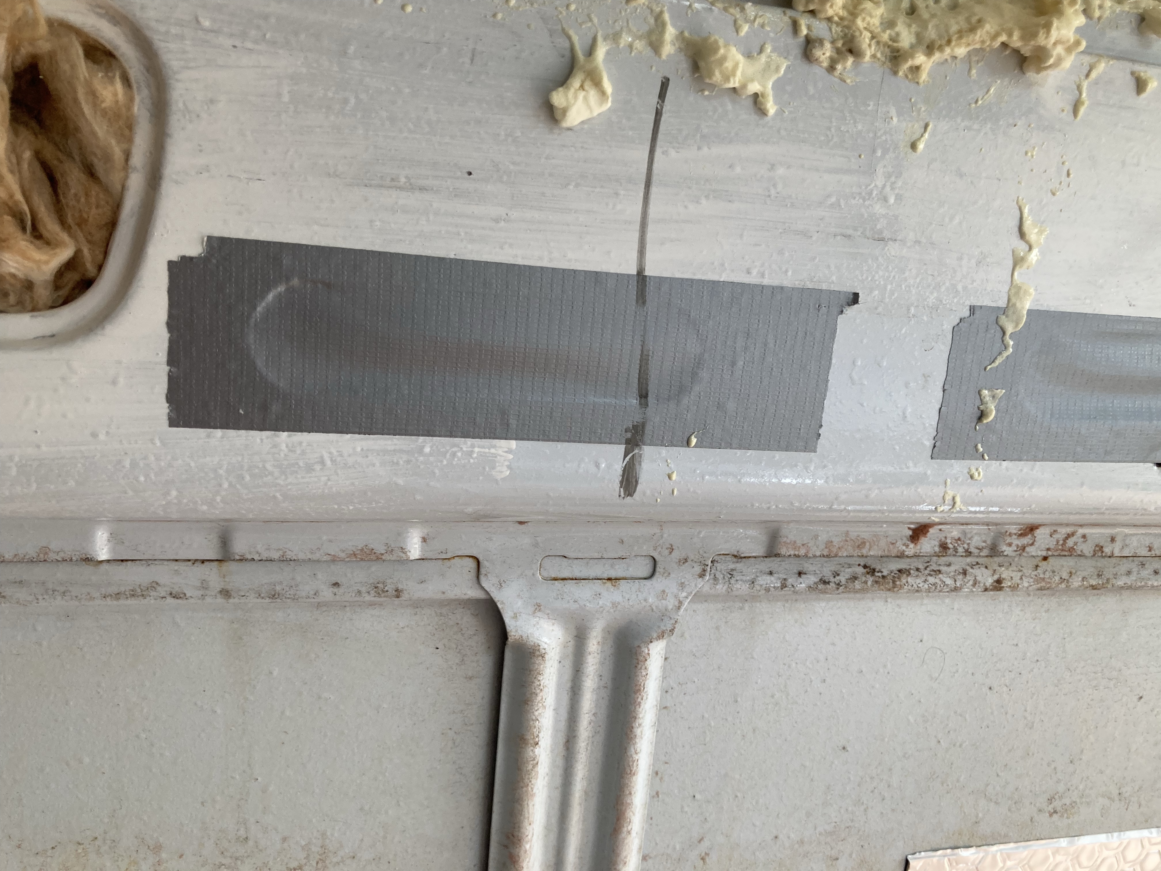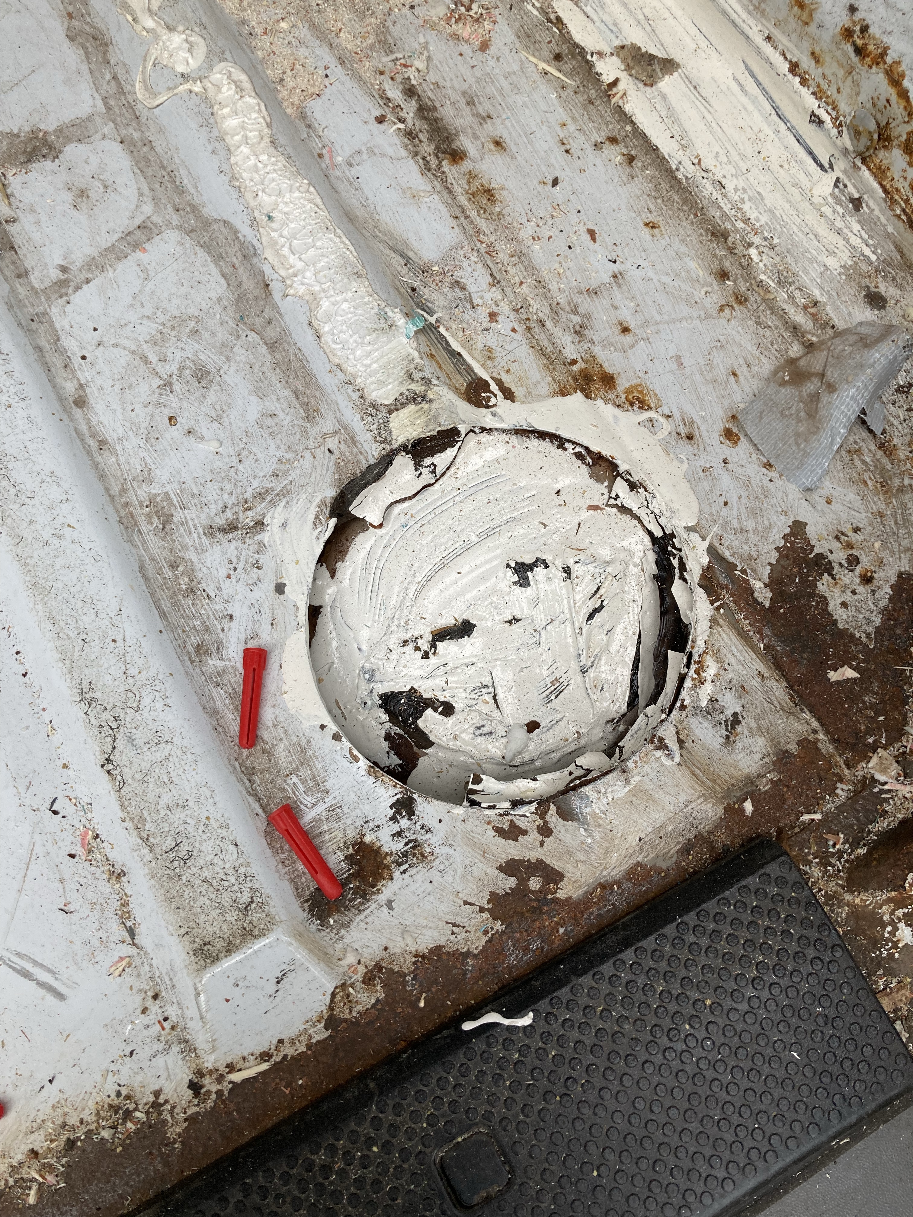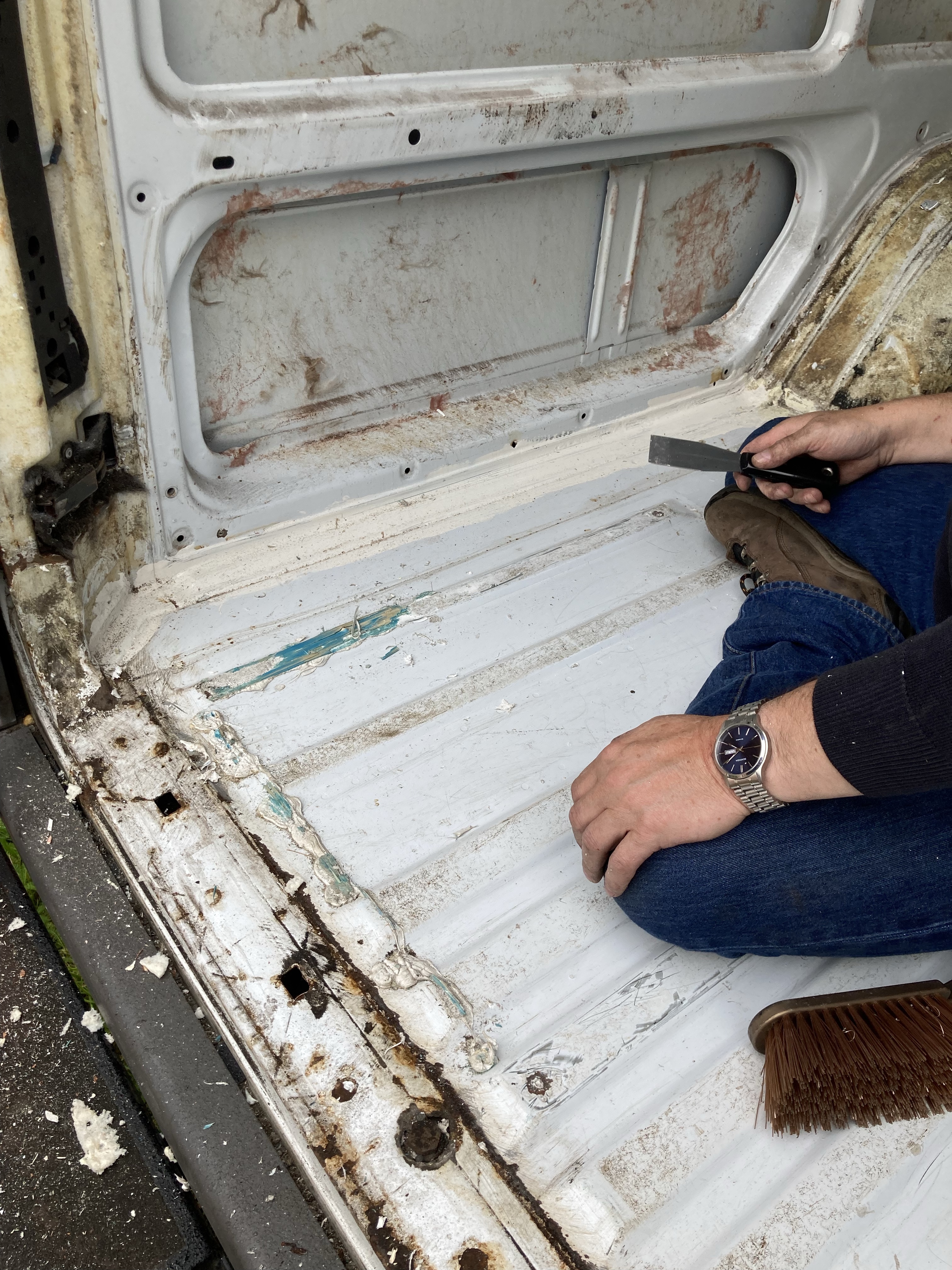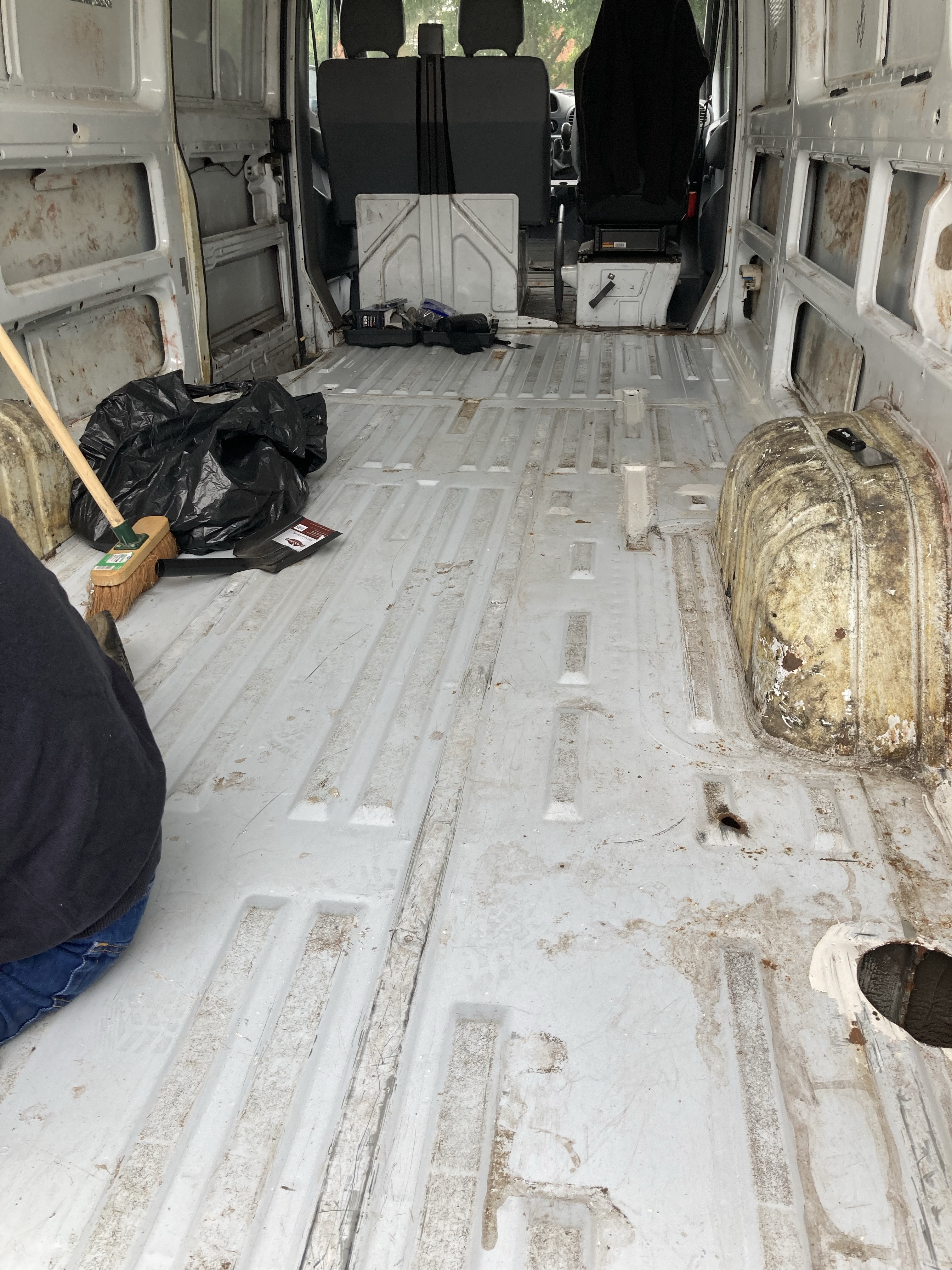 This was not an easy job. The batons and insulation were glued to the floor and we had make sure everything was up and the silicone and foam scraped away. We were so glad we did pull it up as there were holes and rust everywhere.