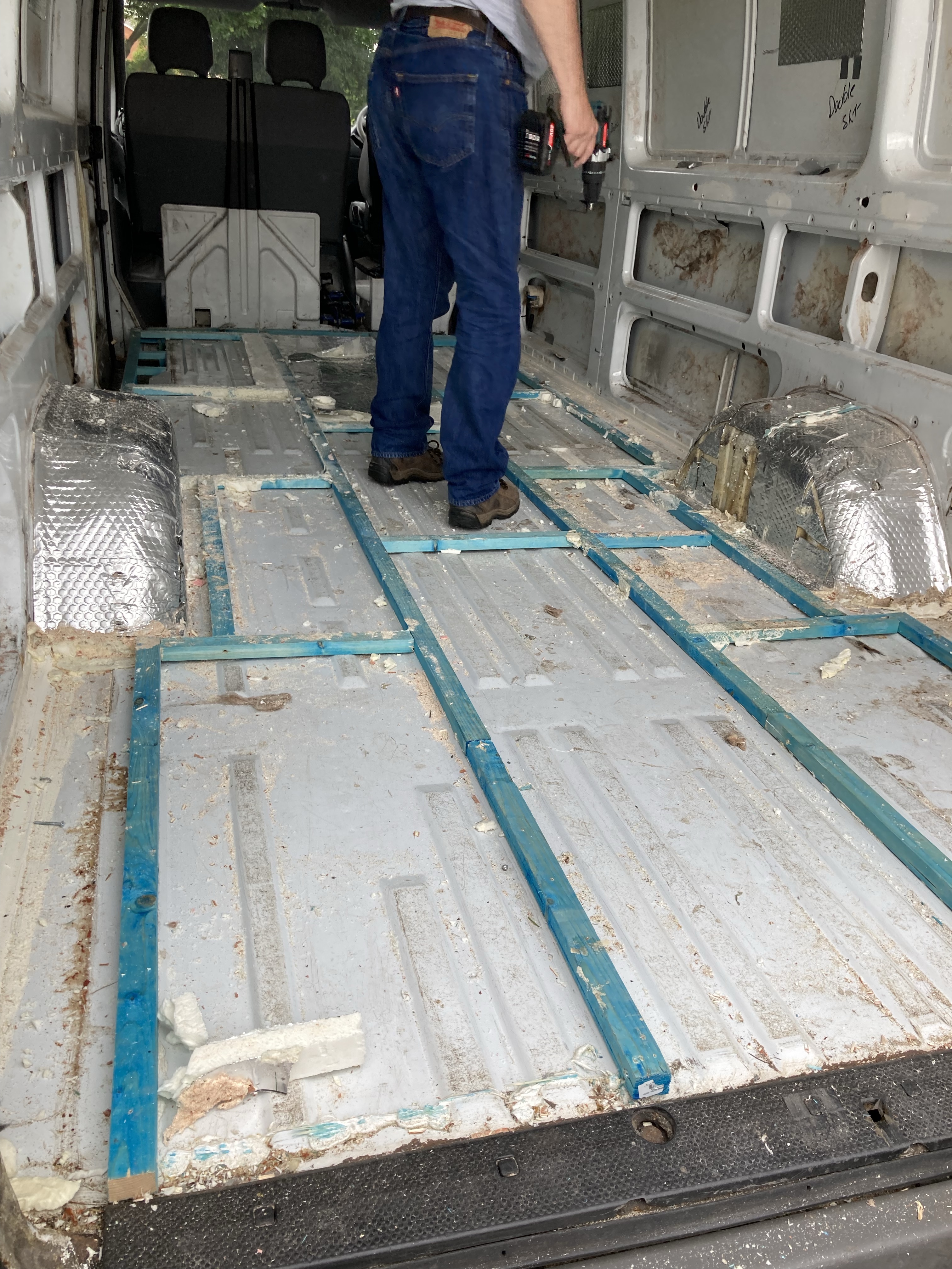 We also noticed that water was leaking in from the sky light and from the doors, so it made us worry about the floor. So we made the decision to strip the whole van back to its bones and pull the floor up.