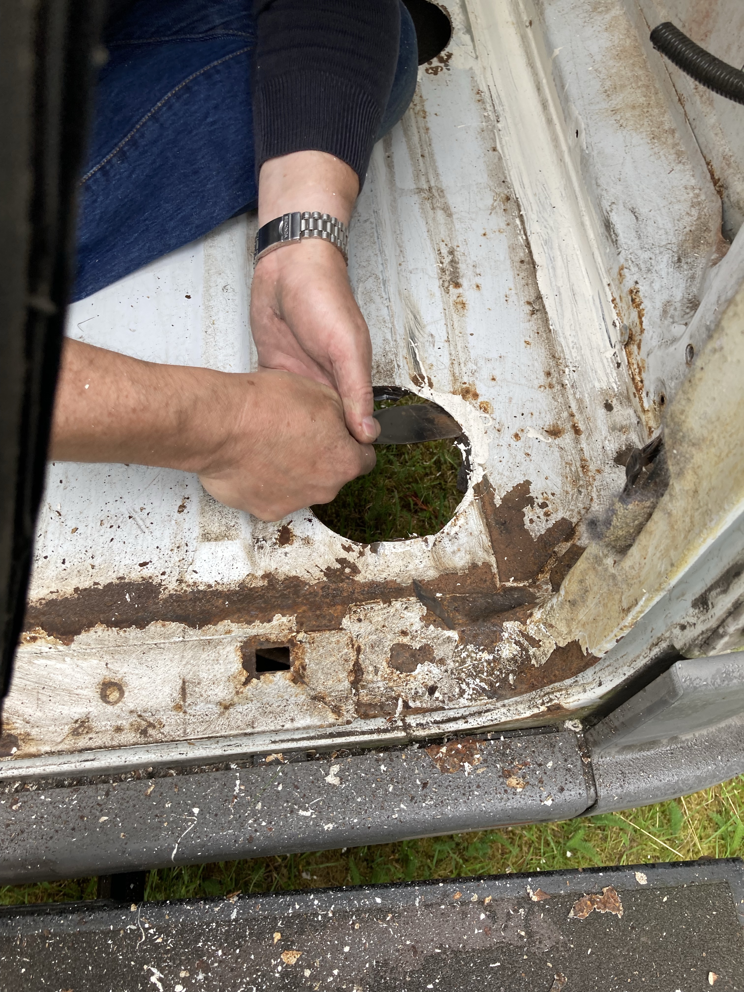 Today we bought an angle grinder to go over all the rust on the floor. Tony had a fun time with that and then went over the harder to reach places with wire wool.