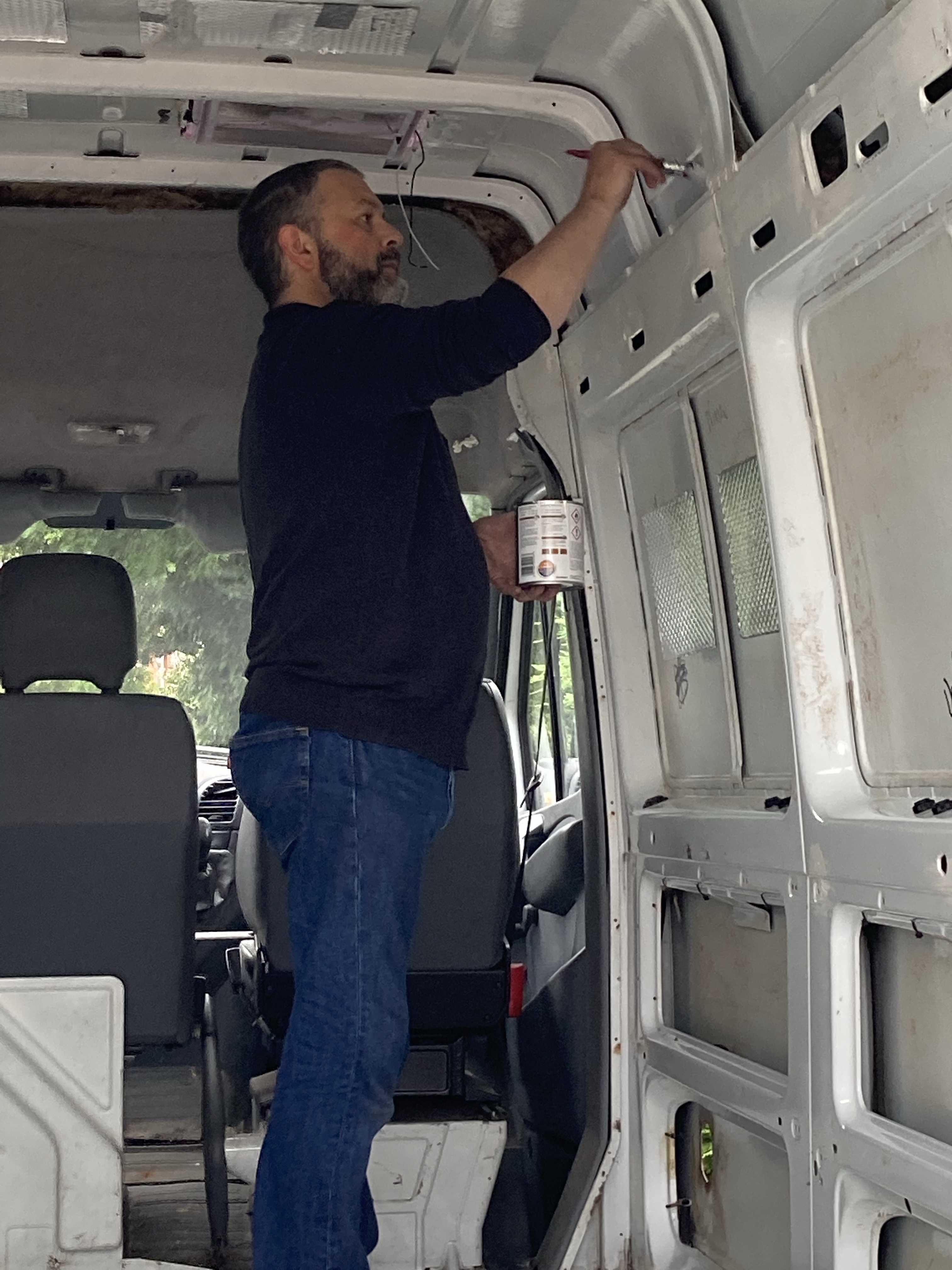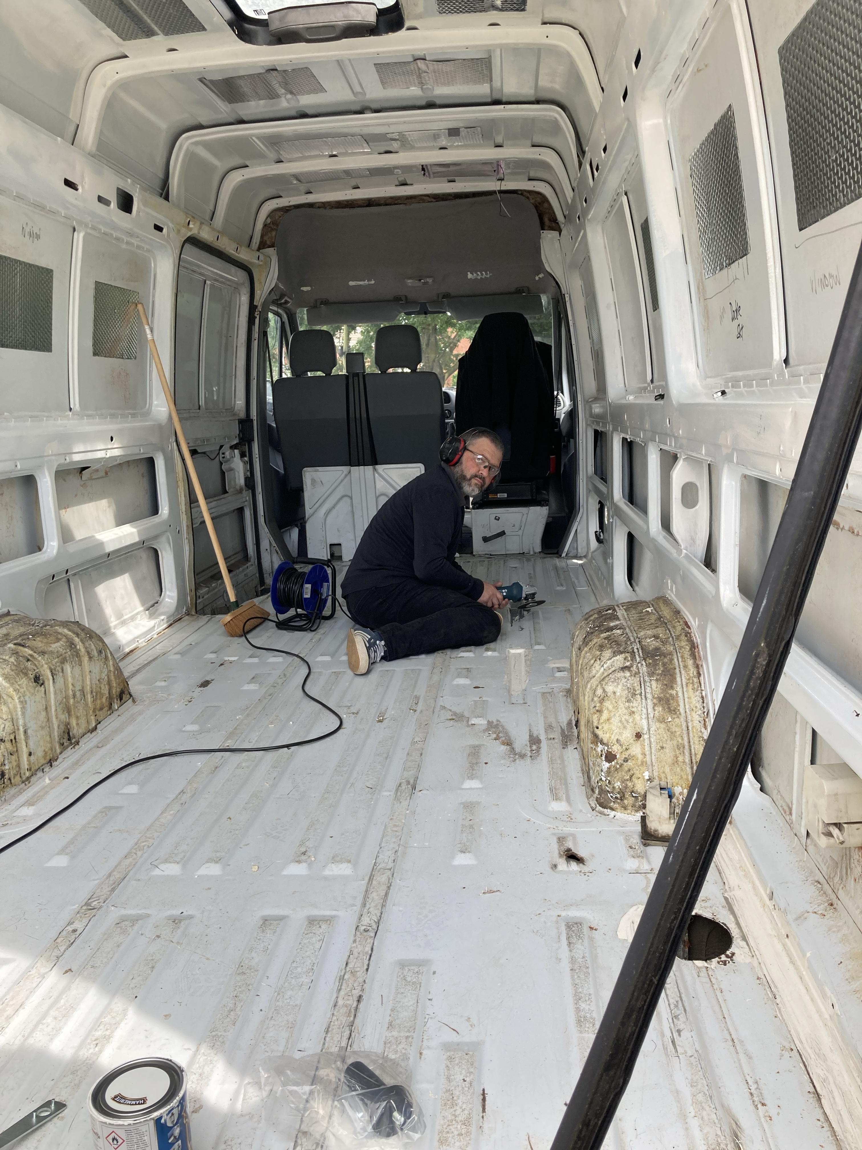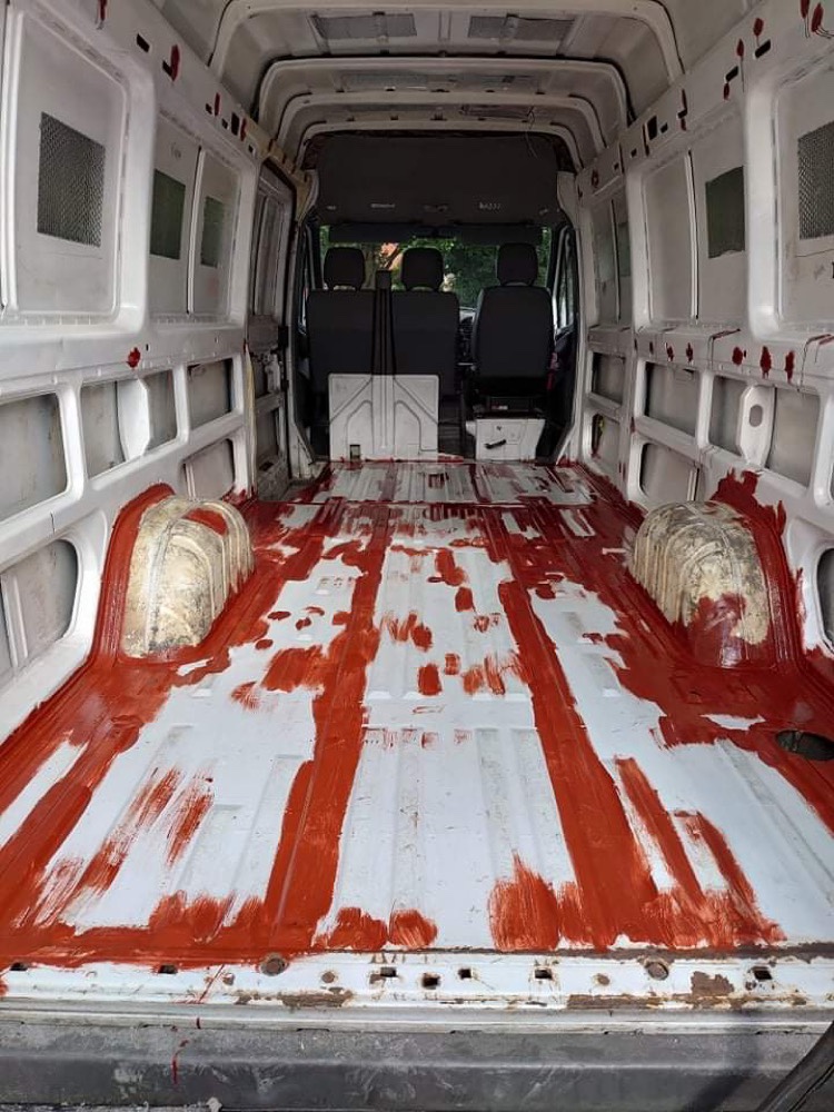 We then completely cleaned down the van, and painted over the sides and ceiling with Hammerite paint over the places with exposed metal.