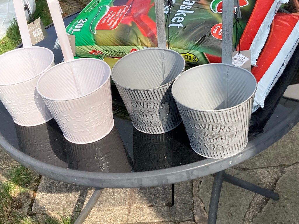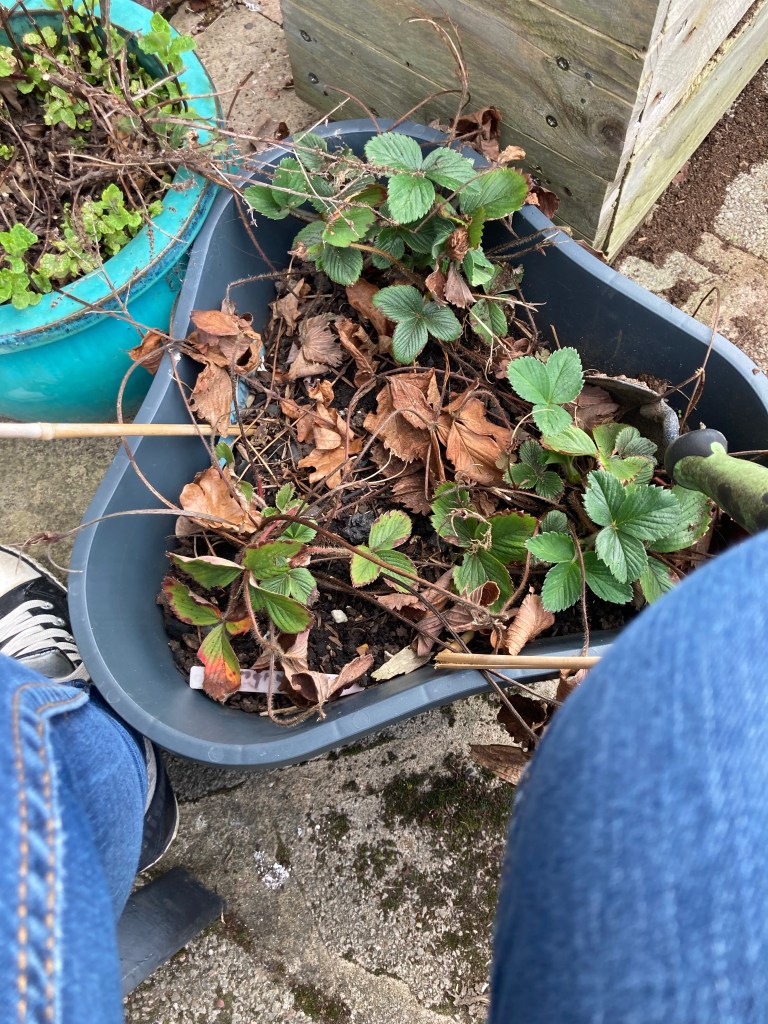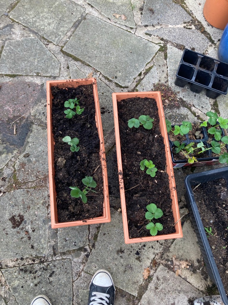 We took a visit to my sisters land where she keeps her horses and got a few bags of horse poop to put on the strawberries and rhubarb and a few other plants. I tidied up the strawberry plants, taking out the dead leaves and shoots and added some of the manure and some fresh compost. I also bought some new strawberry plants that were on sale at Lidl and found them some new homes in some pots and in some hanging pots that I bought from B&M that fit onto the fence.
