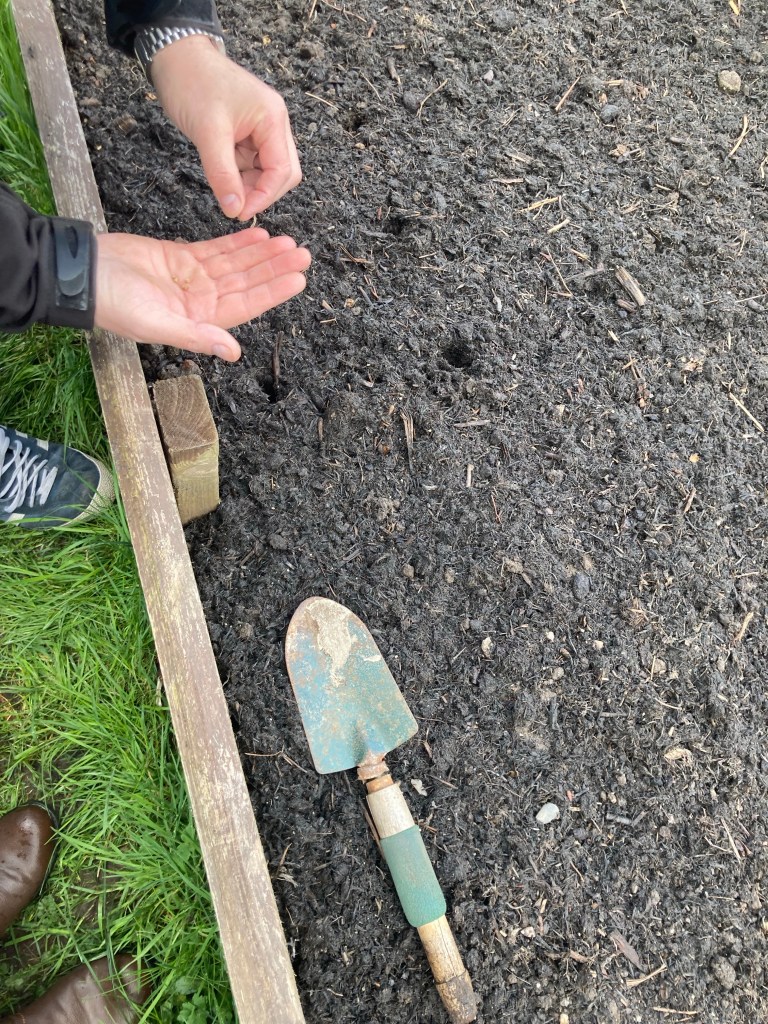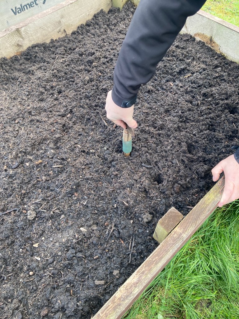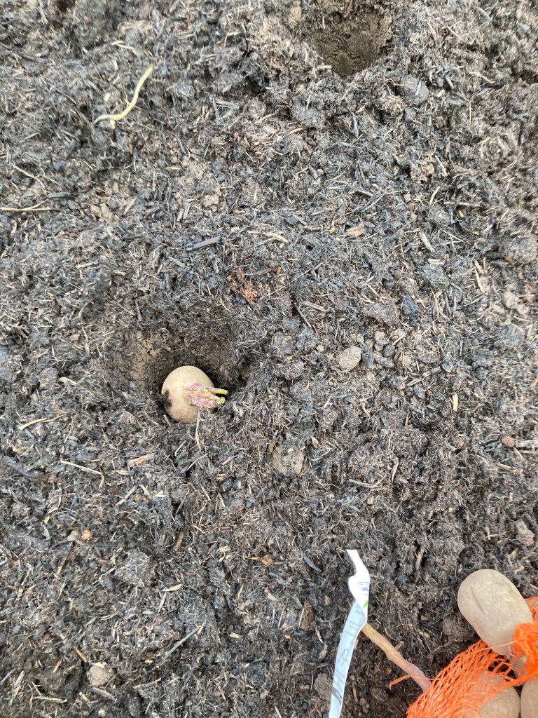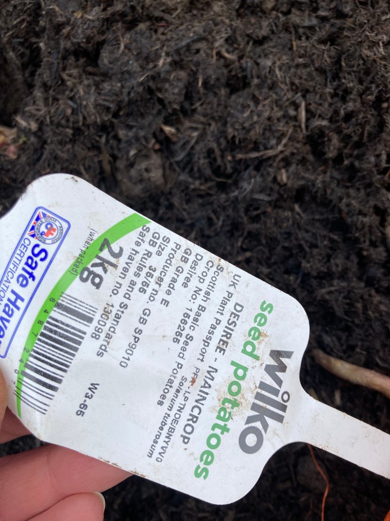 We have finally sowed the seeds for this year, and the first lot of seed potatoes have been put in the raised beds. First we put a nice fresh layer of compost on all the beds making sure they were all still weed free before we started. We tried a different way of doing the potatoes this year. instead of the mounds we have done prevously, we made a hole and popped the seed potatoes in and covered them over.