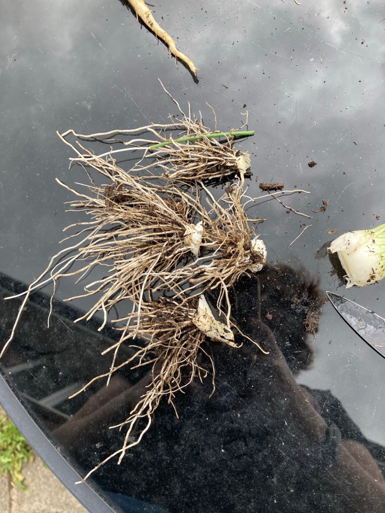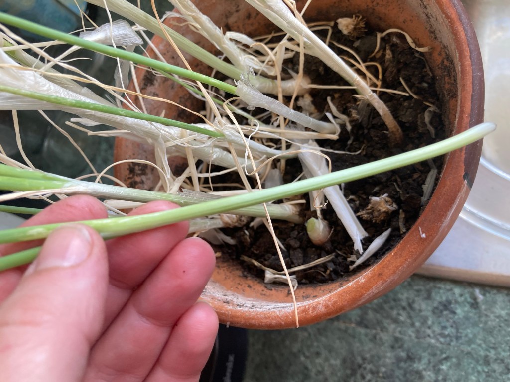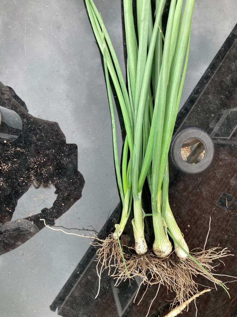 We pulled the spring onions, then cut the roots off and replanted them, that’s the bonus of growing spring onions, they will just keep growing.