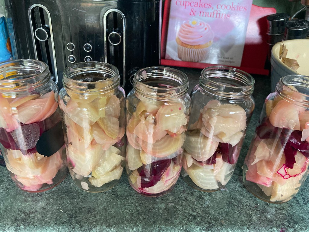 This year we chose to plant a mixed colour beetroot. We got some white, red and only one of the deep purple. We pulled them all and cooked them ready to be sliced and pickled. Once they were sliced and in clean jars, I put the vinegar mixture over them and they are now ready to be put in the water bath. The white ones looked really weird like fish once cut but we’ll try and look past that and eat them anyway.